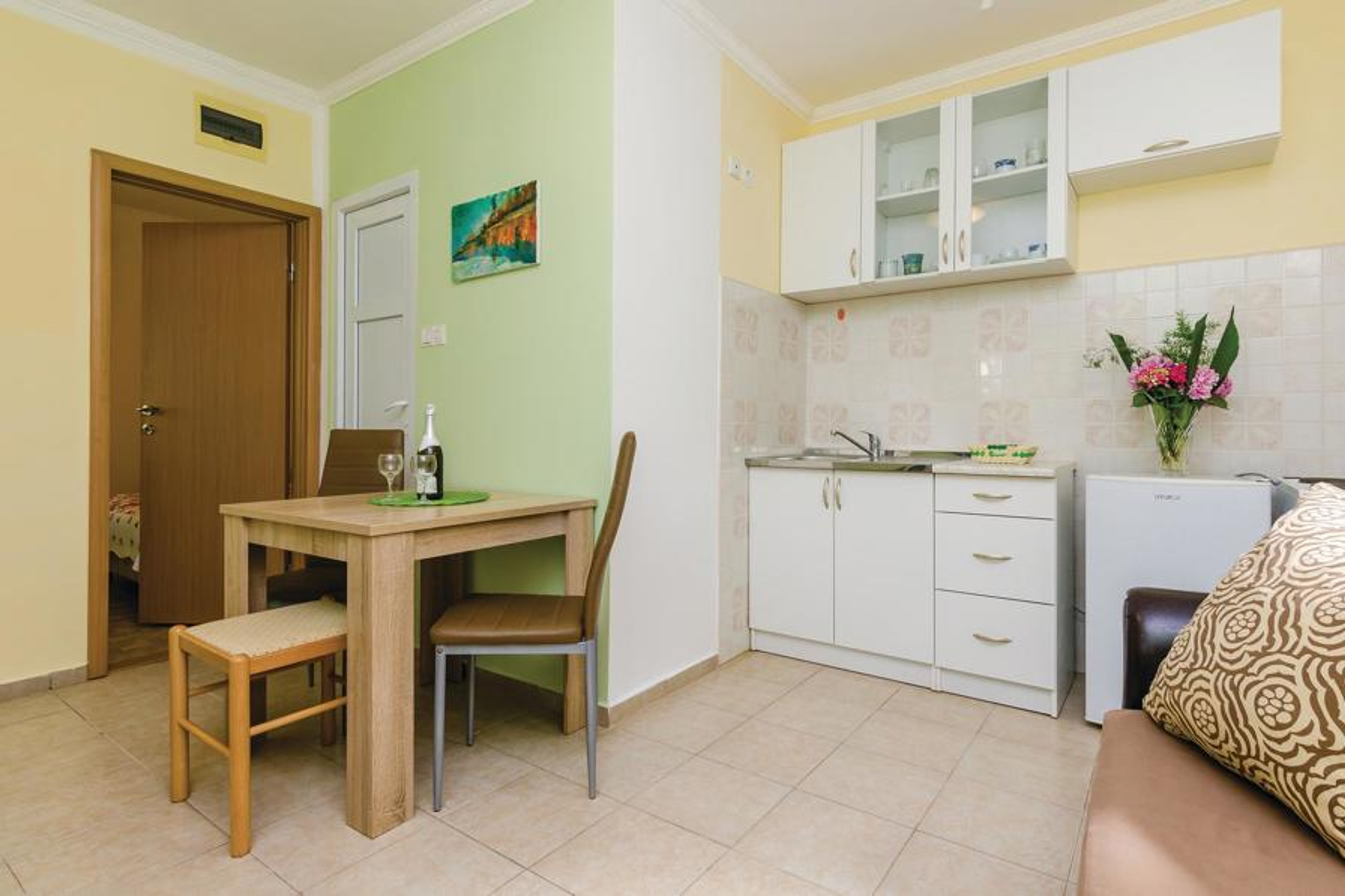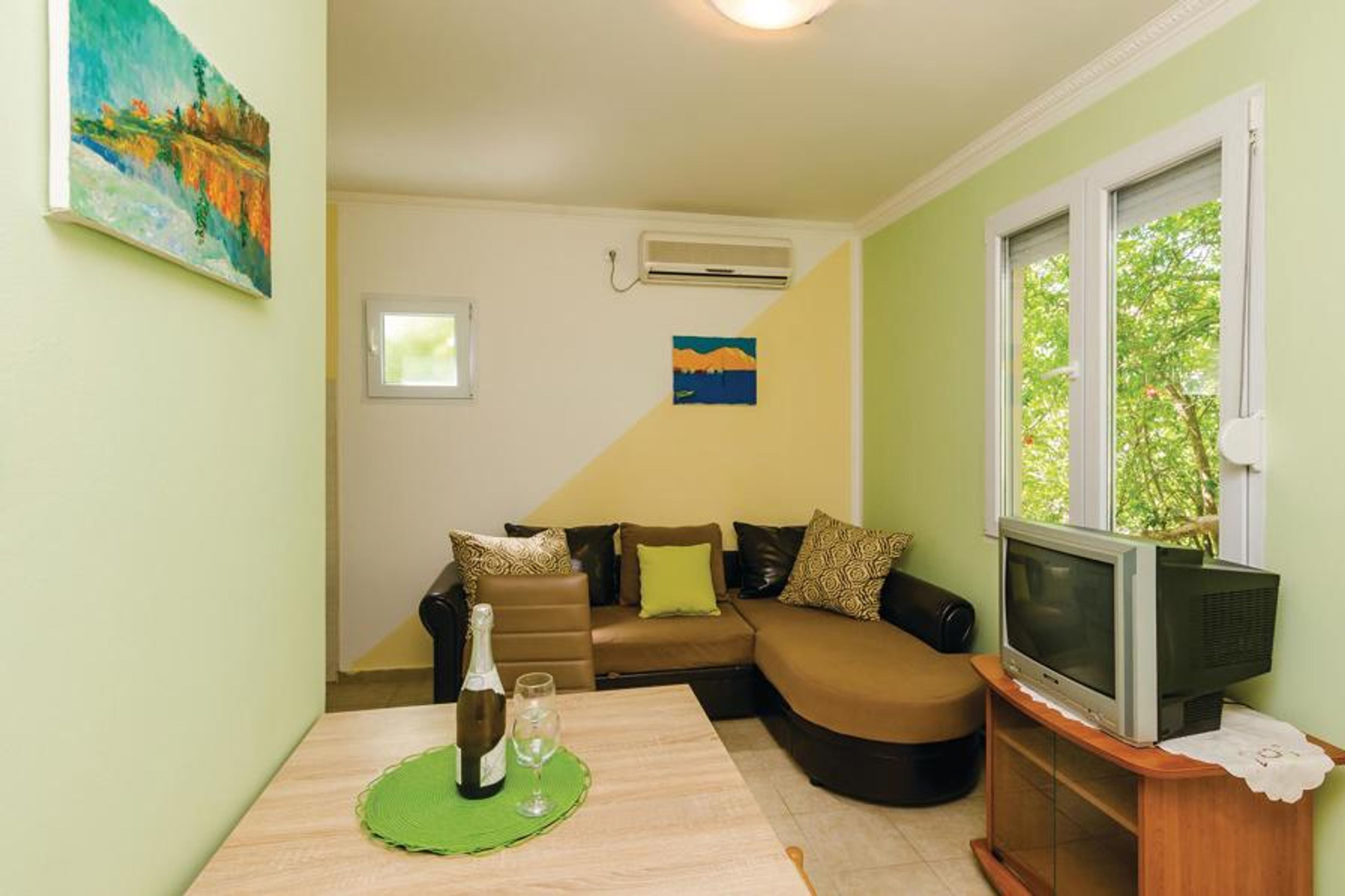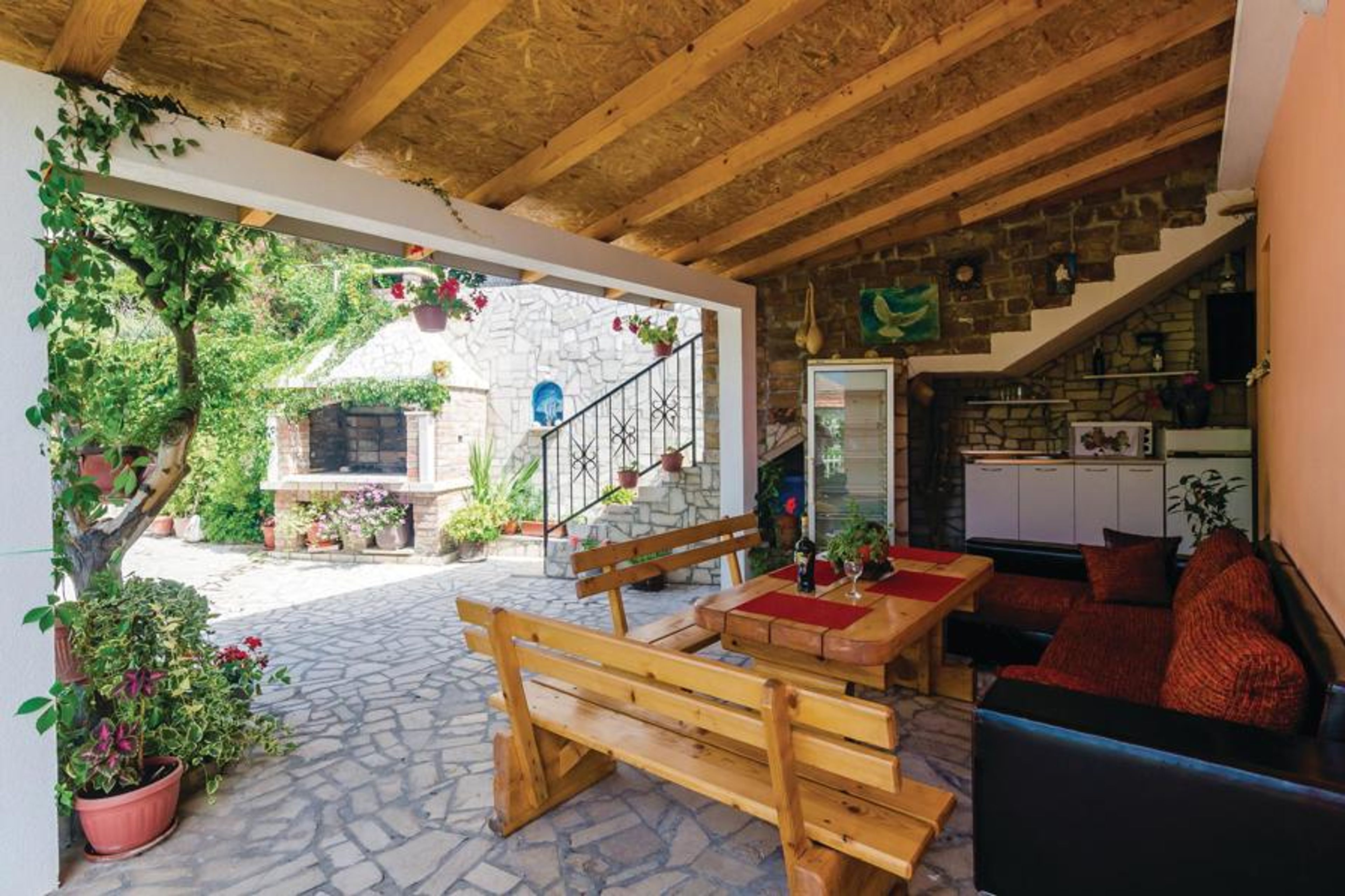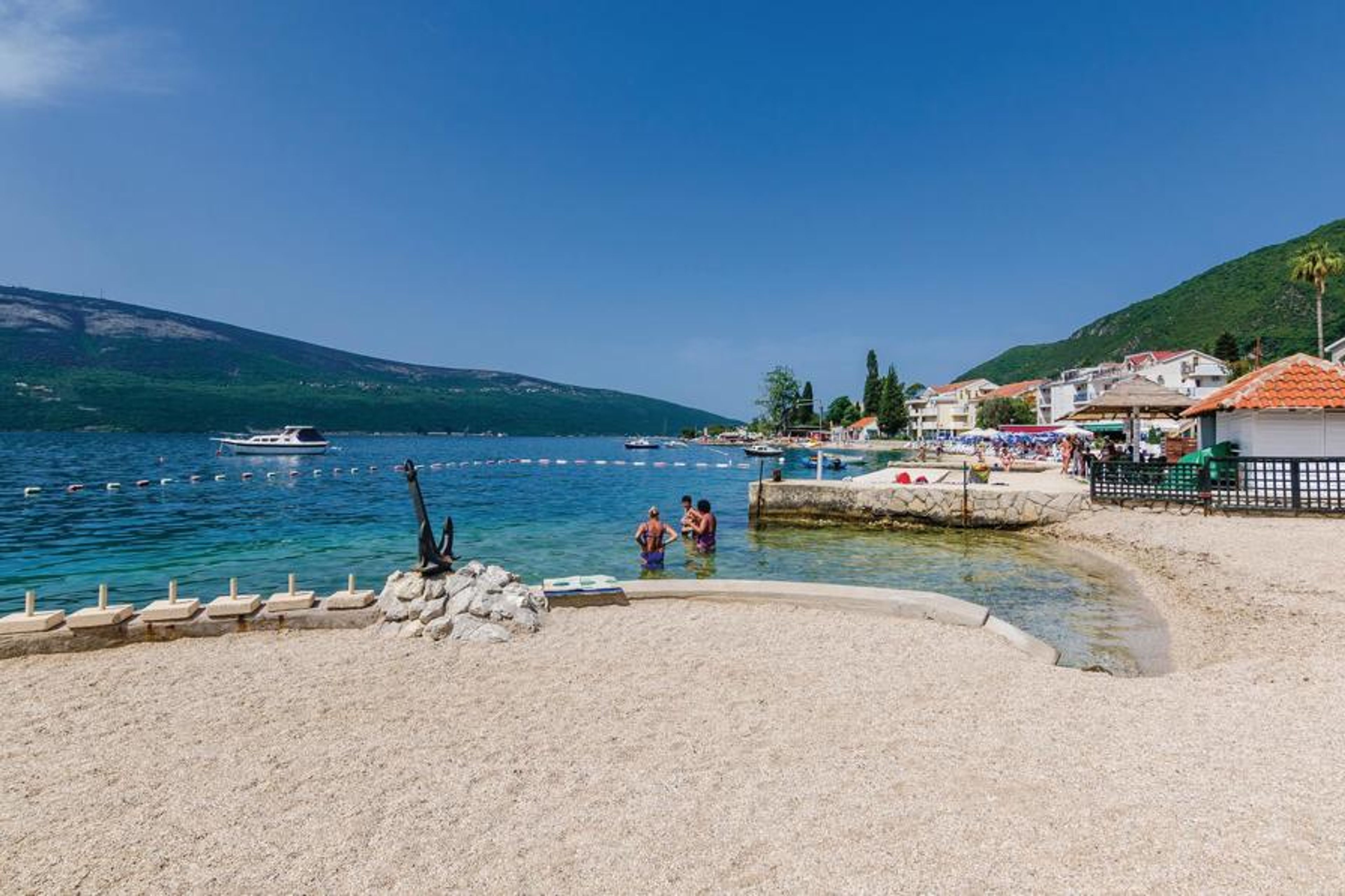 In the small fishing village of Baoii, 12 km from Herceg Novi, you will find this functionally furnished holiday home, which is ideal for a couple. Baoii is a destination with beautiful nature and small sandy and pebble beaches, ideal for couples who want to spend a holiday away from the tourist crowds. The outdoor area with barbecue, large dining table and TV is shared with the guests of the holiday apartments MNH217 and MNH218 on the same property. This property is surrounded by beautiful nature and a stream. Tivat airport is 20 km away and the Croatian airport ilipi 40 km.