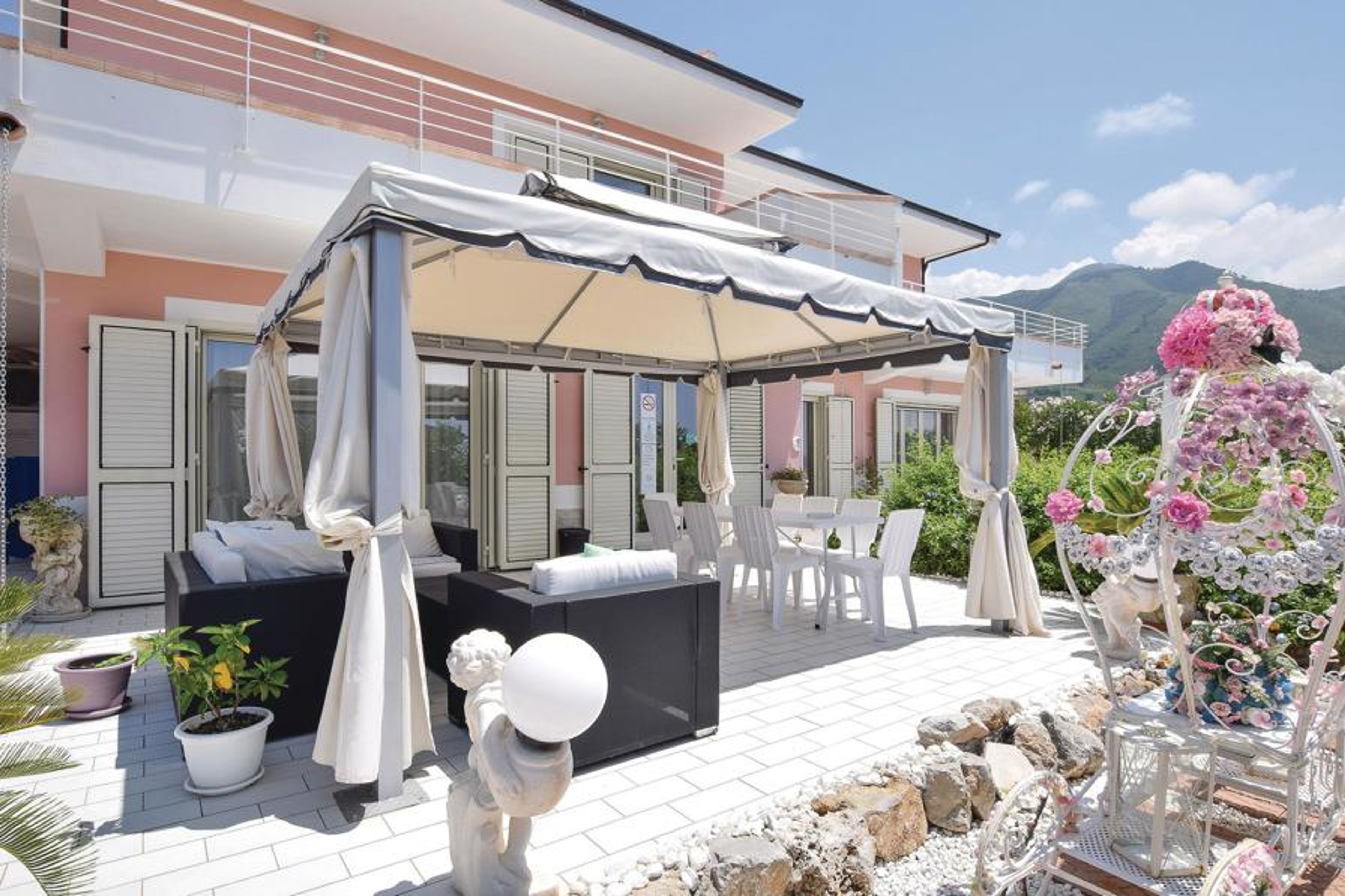 Guests of this beautiful semi-detached house near Tortora Marina (province of Cosenza) enjoy 2 swimming pools: a communal inground pool and a non-inground pool (6 x 3 m) for exclusive use. The property is located in a panoramic position, in the splendid surroundings of the Riviera dei Cedri and one side of the house faces the sea. It is the perfect solution for a relaxing vacation away from the urban chaos although the beautiful beaches and lively resorts of the area are nearby. The first floor consists of a large living area with living room, kitchen and 2 bedrooms with bathroom. On the second floor there are 2 bathrooms and 3 bedrooms, one of which has 4 beds, and a magnificent terrace with panoramic sea views, equipped with hydro-massage (4 people). On the 2nd floor you have 1 bedroom, 1 bathroom and a panoramic solarium terrace, ideal for relaxing in complete privacy. In the garden area reserved for you, there is a pool not embedded in the ground and a fitness area with some equipment, while the pool shared with the owner is located on the other side of the house. An outdoor shower, gazebo, sun loungers and barbecue are also at your disposal to organize convivial barbecues with family or friends. The accommodation is particularly suitable for families with children or groups of friends spending their vacations together, and your four-legged friend is also welcome here! The famous resorts of Praia a Mare (3 km) and Maratea (14 km) can be quickly reached from here. The historic center of Tortora will enchant you with its atmosphere, its stone portals and its picturesque houses. For lovers of mountains and nature excursions, the beautiful Pollino National Park awaits you. All services are nearby.