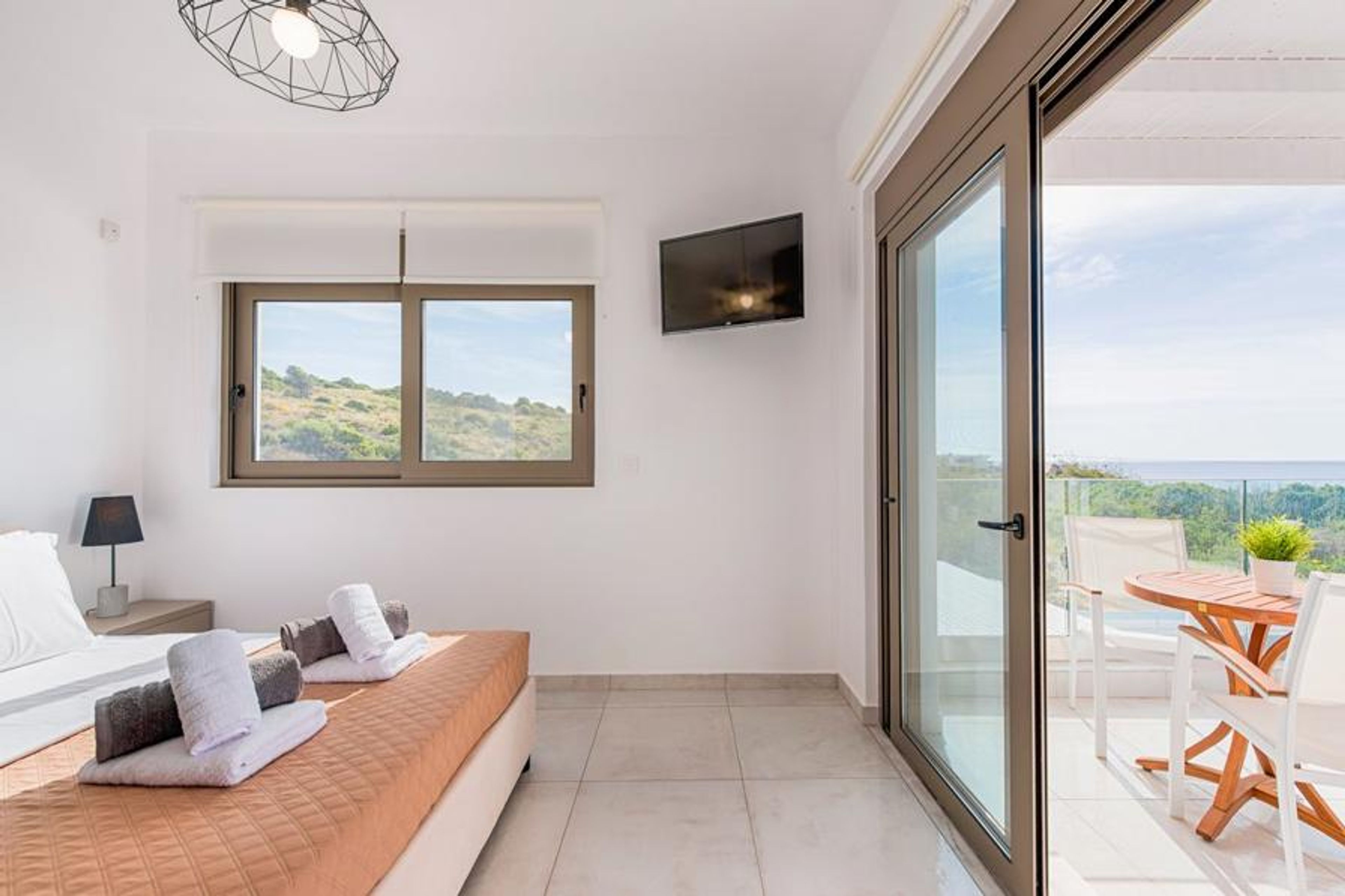Ensuite bathrooms at this villa are a lovely highlight in terms of design. Chic swirly marble tiles are offset with white and silver fixtures. All bathrooms have luxurious showers, and one even has a hot tub inside - so the lucky guests in this room can have their very own spa getaway!Ideally placed in the picturesque area of Gennadi, in the south of Rhodes, this villa is tucked away on a hillside with a local atmosphere. Rhodes is the largest and most well known of the Dodecanese Islands - it is so alluring for visitors and enjoys 300 days of sunshine a year!