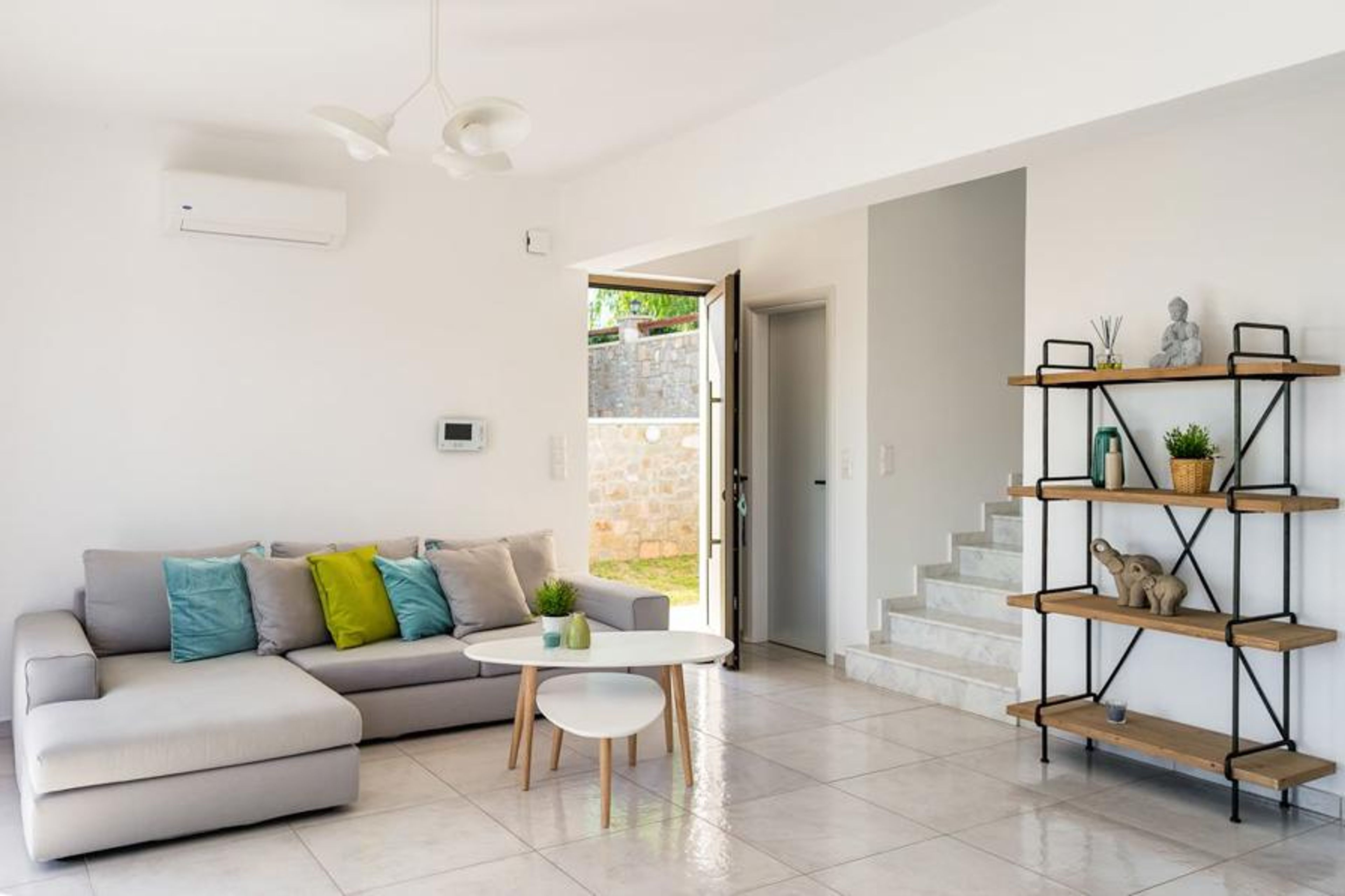 The living room is elegantly furnished with a stylish coffee table and shelves, and a dove grey sofa is peppered with blue and green sea-inspired scatter cushions. It's the perfect place for some downtime. Airy and open plan, there is also an indoor dining area by the kitchen, which is well equipped for self-caterers, including a microwave and even a dishwasher.