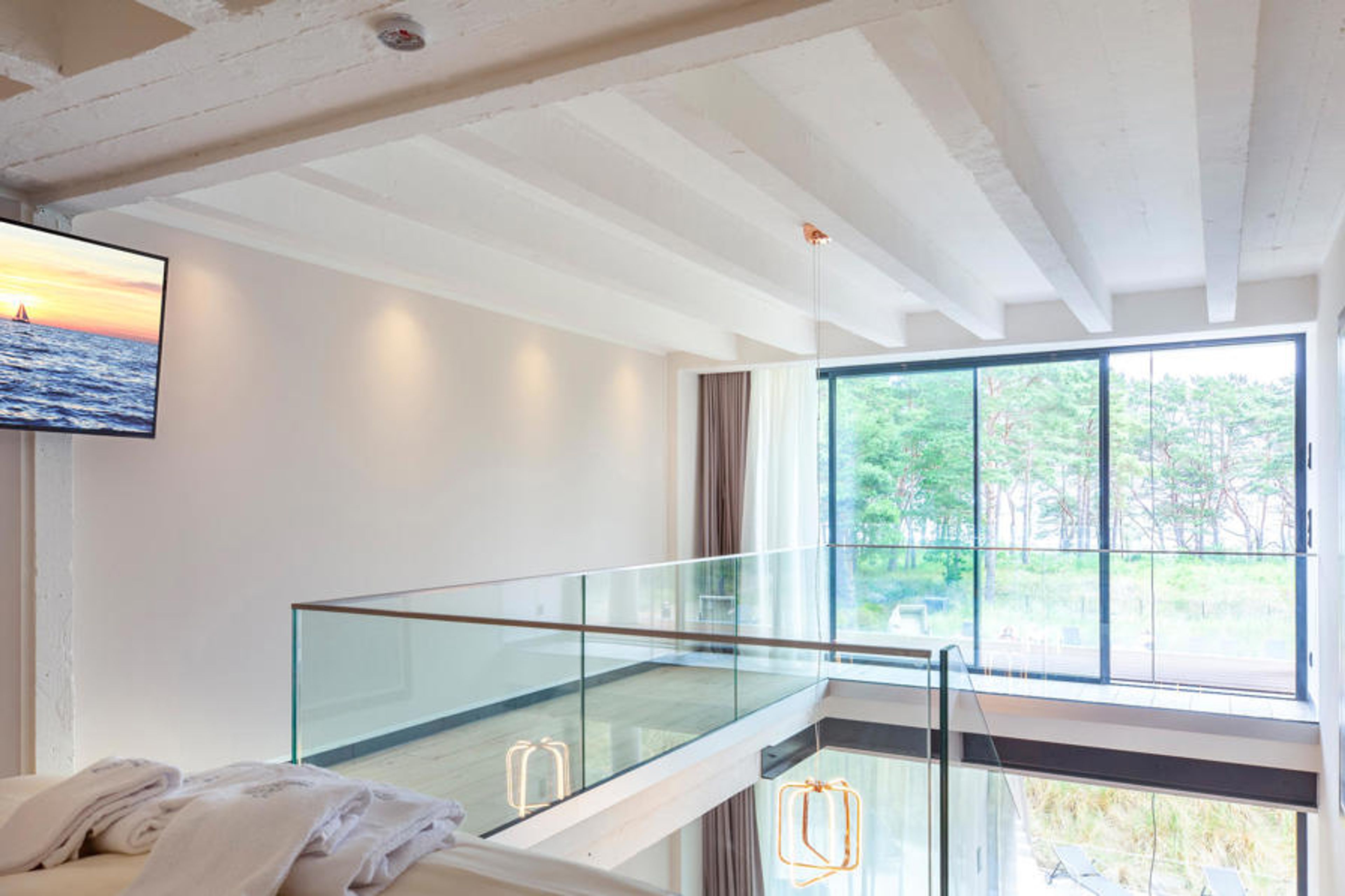 The high-quality "Avida Loft" impresses with its elegant and unusual design on two levels. The loft-like apartment is very bright and flooded with light thanks to the huge, electric panoramic windows and the design with lots of glass. All areas are interconnected, creating an open feeling of space. The open-plan sleeping and dressing area is located on the upper floor, which is accessible via a staircase. Enjoy the view of the Baltic Sea directly from your bed. The high-quality box-spring bed with very comfortable mattresses lets you start the day feeling wonderfully rested. There is another sleeping area on the sofa bed in the living area. The small pantry-kitchen has a dishwasher and a Tassimo capsule machine for coffee lovers (please bring your own capsules).