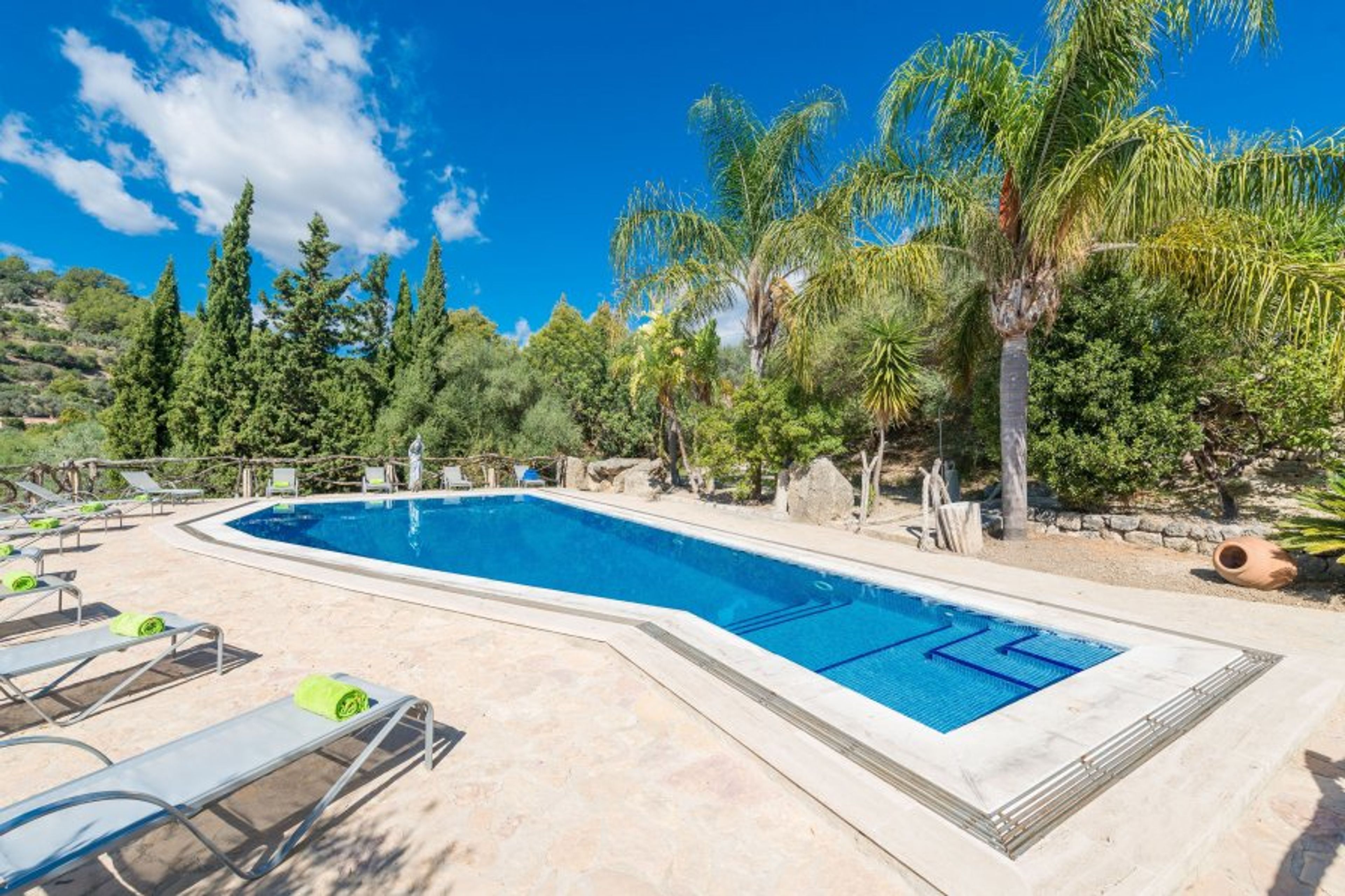 This beautiful finca, located on a rural and forest environment, is a magic place. All corners invite to admire the privileged landscape and feel the peace, specially the area of the pool where you will be able to bask in the sun on the 12 sunloungers and enjoy a nice dip. The private chlorine pool sizes 18 x 7 metres and and the water depth ranges from 0.6 to 1.7 metres. The impressive table is the best place to enjoy your meals alfresco. The property is fenced and it offers total privacy.