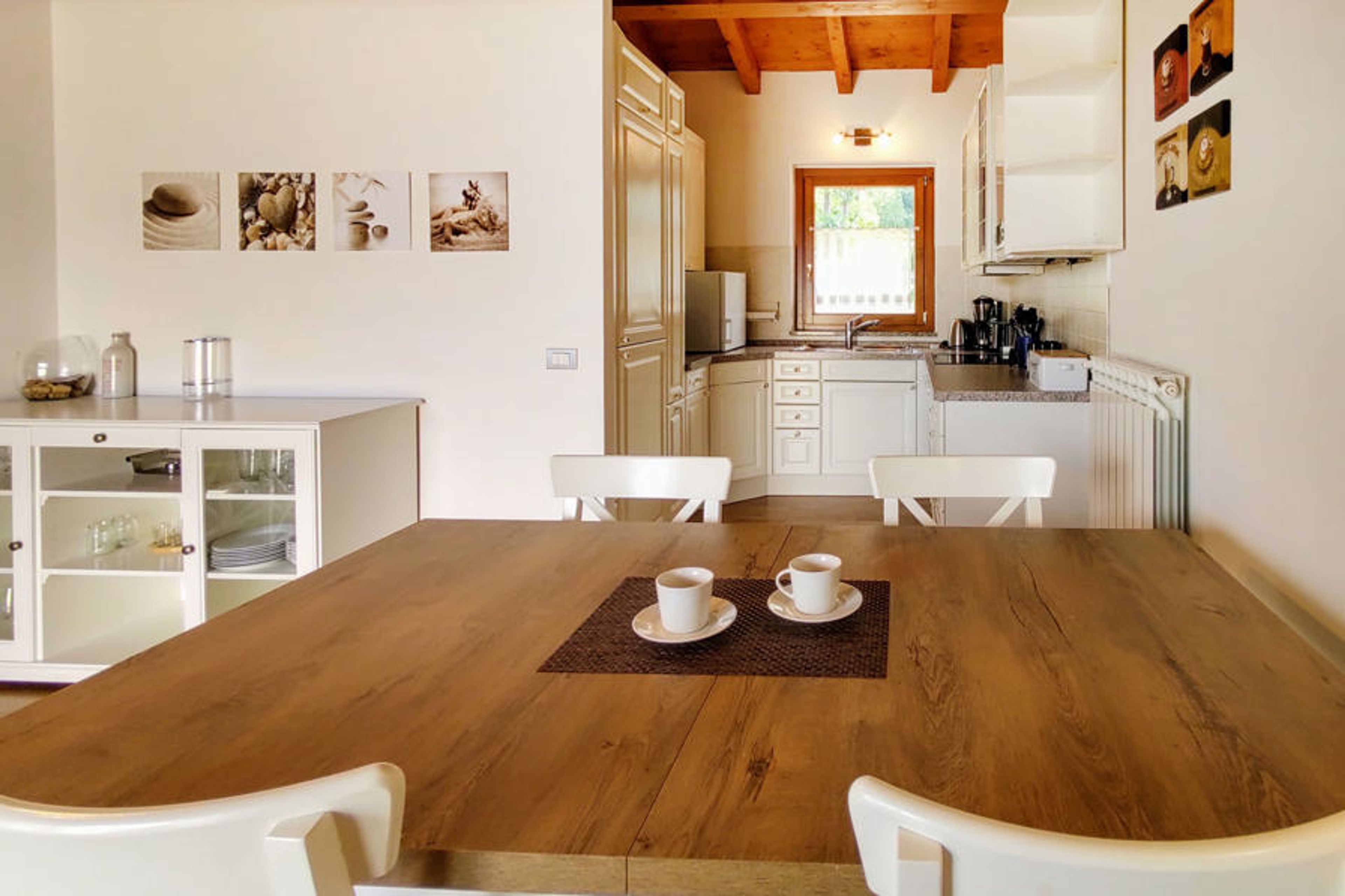 3-room apartment 75 m2, on the top floor, west facing position. Bright, partly with sloping ceilings, modern and stylish furnishings: living/dining room with dining table and satellite TV. Exit to the balcony. 1 double bedroom. Exit to the balcony. 1 room with 1 x 2 bunk beds. Exit to the balcony. Open kitchen (oven, dishwasher, 4 ceramic glass hob hotplates, toaster, kettle, microwave, electric coffee machine). Bath/WC, shower/WC. Gas heating. Parquet floors. Large balcony 30 m2, small balcony. Balcony furniture, deck chairs (2). Very beautiful view of the lake. Facilities: washing machine, children's high chair, baby cot. Internet (WiFi, free). Parking (1 car). Please note: non-smokers only. Maximum 1 small pet/ dog allowed. Private entrance. IT012114C242WP8TXP