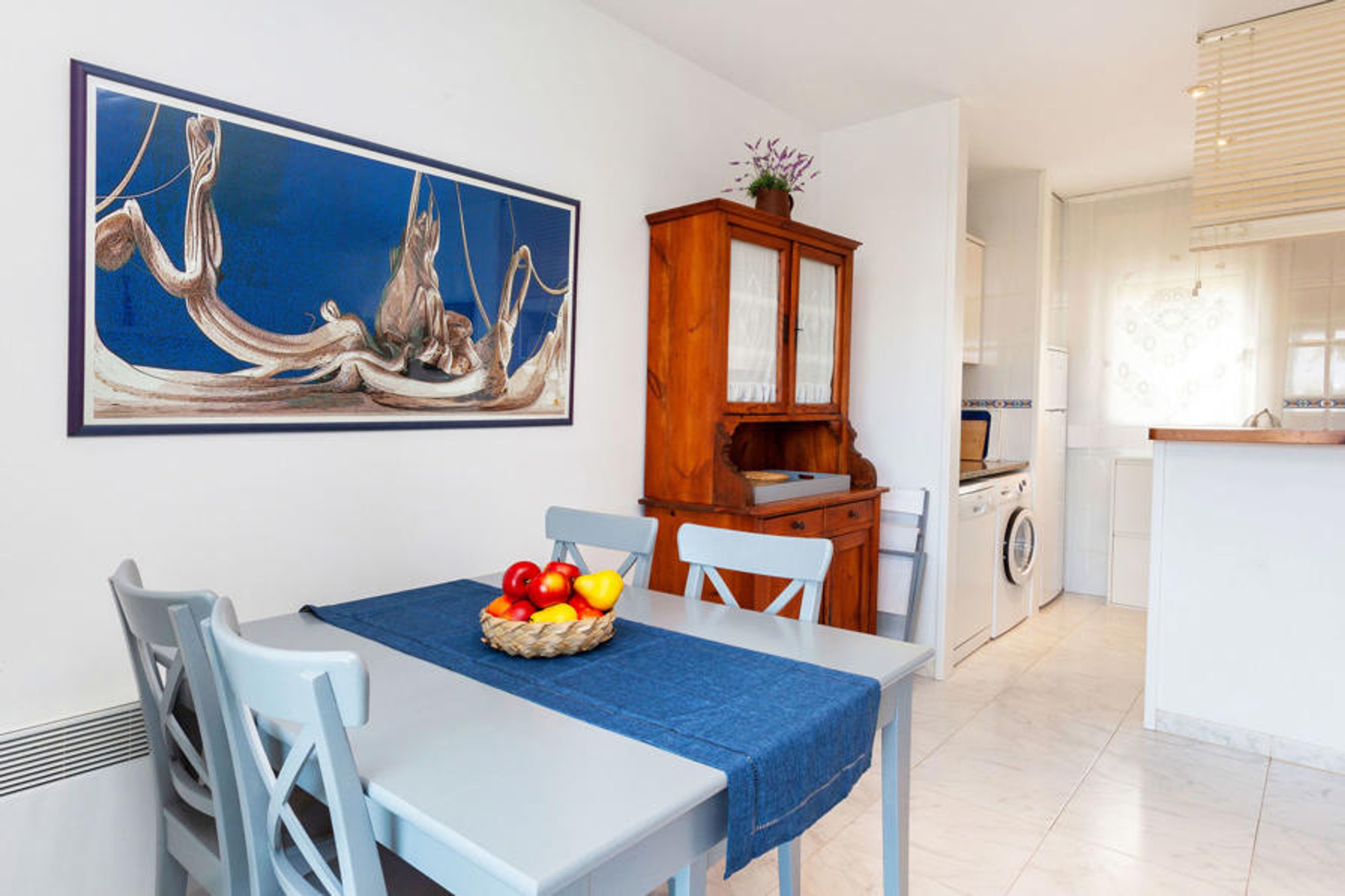 "Trebol Blanco", 3-room terraced house 80 m2 on 2 levels. Practical furnishings: living/dining room with digital TV and fan. Exit to the patio. Open kitchen (oven, dishwasher, 3 ceramic glass hob hotplates, microwave). Sep. WC. Boiler (100 litres). No heating option. Upper floor: 1 room with 1 french bed (150 cm, length 190 cm), fan. 1 room with 1 x 2 bunk beds (140 cm, length 190 cm), fan. Bath/WC. Patio. Terrace furniture. Facilities: washing machine, children's high chair, baby cot, hair dryer. Internet (WiFi, free). Parking (1 car). Please note: TV only ES. HUTG-003154 // Reg. Nr.: ESFCTU00001700700019349700000000000000000HUTG-0031542
