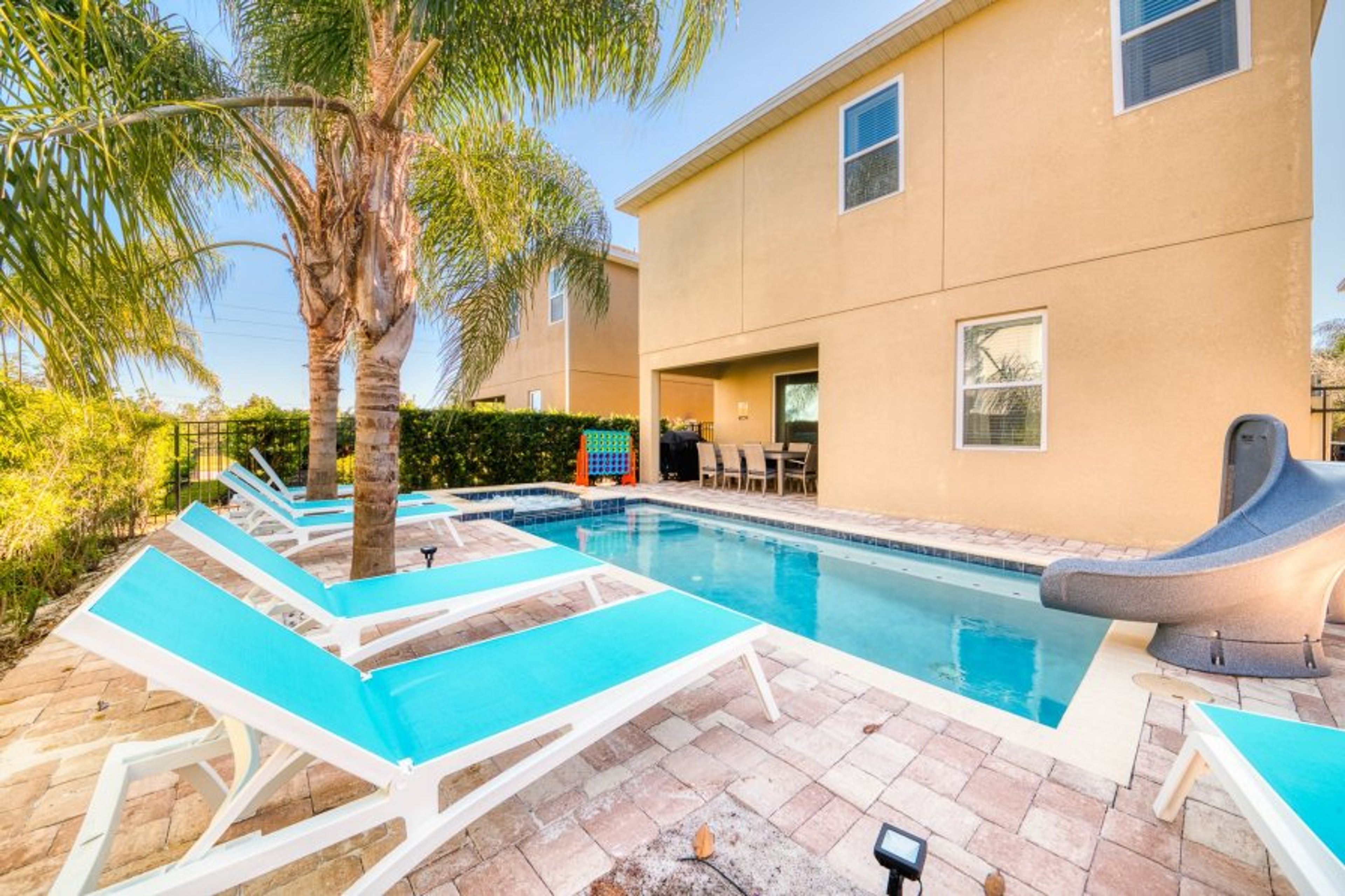 Sleeping up to 18 people, this home has 8 bedrooms across both floors including 2 incredibly themed bedrooms for the ice princess or galactic hero in the family, complete with a slide! The outdoor living space is perfect for warm Florida summer days with a private swimming pool and spillover spa for the entire family to enjoy as well as a bbq and kid's water slide. This home also provides a themed games room and upper floor loft area equipped with an X-Box One and PS4 video game console, air hockey and foosball table for all your entertainment needs.