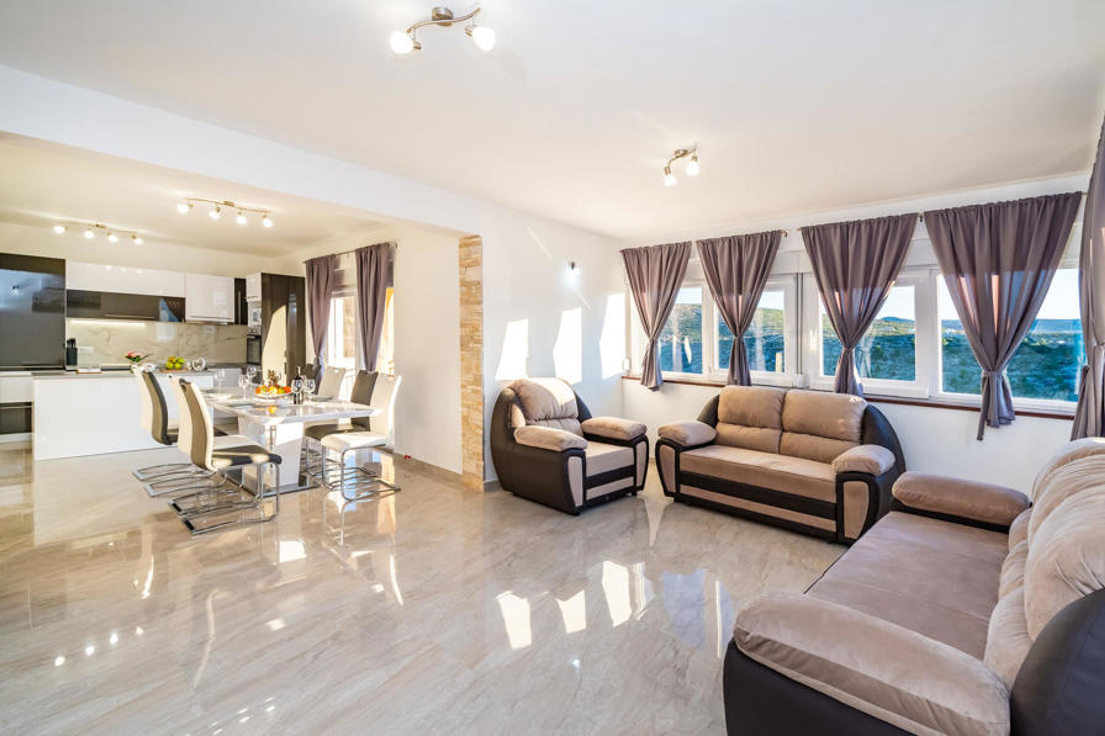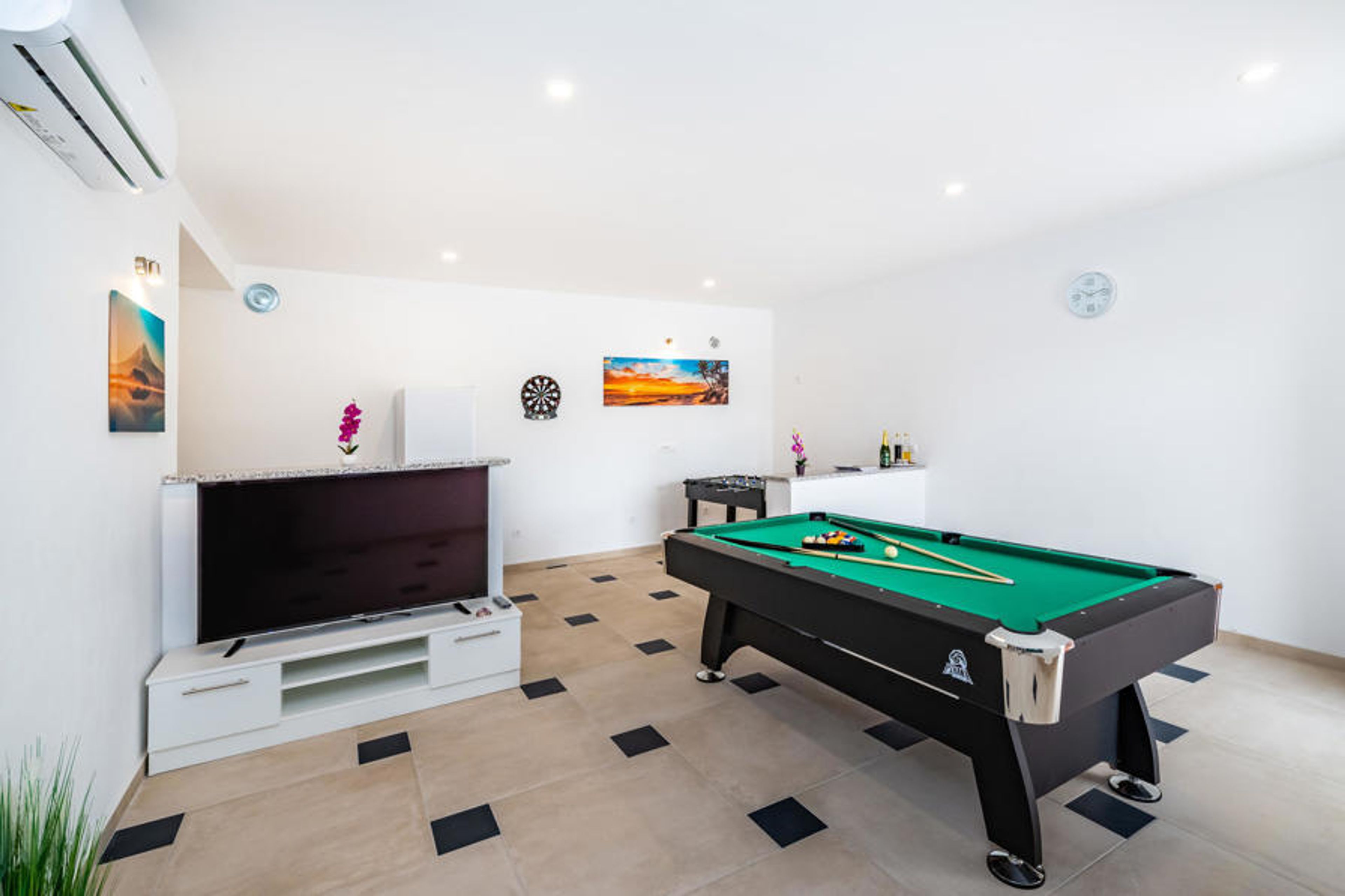 This beautiful and spacious holiday home with its own pool is located in the coastal village of Modri near Starigrad. It has sufficient air conditioning to ensure a pleasant indoor climate even on hot summer days. On the ground floor there is a pool table, table football and fitness room as well as a bedroom and bathroom. On the upper floor there are a further three bedrooms, two bathrooms and a living room with kitchen and dining area.