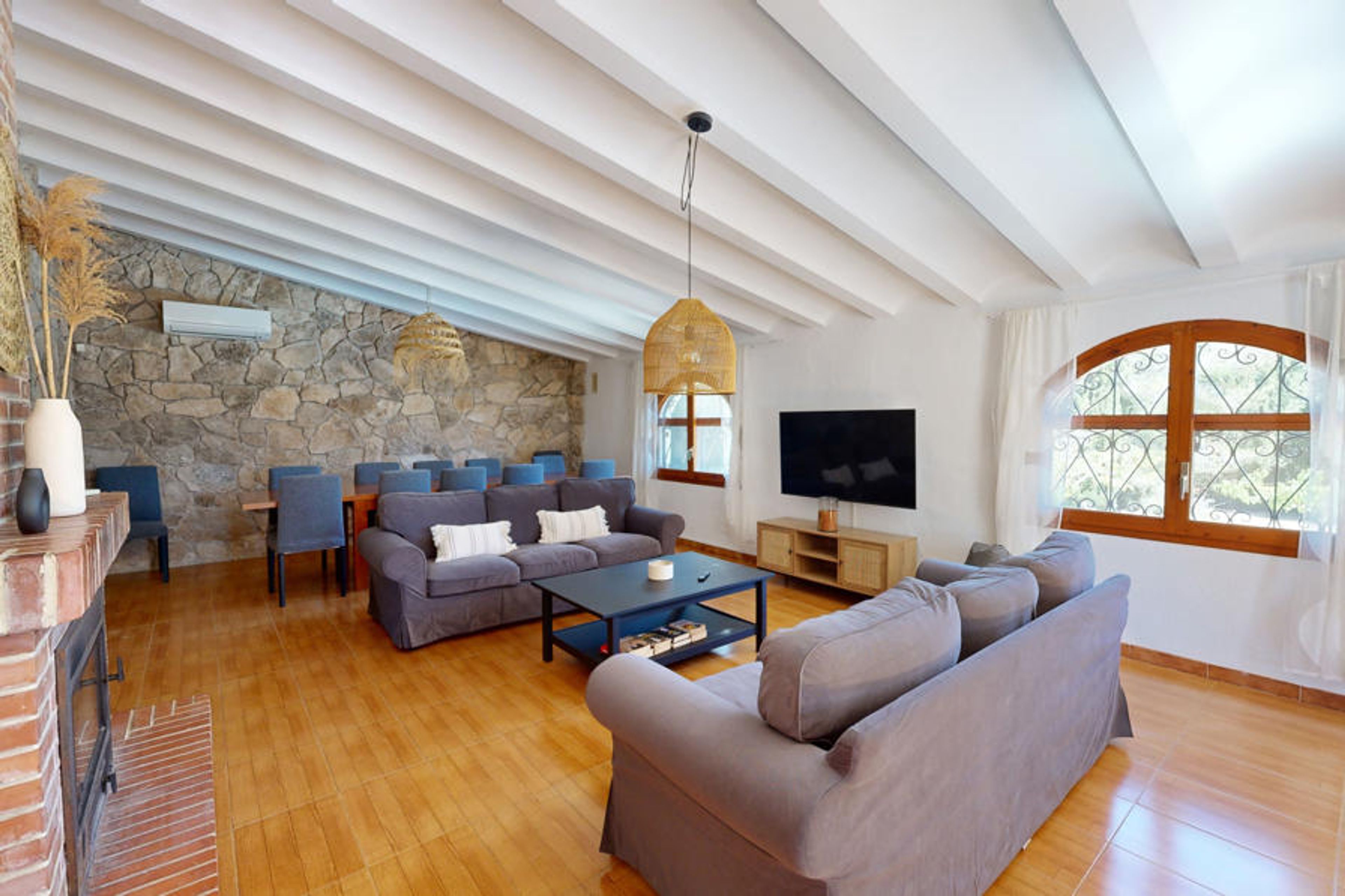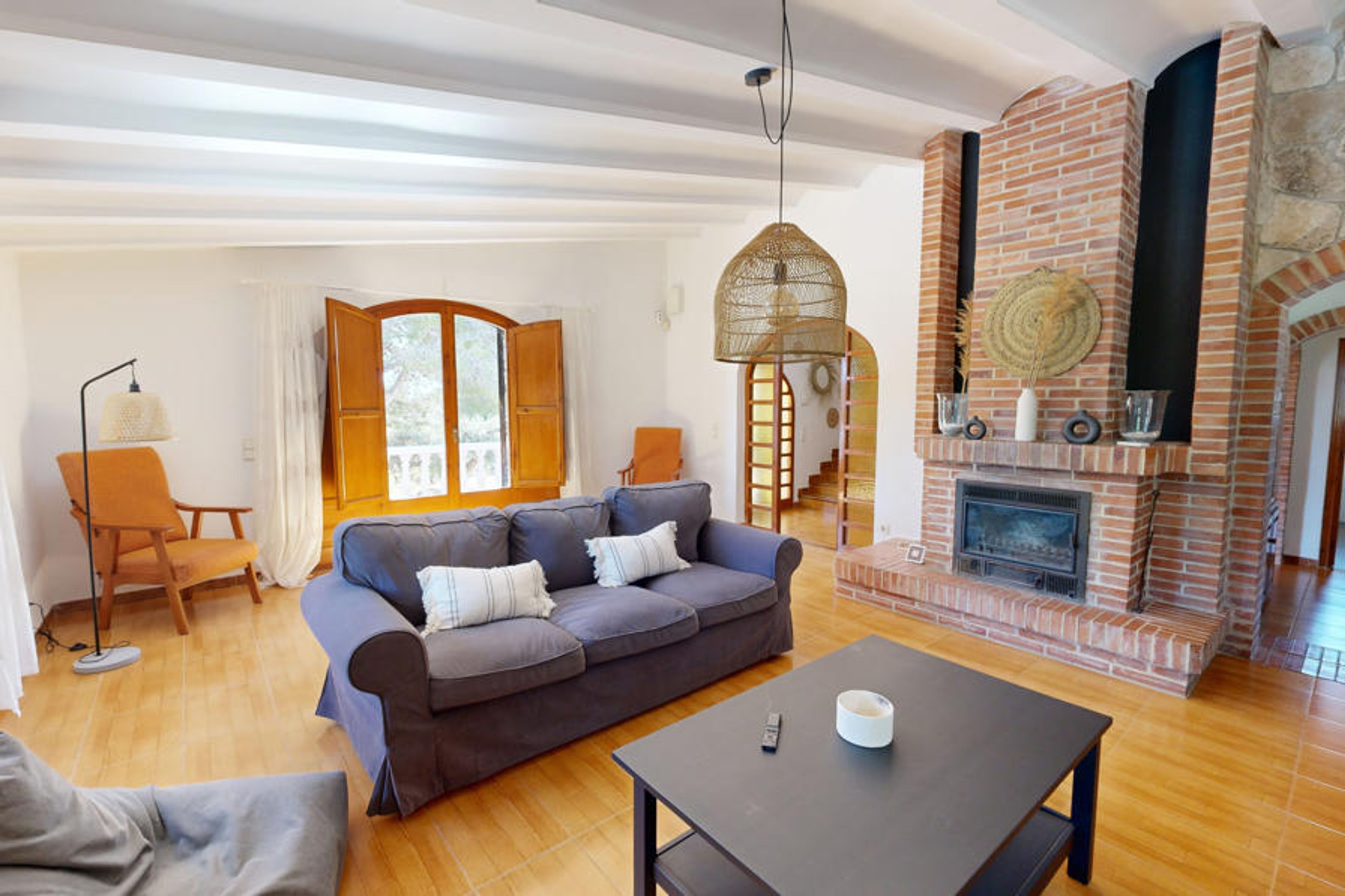 Villa Los Olivos is a large country cottage on beautiful grounds with private pool and located near l’Ampolla and the sea. It is a very big holiday home with five bedrooms. There is a large open plan living and dining area with a magnificent table with seating for twelve people and twin sofas with TV and Wi-Fi. There is an independent equipped kitchen with a large kitchen dining area. One bedroom with access to bathroom is located on the ground floor. On the first floor, there are two double bedrooms with access to a terrace with sea views. The other two bedrooms have two single beds each. There is a large bathroom on this level. There is A/C in the main living and kitchen areas. Outside there is an orange grove and fenced gardens that are perfect for a relaxing break. With a sleeping capacity for up to twelve people, this country villa represents great value for money.