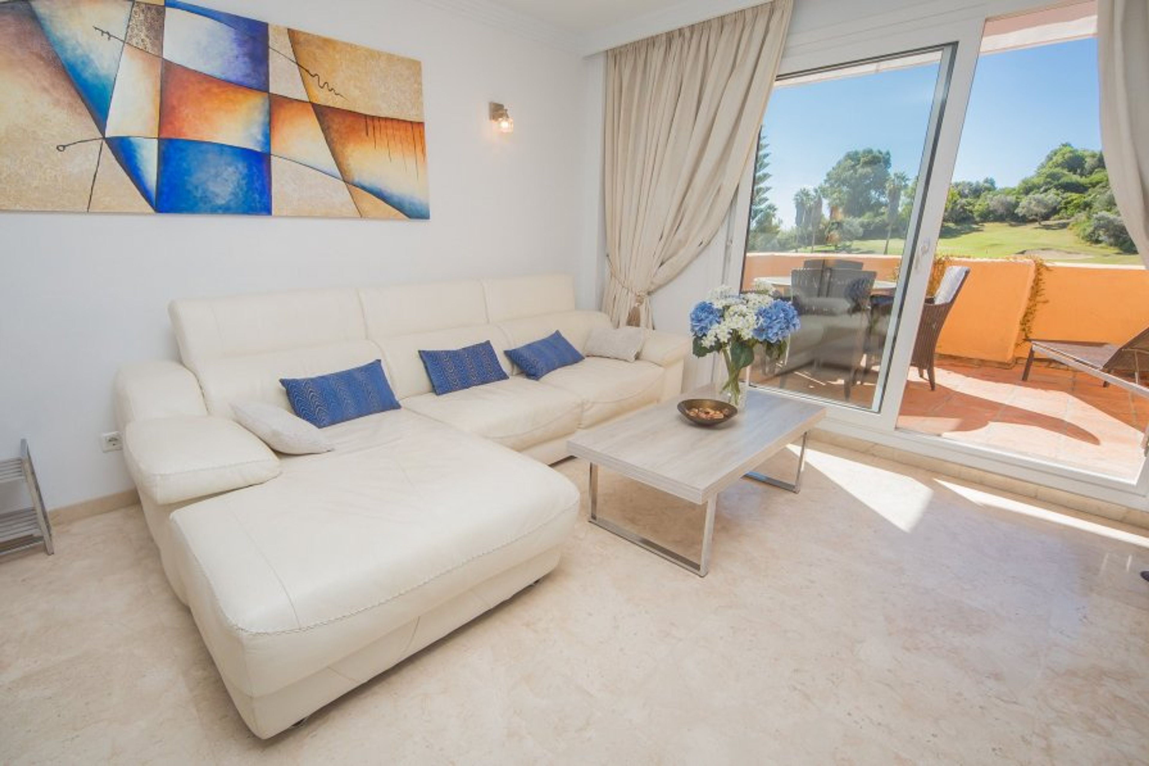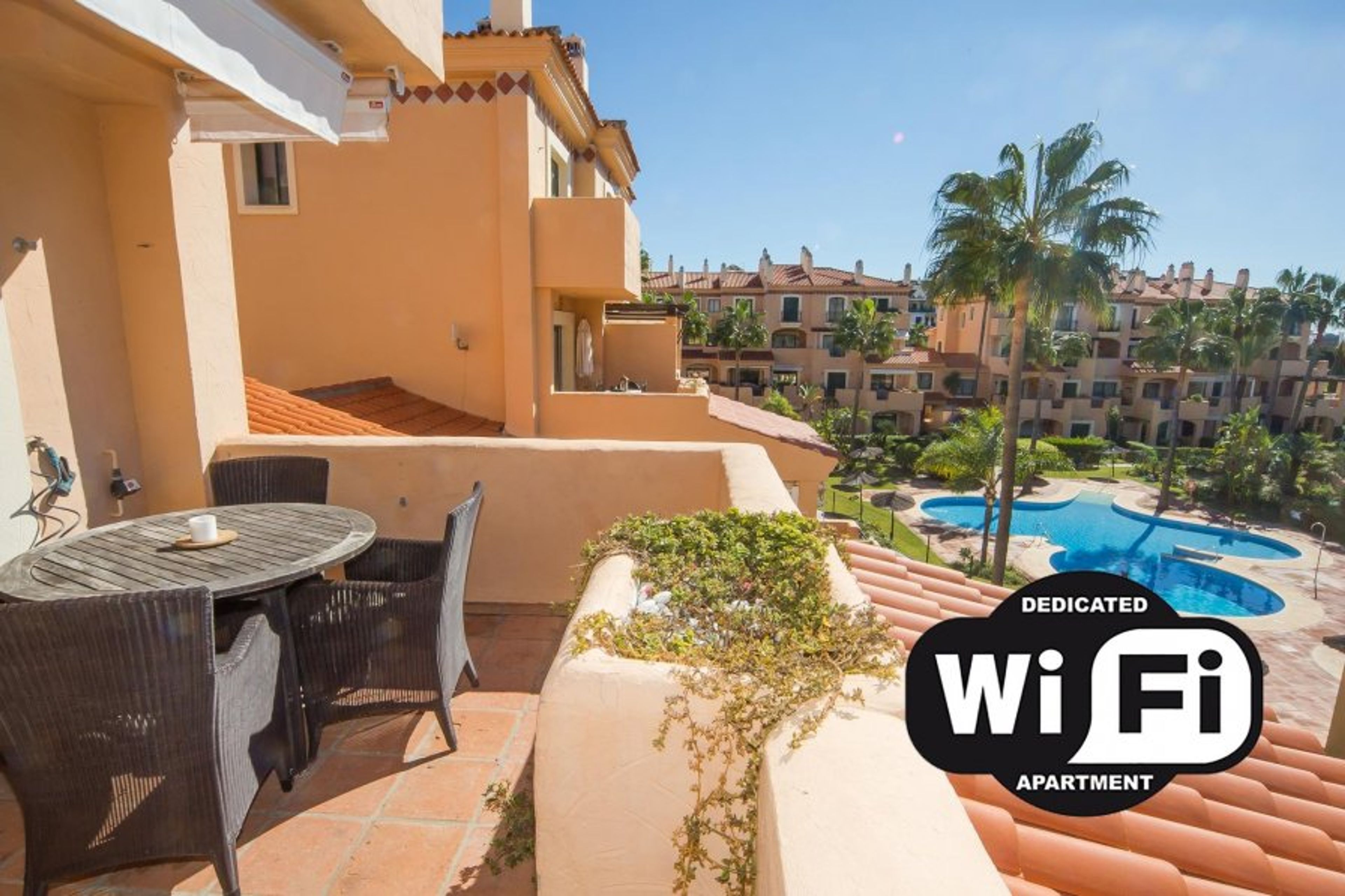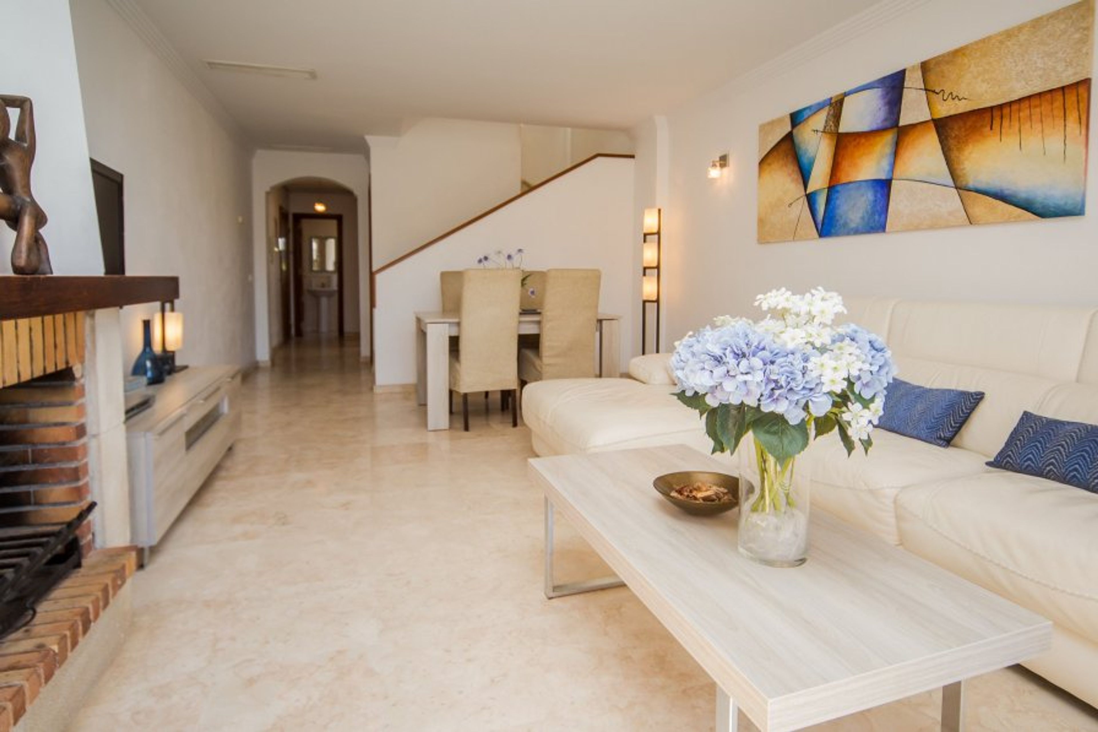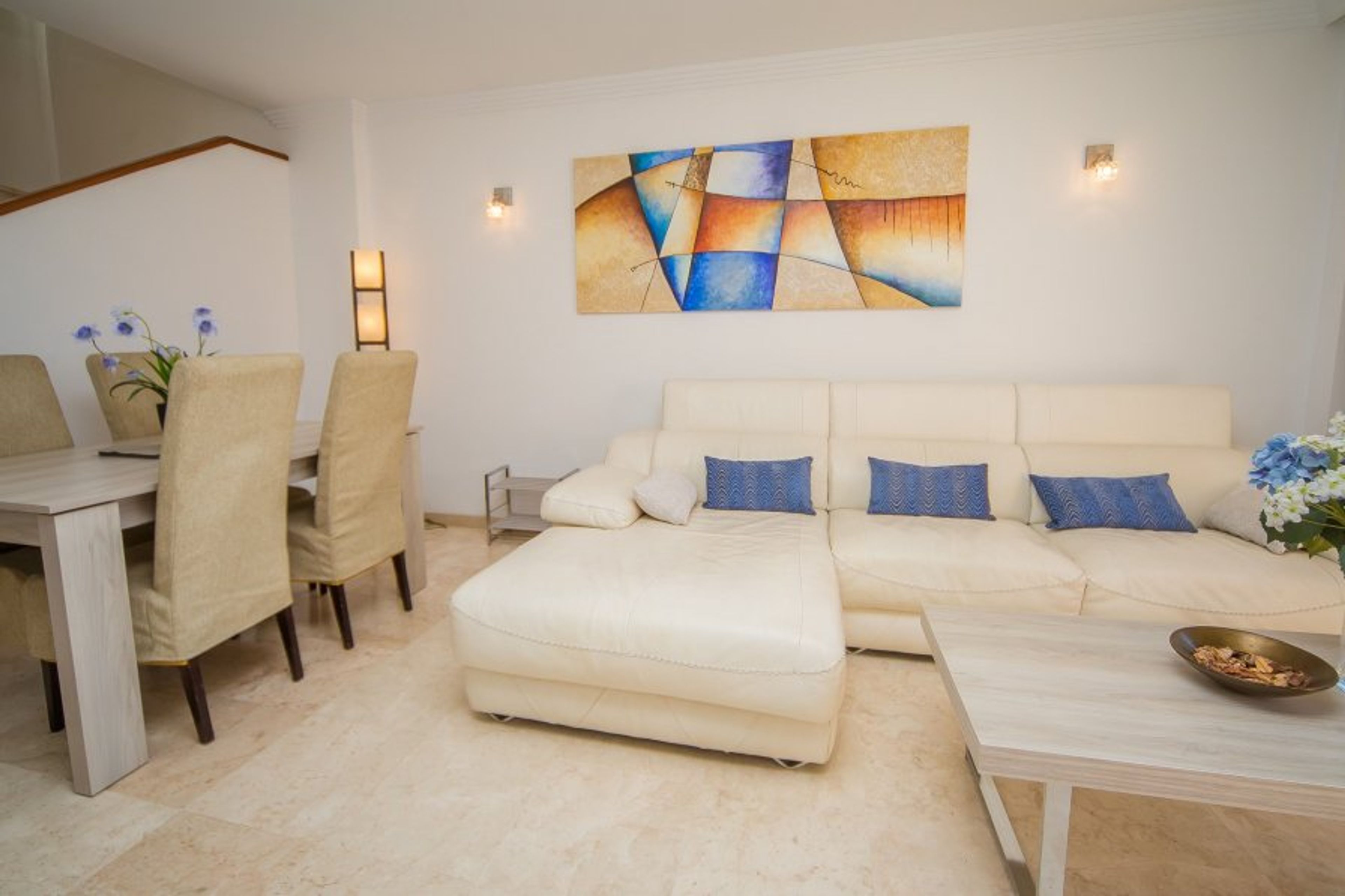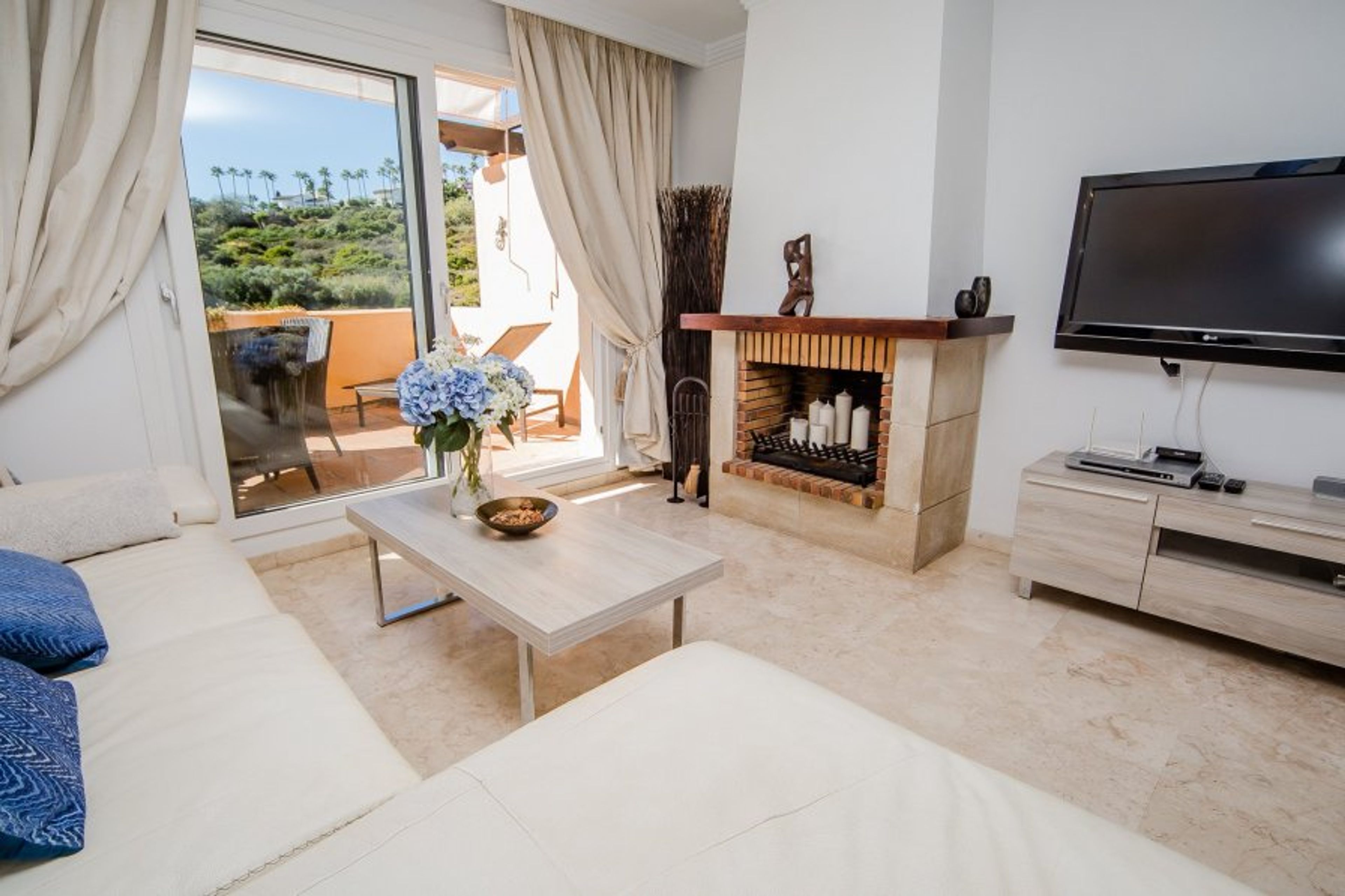 Duplex two bedroom apartment with air conditioning, wifi and two bathrooms recently updated. The lounge has a fireplace and patio doors leading to the south west facing terrace with views over the swimming pool and La Duquesa golf course. The bedrooms and bathrooms are located upstairs and there is a small toilet downstairs and an extra room currently furnished with a set of bunk beds.