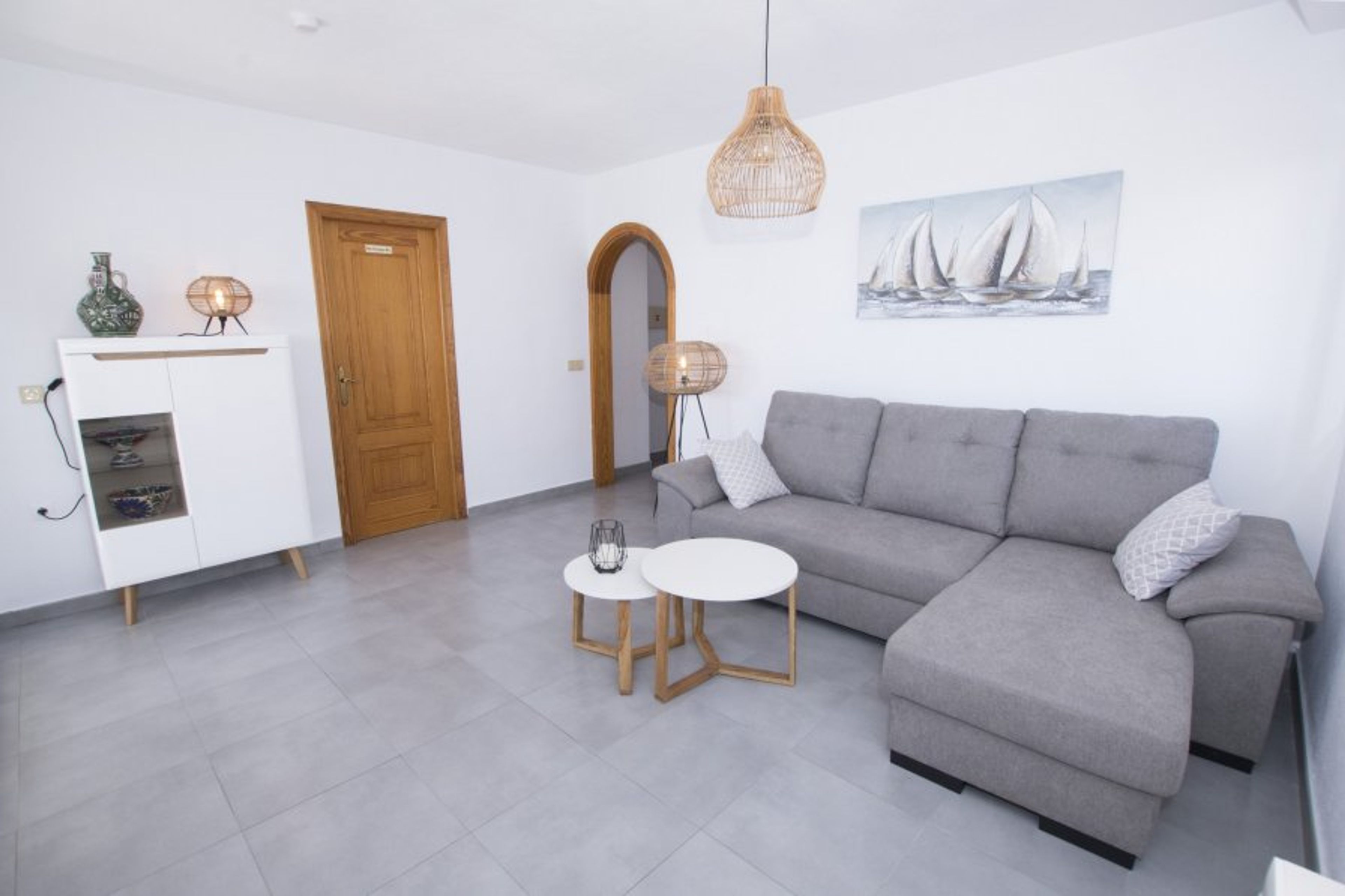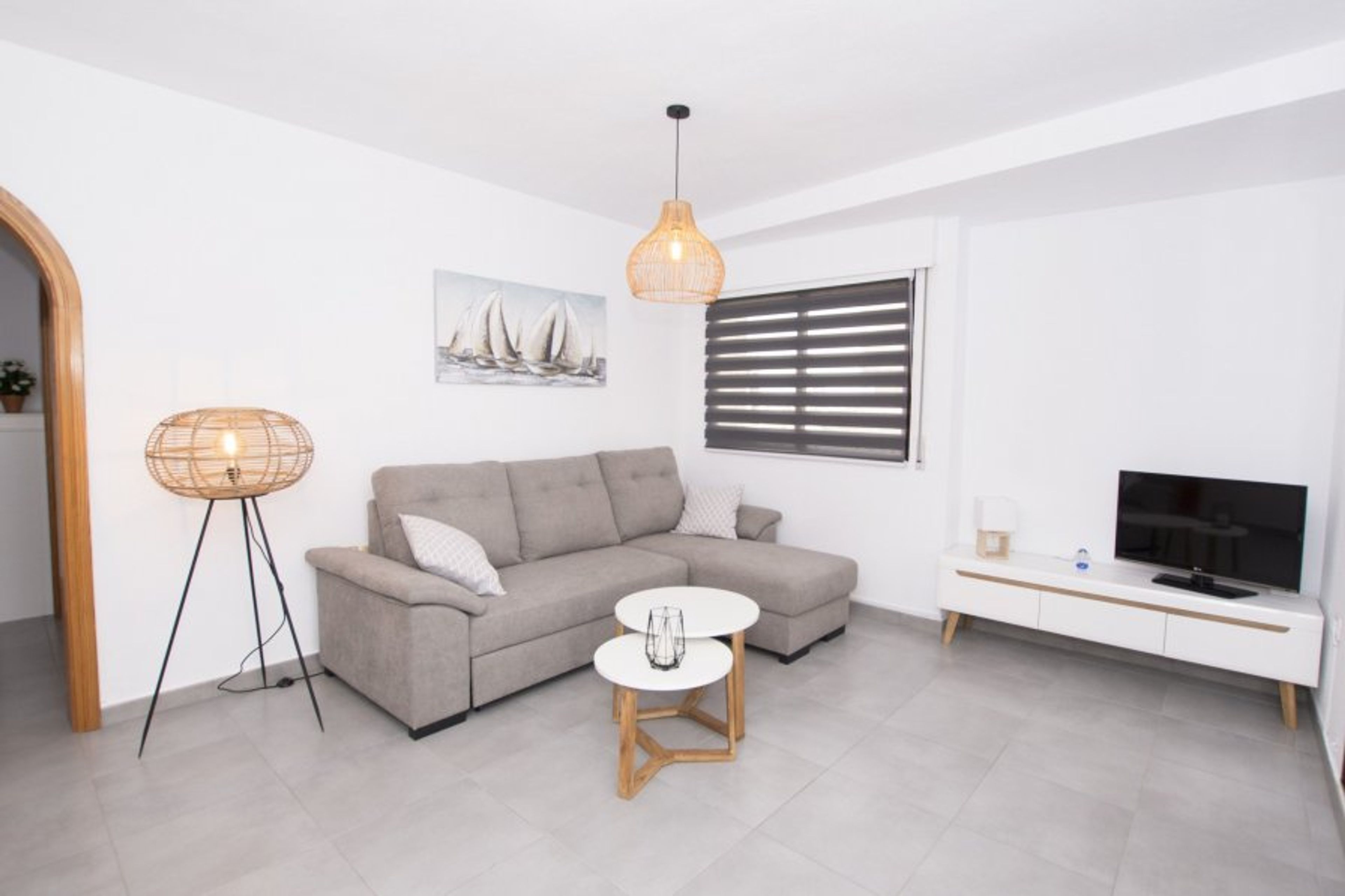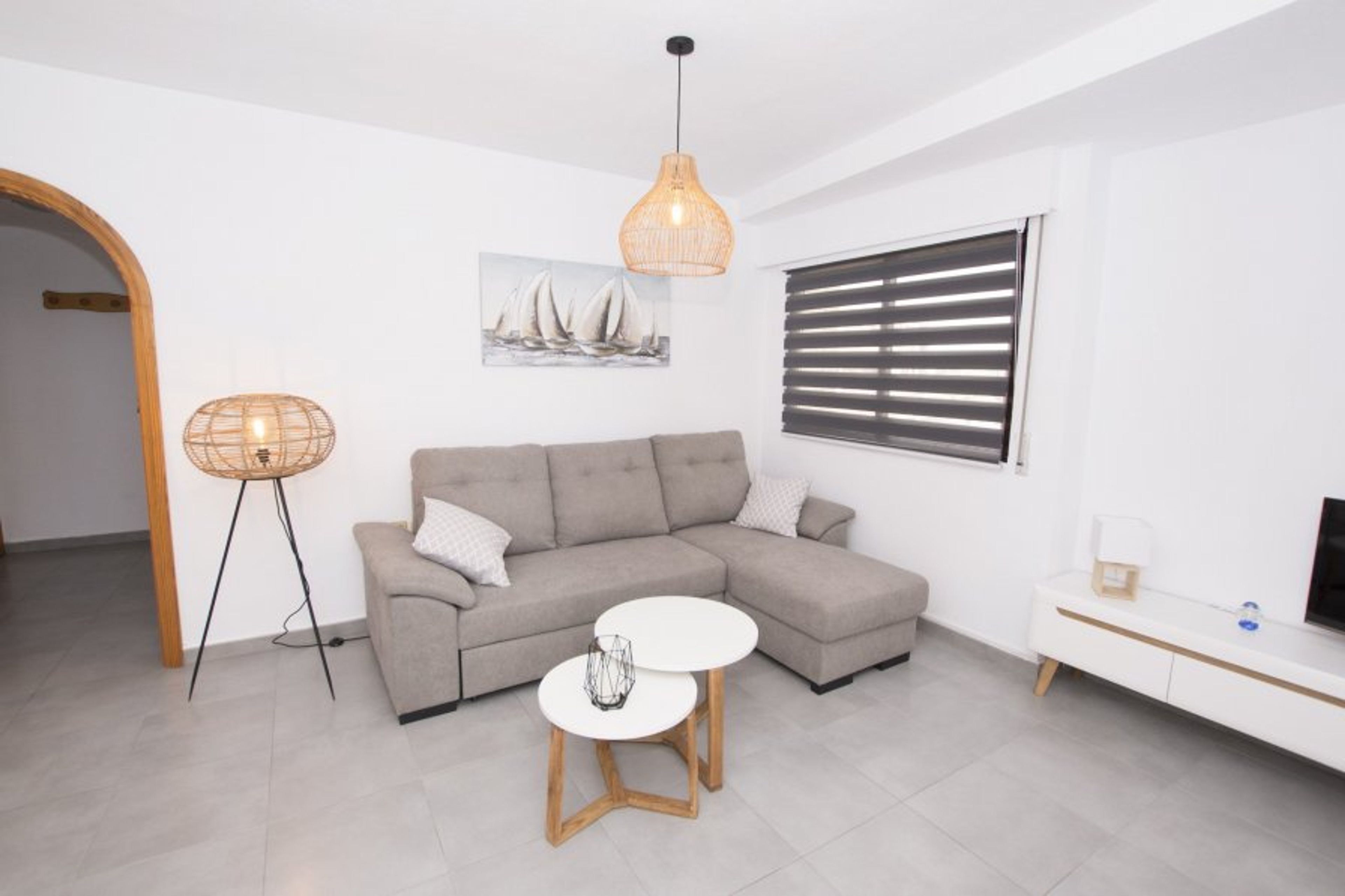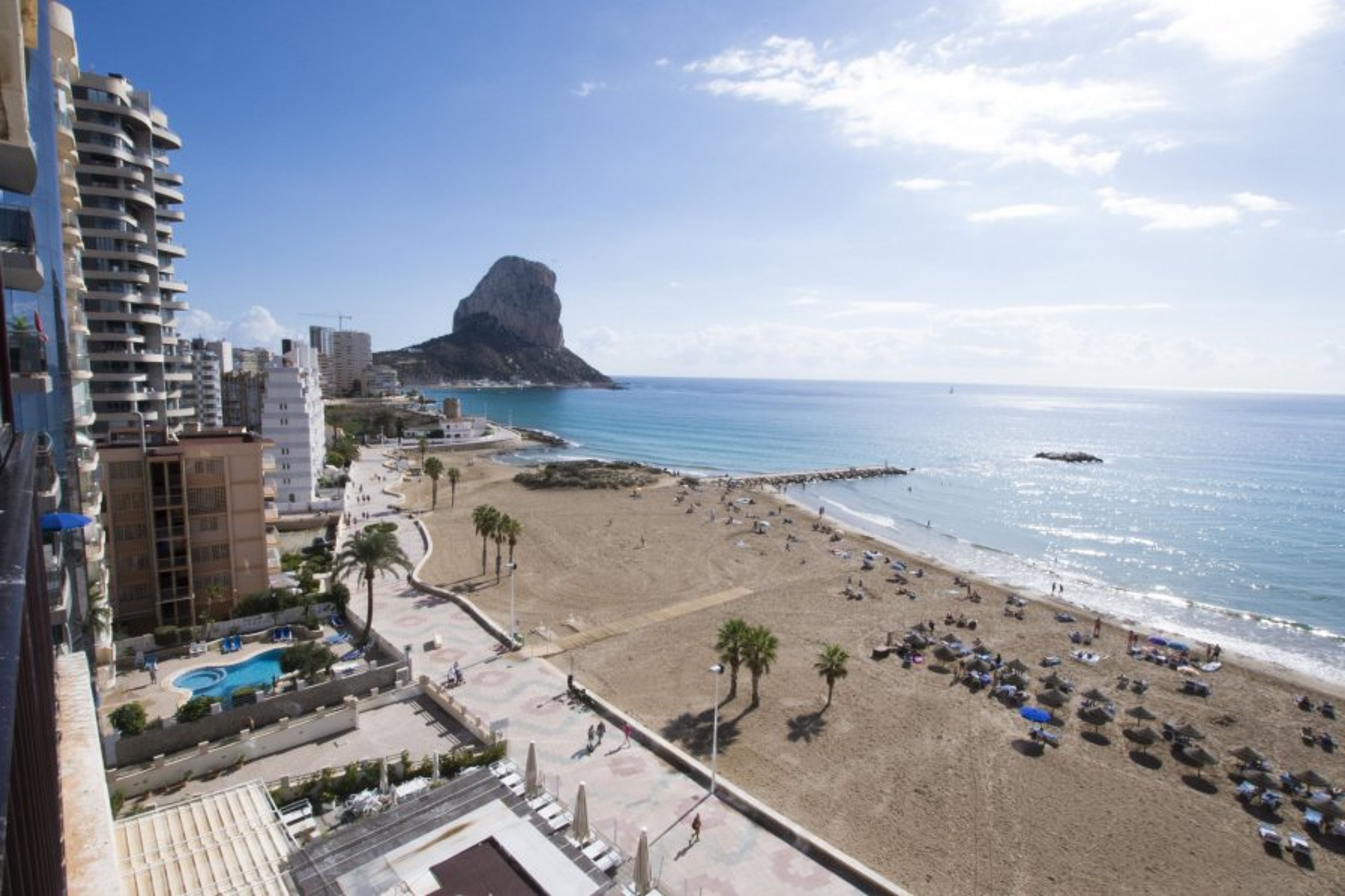 The flat in Calpe has 2 bedroom(s) and capacity for 4 people. The apartment is cozy, is exterior, and has 88 m². It is located in front of the beach, with sea views. Glazed terrace. It is located 400 m from the city, 100 km from the airport "ALTET - ALICANTE" and is situated in a quiet area by the sea. The promenade is a few metres from the entrance of the building, next to the Arenal Bol beach. It has lift, terrace, iron, TV. It has air conditioning in the bedroom (50€/week) and wifi (15€/week). The independent electric kitchen is equipped with fridge, microwave, oven, freezer, washing machine, dishwasher, crockery/cutlery, kitchen utensils, coffee machine and toaster. Spacious and stylishly decorated living/dining room.