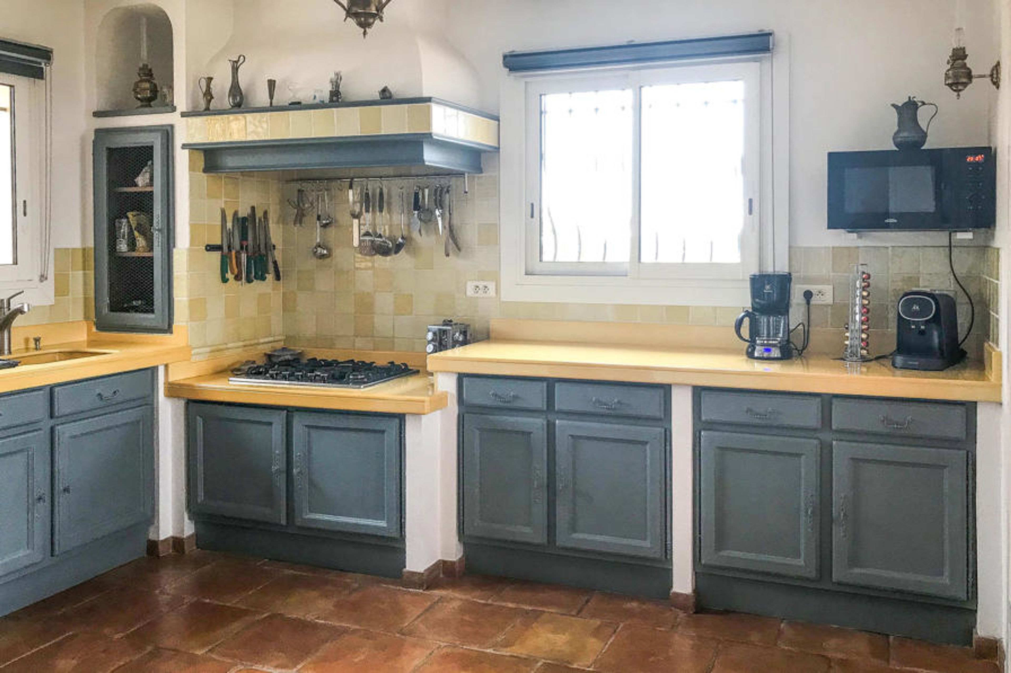 The house is spacious, comfortable and charming as well as authentically and modernly furnished. It has large interiors on the first floor, a billiard room, a living room with dining and living area, a large separate kitchen with a lava stone countertop. One of the rooms has a large private terrace with deck chairs. All rooms (except one of the bedrooms upstairs) have direct access to the garden and have spectacular views of the hills and the pool.