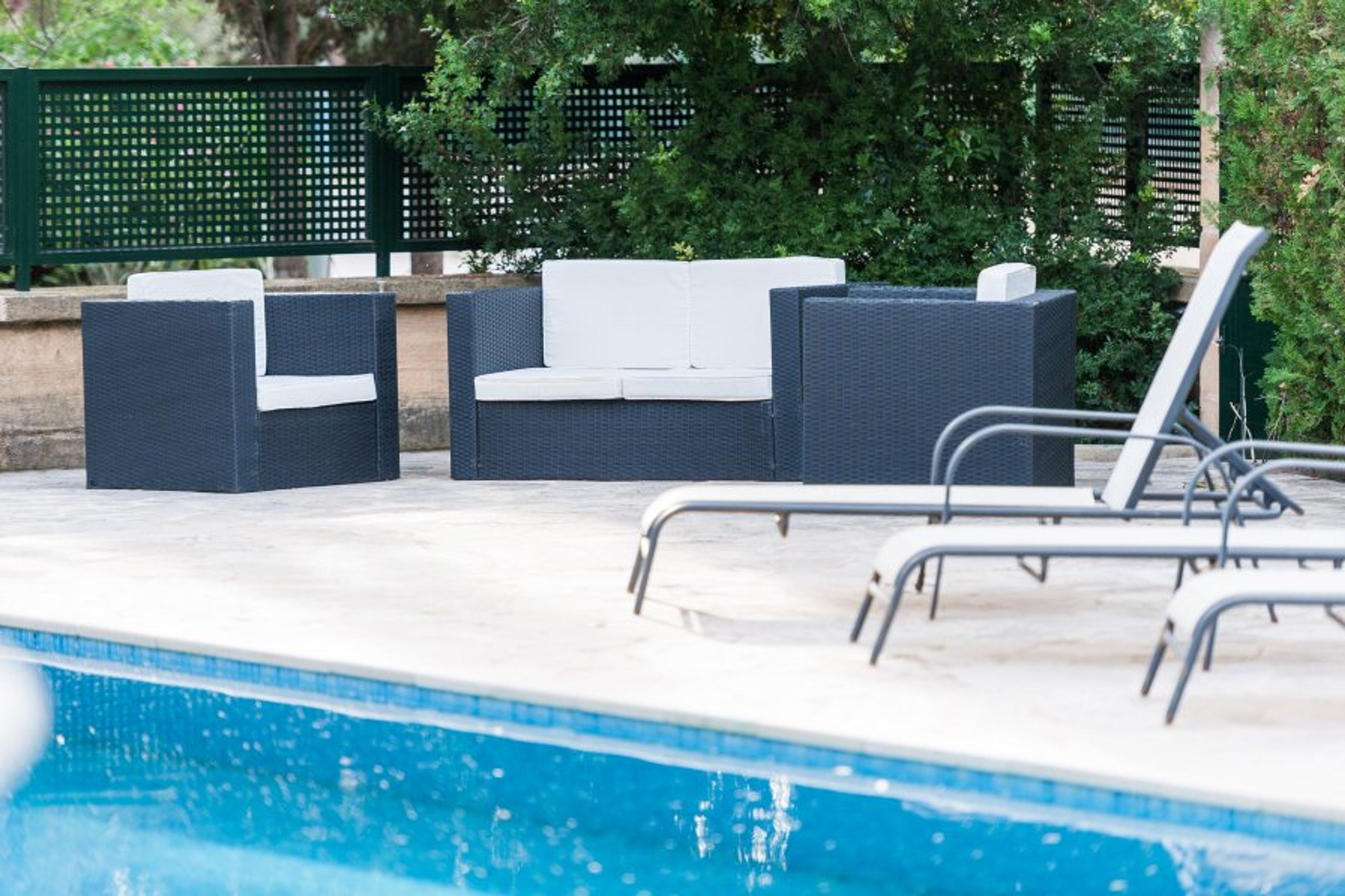 Villa Bell Lloc Bonaire is a magnificent property of premium holidays: construction contemporary air with a fragrant Mediterranean garden dotted with olive and lemon trees with a fantastic pool flanked by a row of chairs design, ping pong and your feet an attractive corner chill out with elegant rattan furniture. Also they are surrounding the house a porch covered with a bank of colonial aesthetic and dining outdoor barbecue and a terrace that embraces the first floor with breakfast area and reading corner. Luxury housing built with quality materials has marble floors and parquet, heating, air conditioning and WIFI.