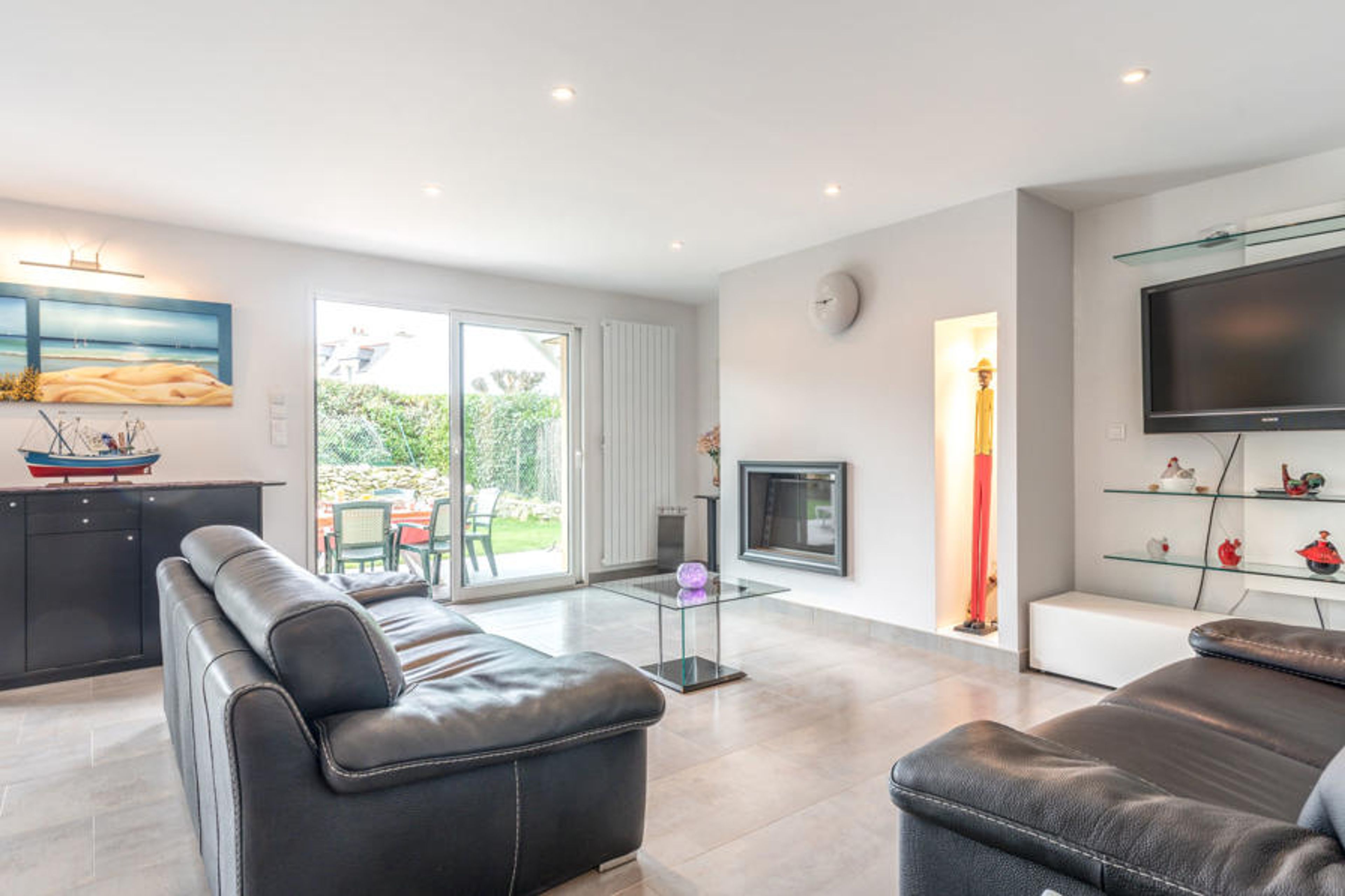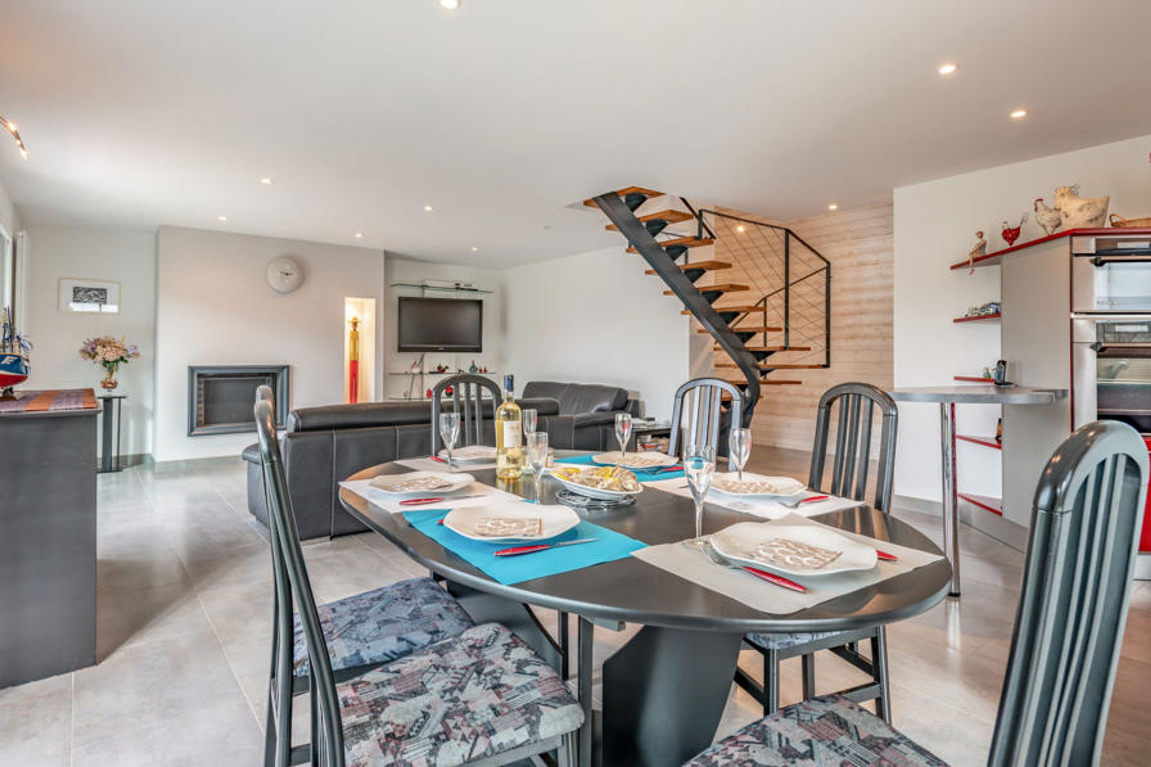 4-room house 110 m2 on 2 levels. Comfortable furnishings: large living/dining room with panoramic window with open-hearth fireplace and TV (flat screen). Exit to the garden. Open kitchen (oven, dishwasher, 3 induction hot plates, freezer, combination microwave). Sep. WC. Upper floor: 1 room with 1 french bed (1 x 140 cm, length 190 cm), TV (flat screen). Exit to the terrace. 1 room with 1 double bed (1 x 140 cm, length 190 cm). Exit to the terrace. 1 room with 2 beds (90 cm, length 190 cm), TV (flat screen). 2 showers, sep. WC. Electric heating. Large garden. Terrace furniture, barbecue. Facilities: washing machine. Internet (WiFi). Please note: suitable for families. Smoke alarm. 56186 000632 2S