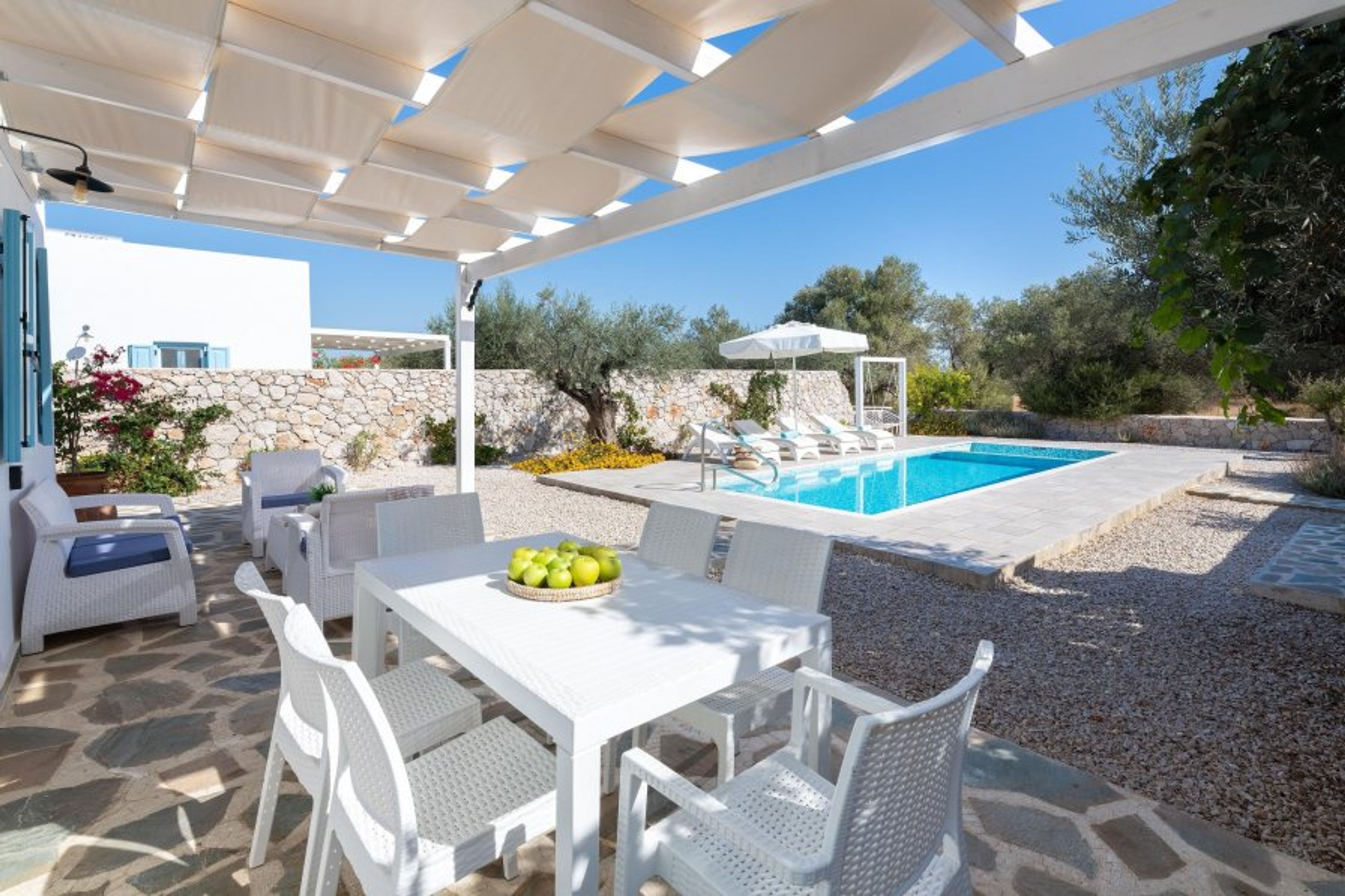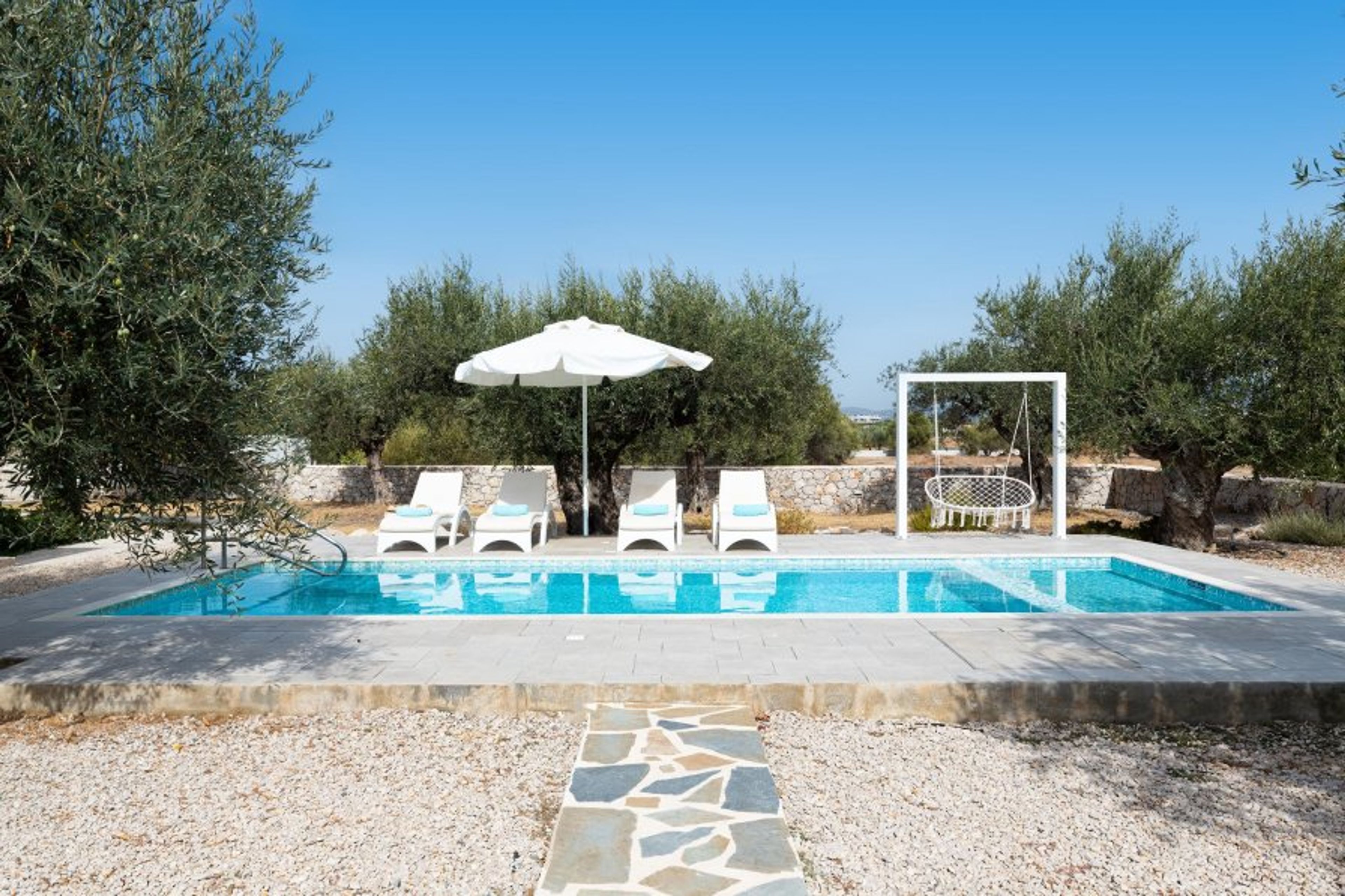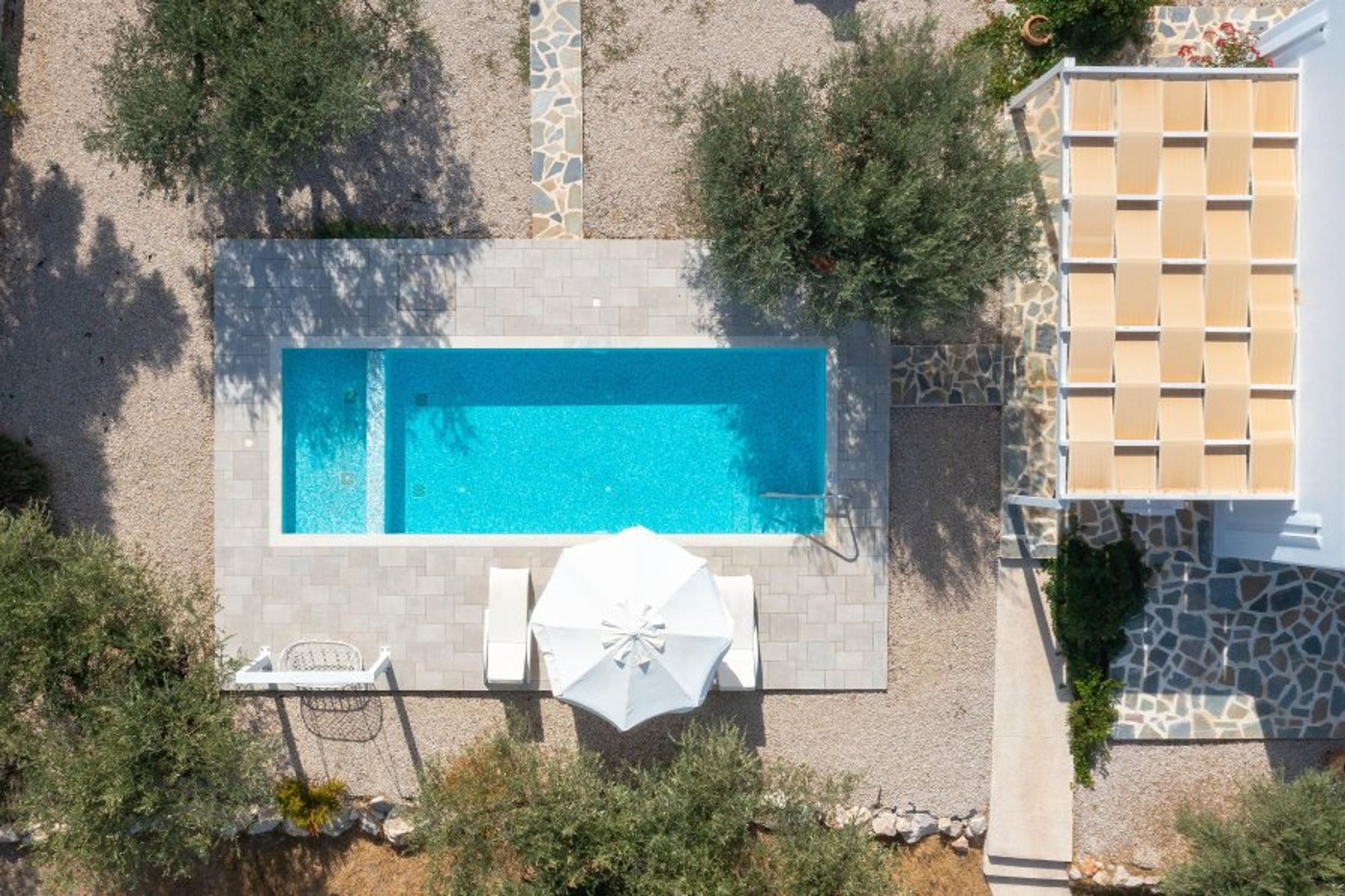Blue Dream villa has 2 wonderful bedrooms; the one is with a double bed and the other with two single beds. All bedrooms are tastefully decorated in a traditional way and have doors that lead outside the house and the swimming pool. Also, there are 2 bathrooms, each one with a shower. There’s a modern kitchen, fully equipped for any meal preparation along with a sitting area. Also, there’s a cozy living room in blue tones with a screen TV. Outdoors, there’s the exquisite private swimming pool with its sunbeds for your ultimate relaxation. The surrounding area is pretty inviting, guests of the villa will breathe the fresh air of Greek nature and relax under the Aegean sun. Also there’s a modern sitting area and BBQ facilities.