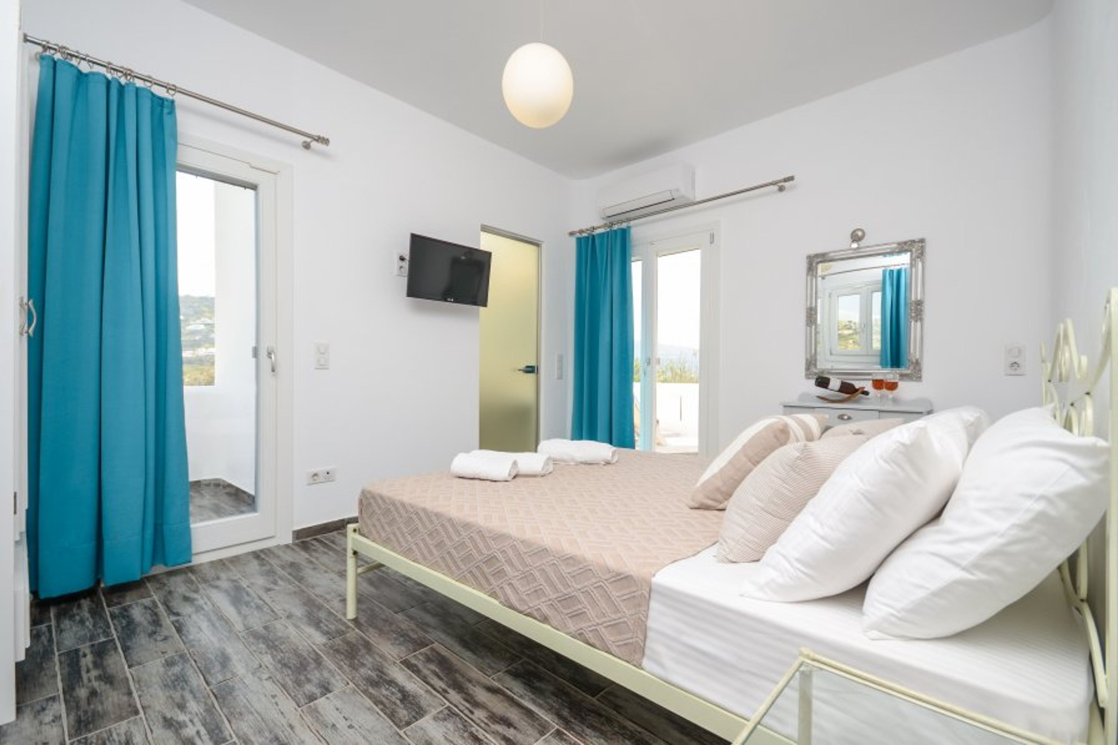On the 3nd level there is a bedroom with double bed, private bathroom, TV, a/c and 2 balconies’ with sea and Mountain View. The second bedrooms go down a few steps and has 2 double beds and a terrace.