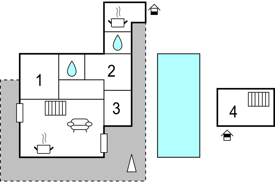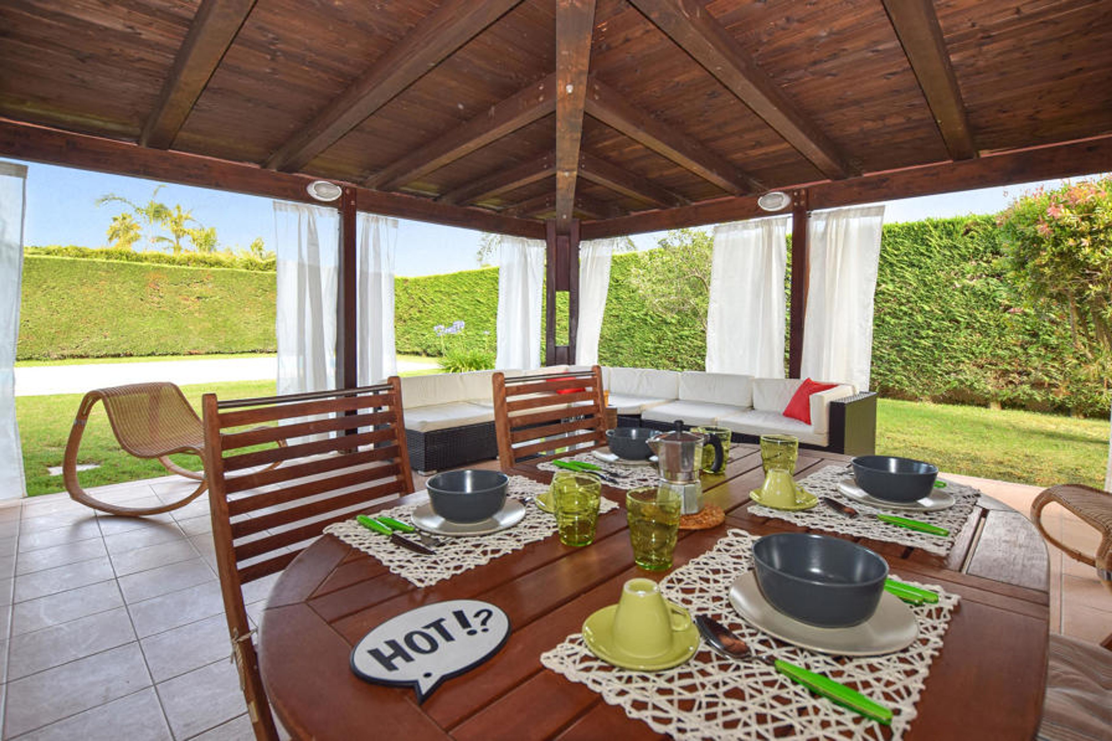 Outside there is a huge covered porch of about 150 m² equipped with tables, chairs, sofas and a kitchenette with barbecue. The pool is surrounded by lawn and high hedges for more privacy. The garden is equipped with various games for the little ones (slide, swing and playhouse).