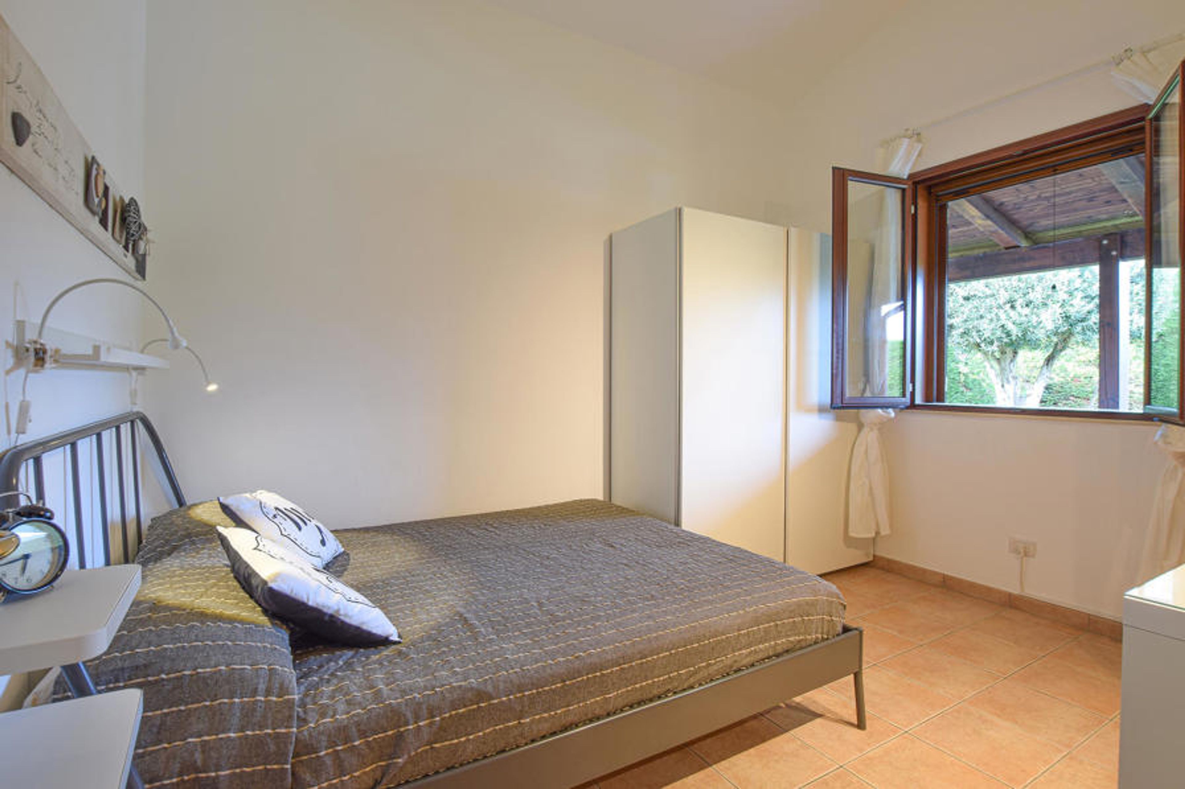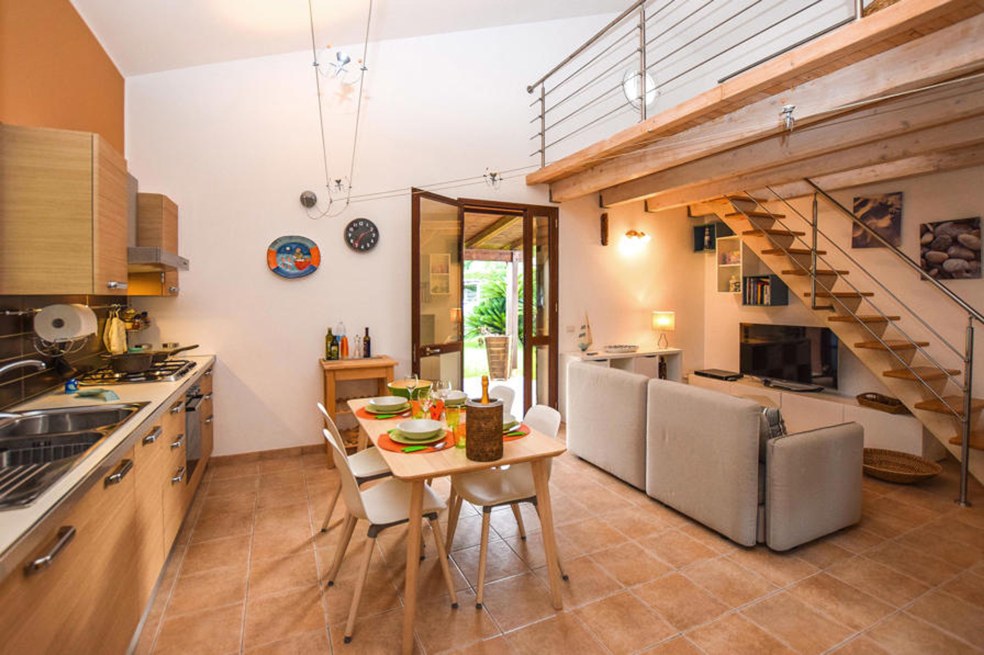 Inside the villa offers plenty of space with living and dining room with huge sliding windows overlooking the pool area, a kitchen with a large window overlooking the garden from which you enter through a hallway the three bedrooms (2 double and one with queen bed). Another bedroom with double bed was created in a mezzanine with very high ceilings.