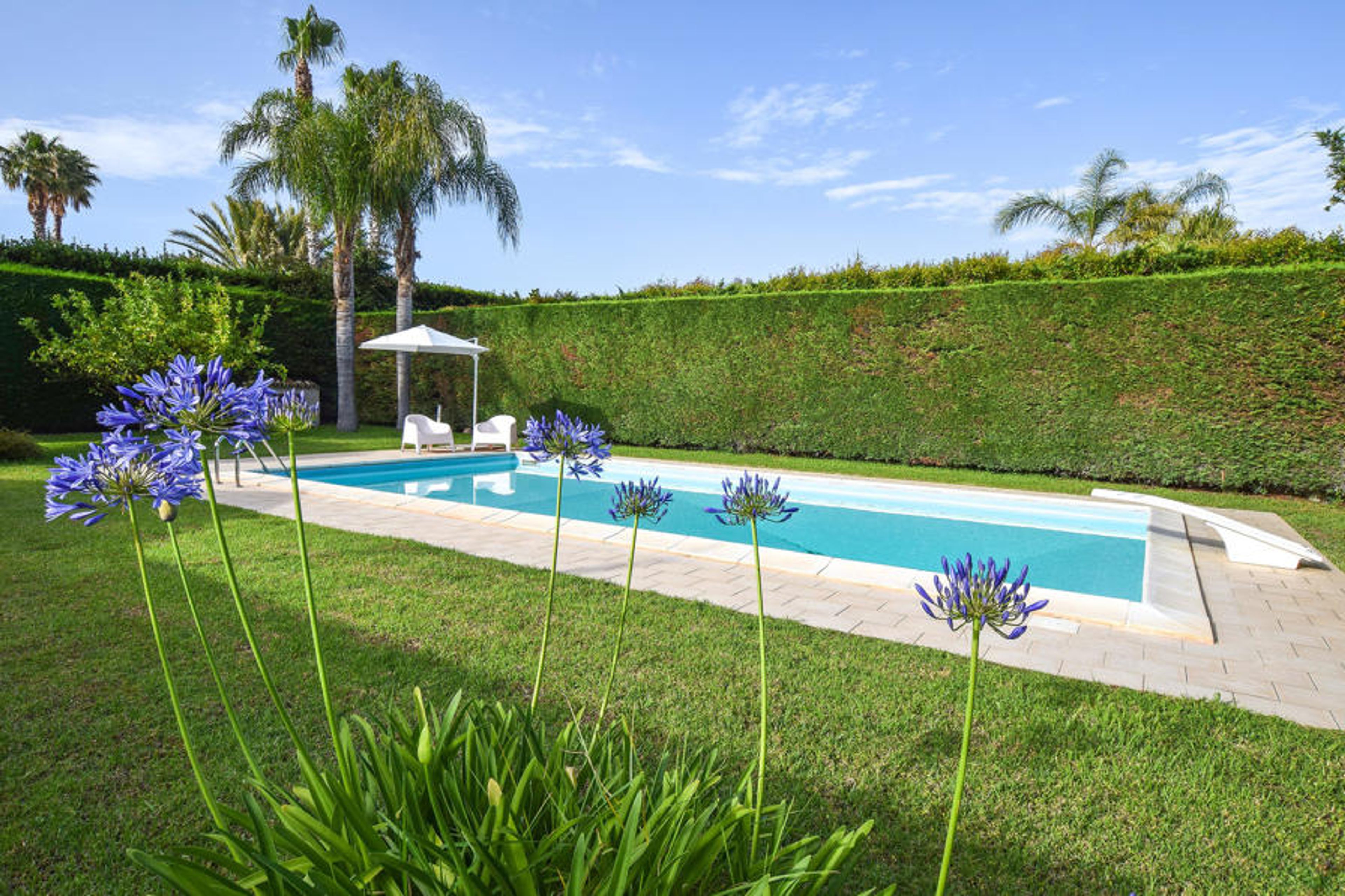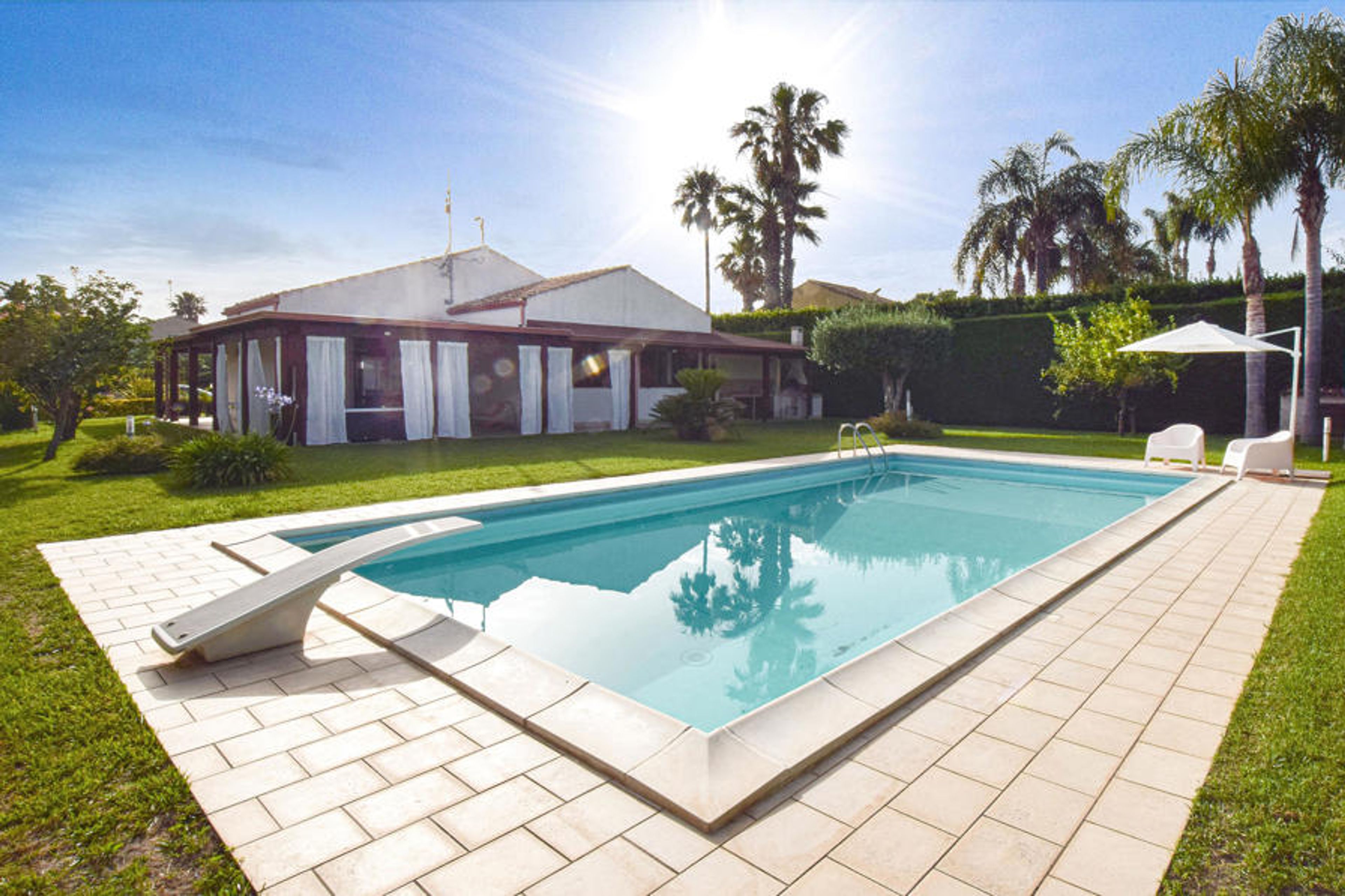 Between Marina di Ragusa and Donnalucata, in a residential village composed of luxury villas, this vacation home with a private pool is located in absolute privacy, surrounded by well-kept greenery.