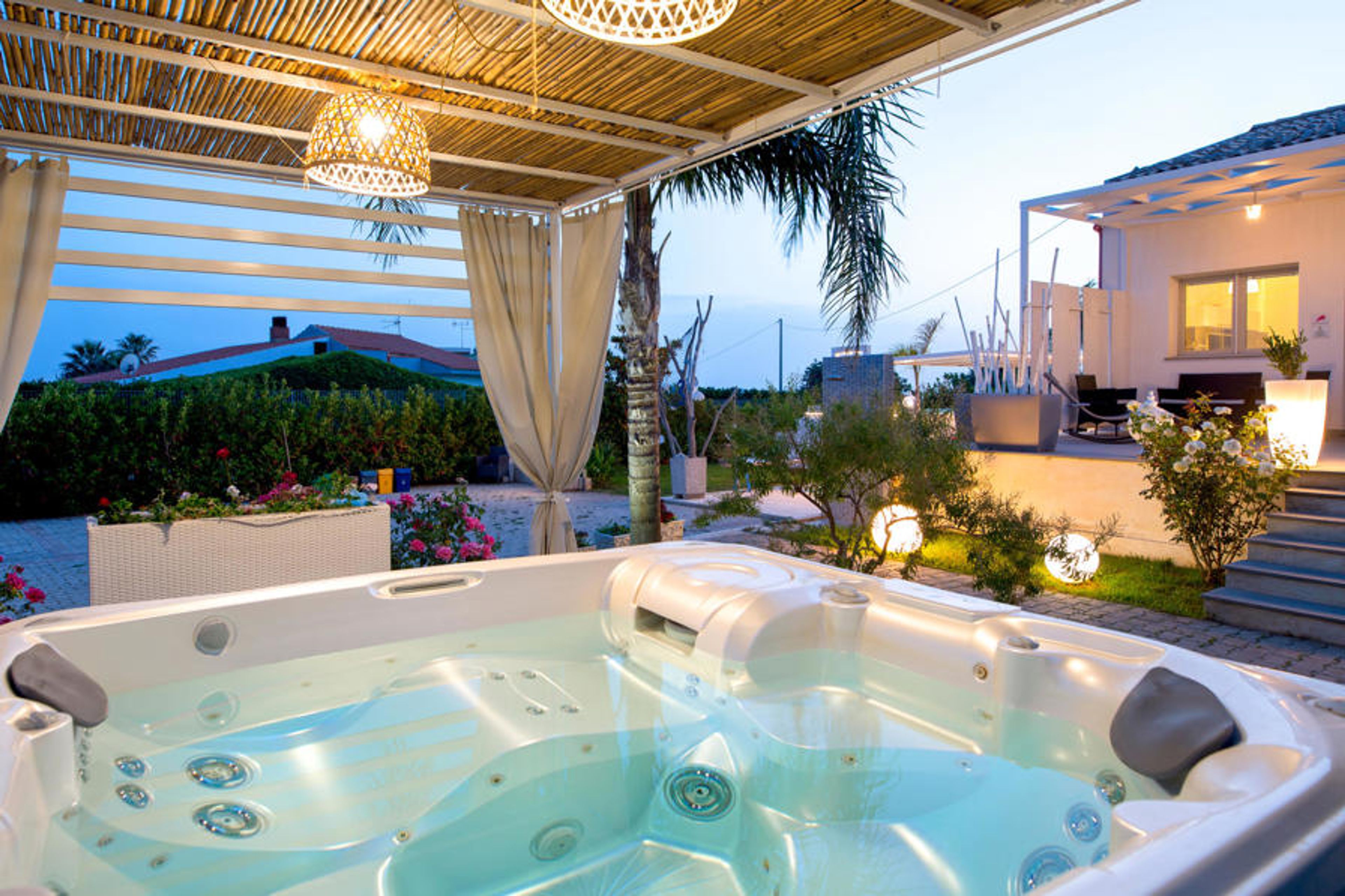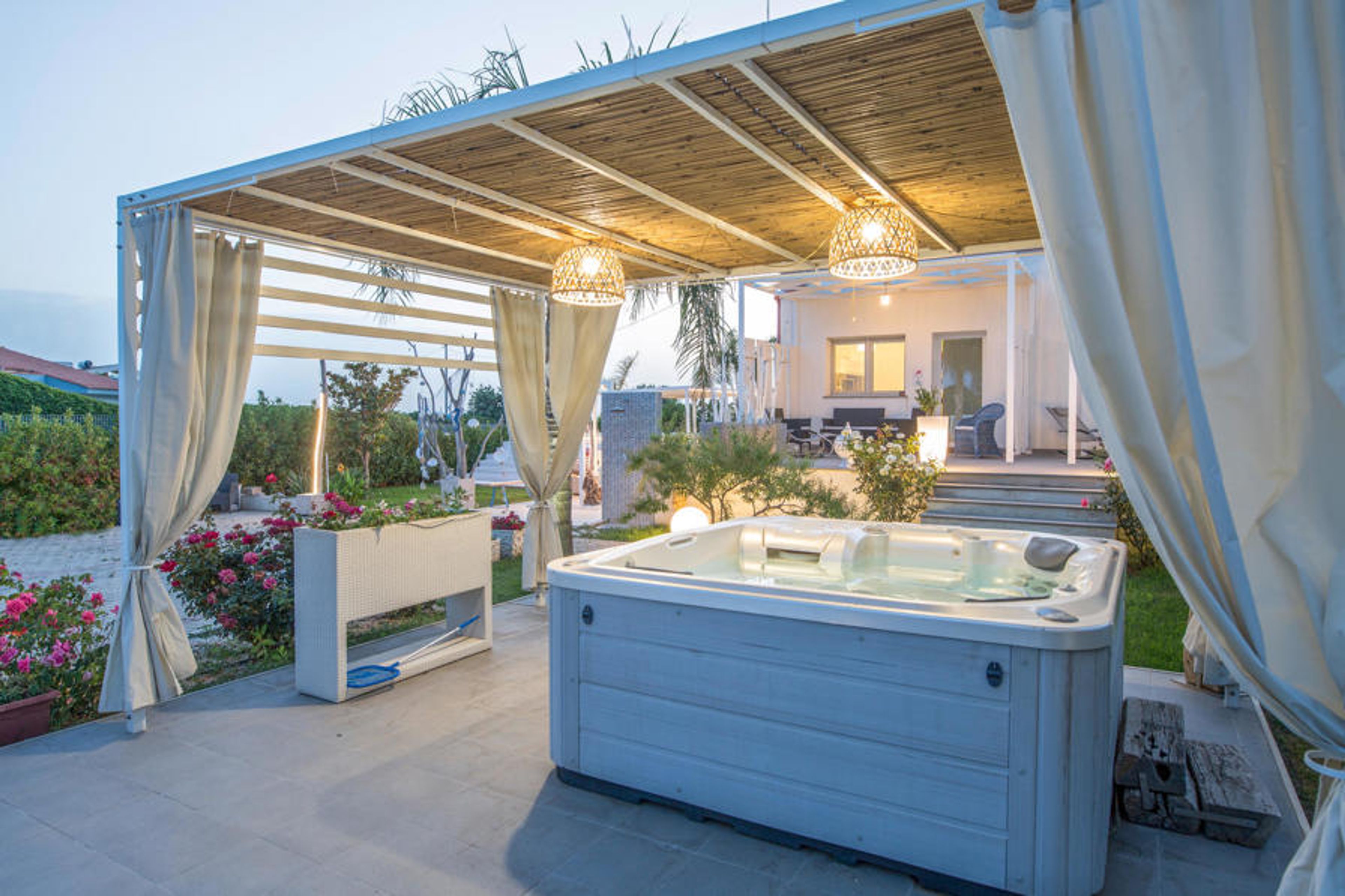 The house is located on a well-kept property with lawn, flowers and native trees, which you can reach directly with your own car. In the garden, an area with sun loungers and garden tables awaits you, as well as an exotic-looking gazebo that houses a hot tub for 5 people. From the pool to the west you can admire fabulous sunsets.