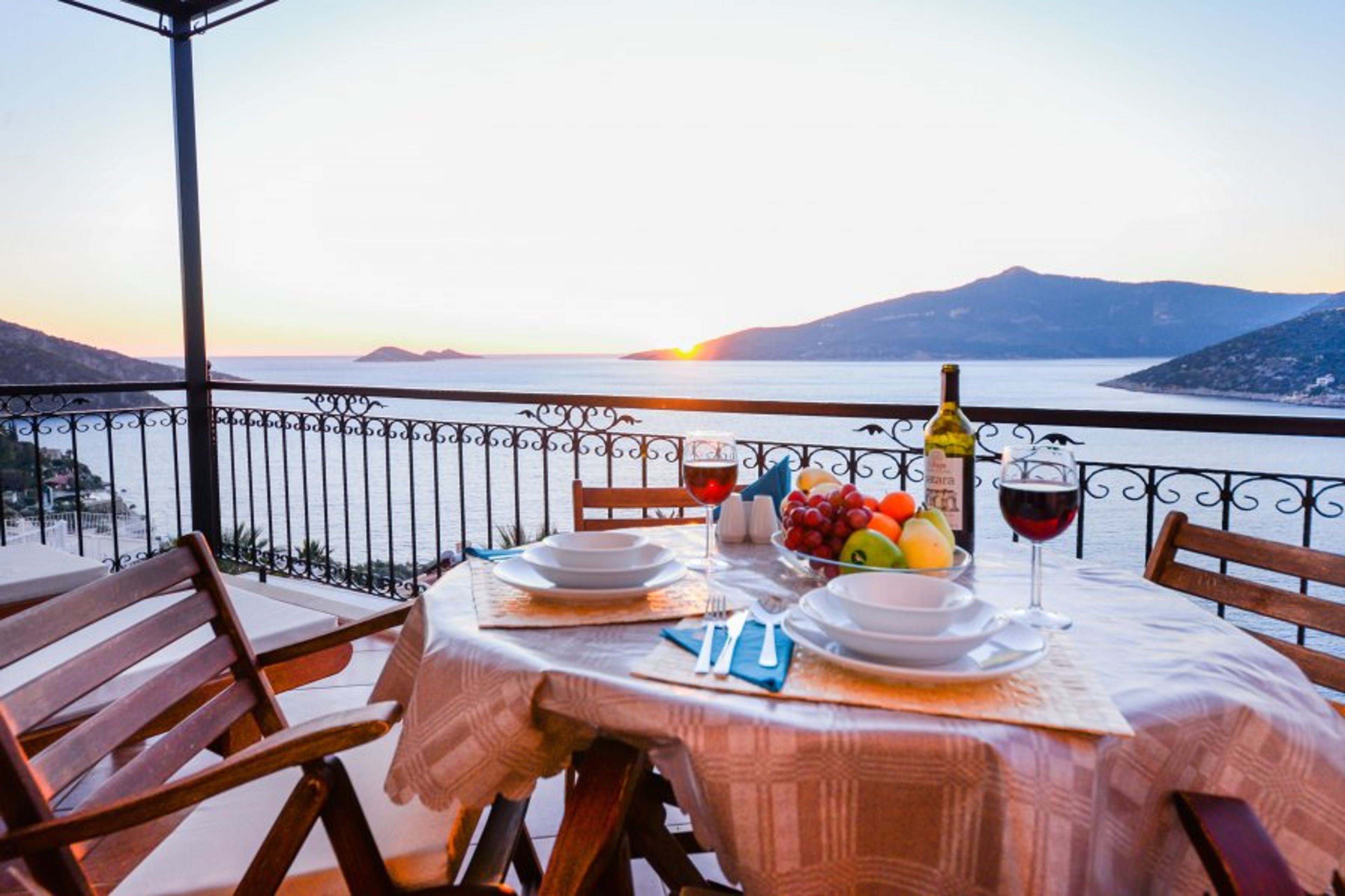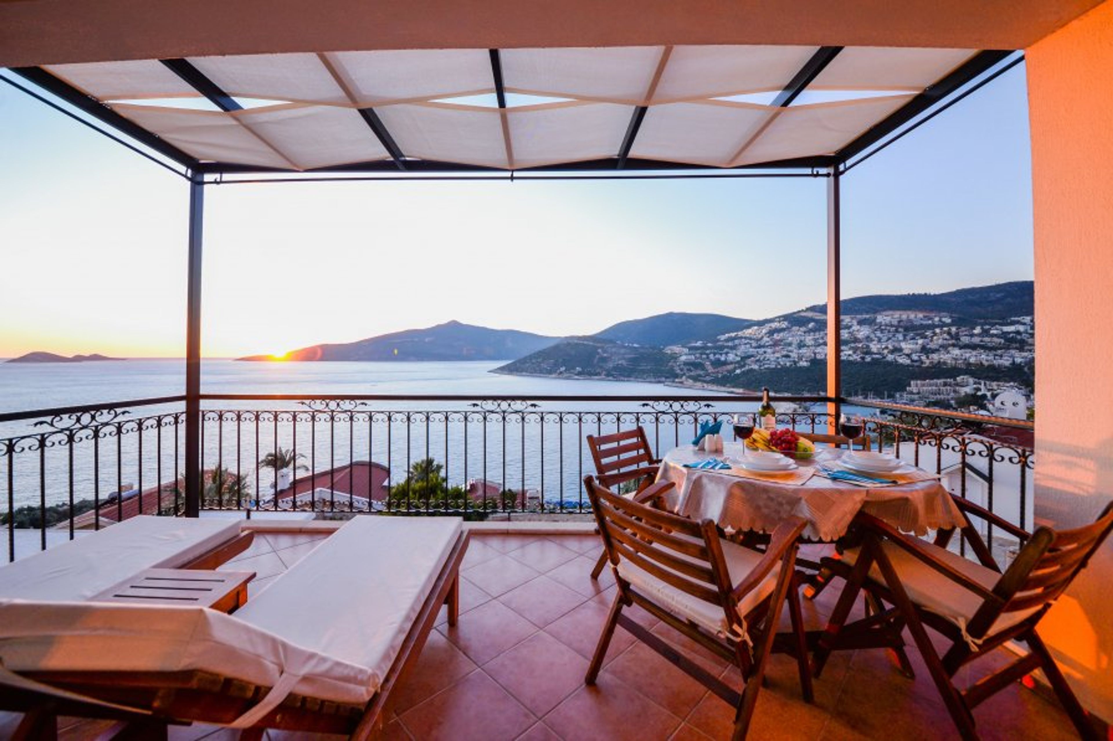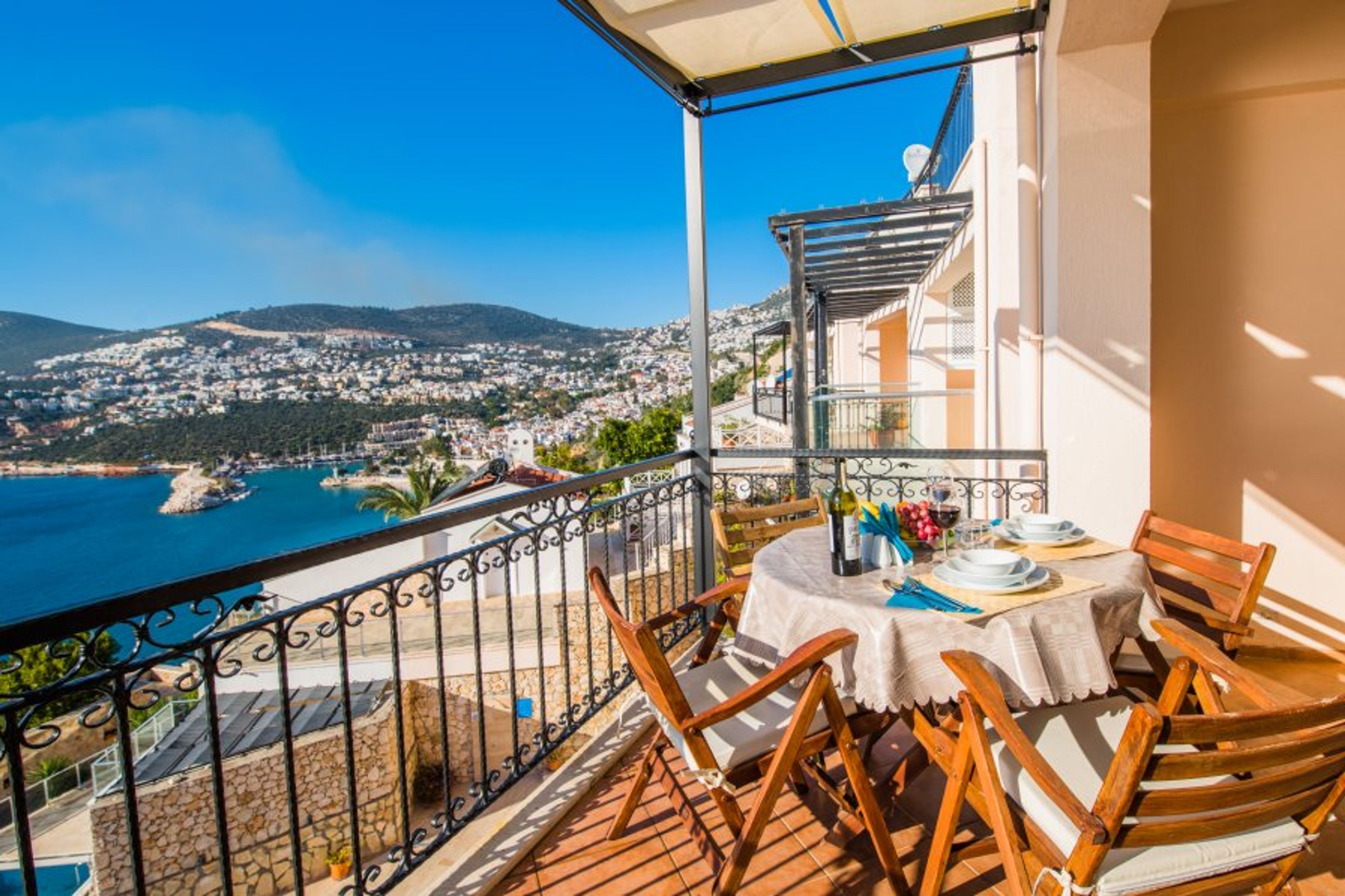 The perfect setting - Olympos 5 has the most stunning, uninterrupted, panoramic sea and island views from the balcony, lounge and shared pool and roof terrace. This lovely, contemporary apartment has a luxurious ambience owing to the white marble floors, beige marble bathroom and cloakroom and sleek white kitchen with eye level cooking facilities and designer fridge/freezer. There are 2 bedrooms; a double bedroom with Juliet balcony and a bedroom which has either a king sized bed or two single beds. There is a tiles tiled bathroom with walk-in, wet room style shower, marble sink and toilet plus an additional cloakroom (also finished in marble with marble sink). The apartment is situated in the sought after area of Komurluk only a 10 minute walk to picturesque Kalkan with its whitewashed houses festooned with bougainvillea and its many boutiques and famous rooftop restaurants. Its a 5 minute walk down steps to the Palm Beach club with its lovely gardens from where you can take a free water taxi to the harbour or walk 10 mins to Kalkan town beach. The pool is shared between just 12 apartments and has sun beds, parasols, a shower and a shady arcade. The large balcony has a glass balustrade to make the most of the fabulous views, a dining table and chairs for 6 and two stylish sun beds.