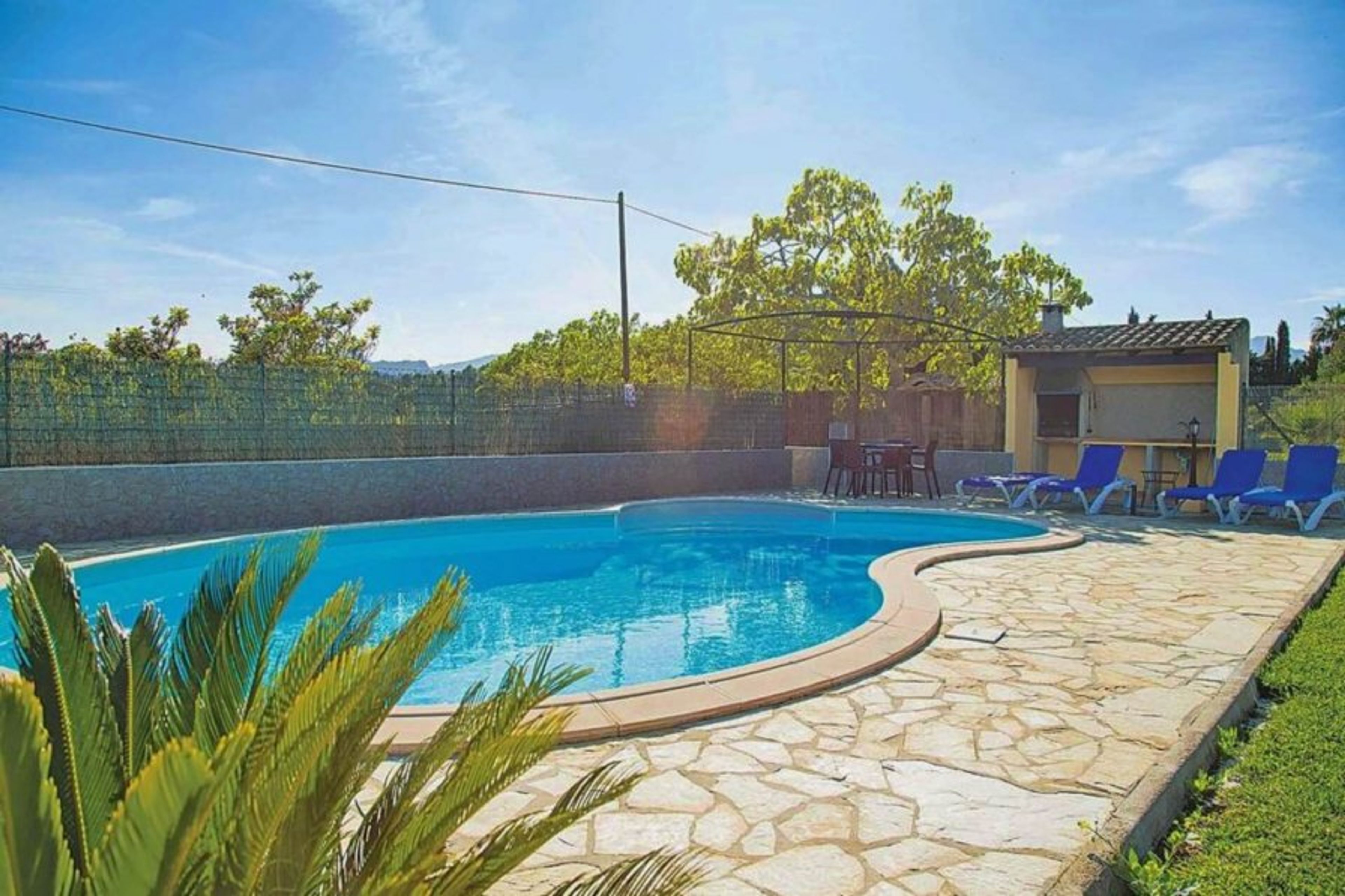 Outdoors, Villa Vilar offers everything necessary to enjoy relaxing holidays. You can enjoy an outdoor space with a table and dining chairs in the shade, where you can savour a typical Spanish meal, prepared on the brick barbecue. The pool is surrounded by beautiful lawn gardens dotted with bushes and palm trees, creating a quiet and private environment ideal for sunbathing or cooling off during the hot summer afternoons.