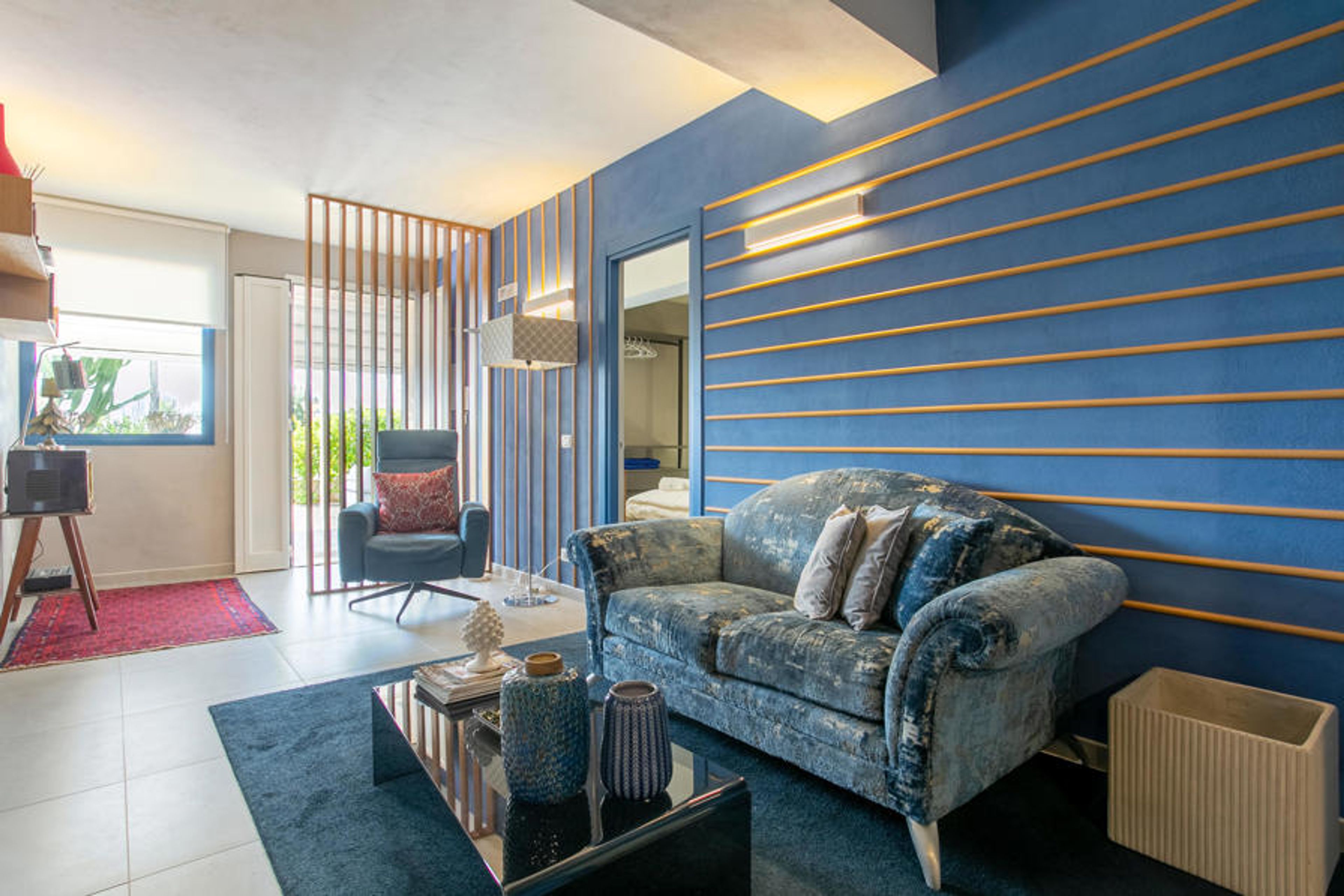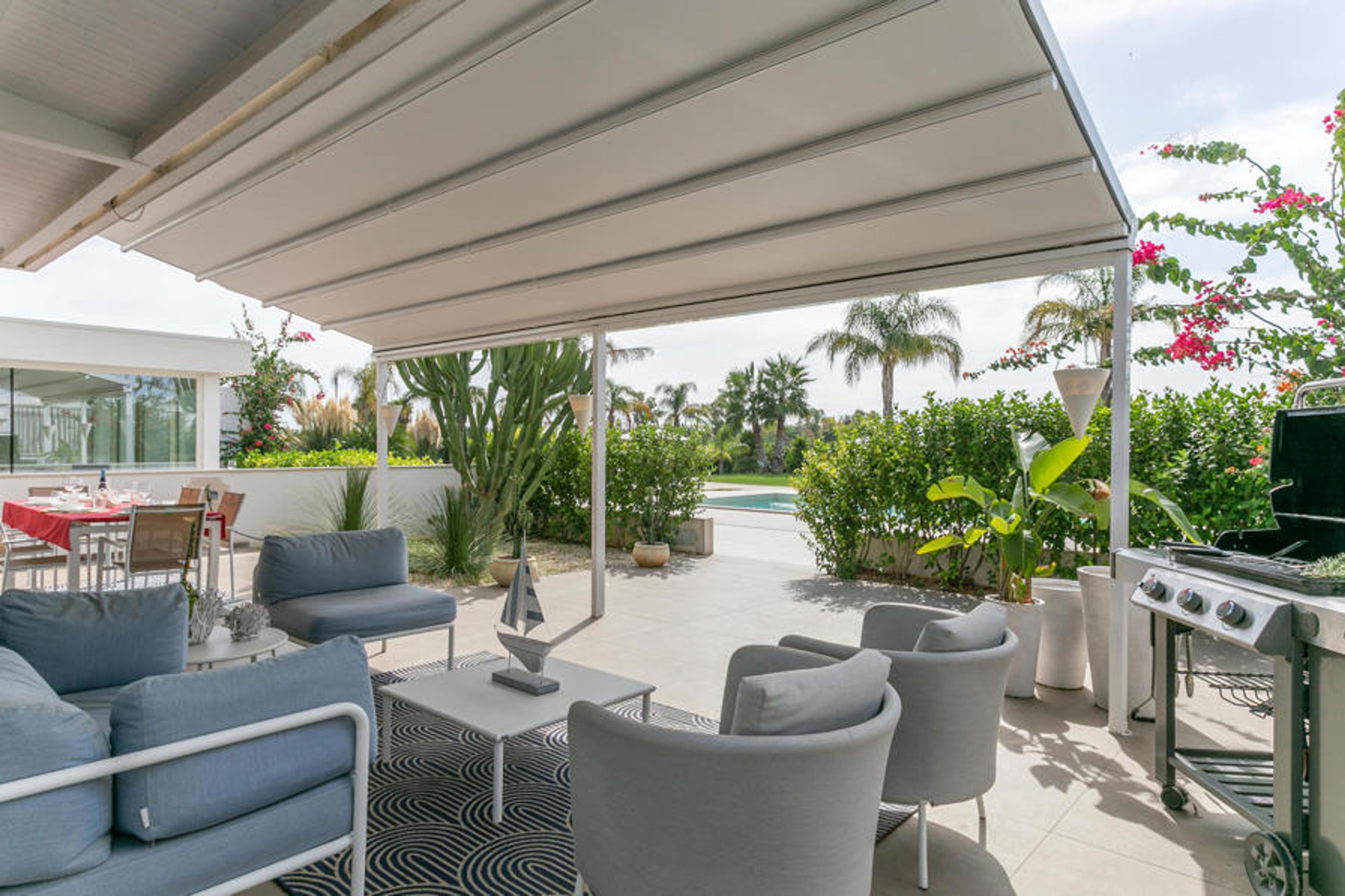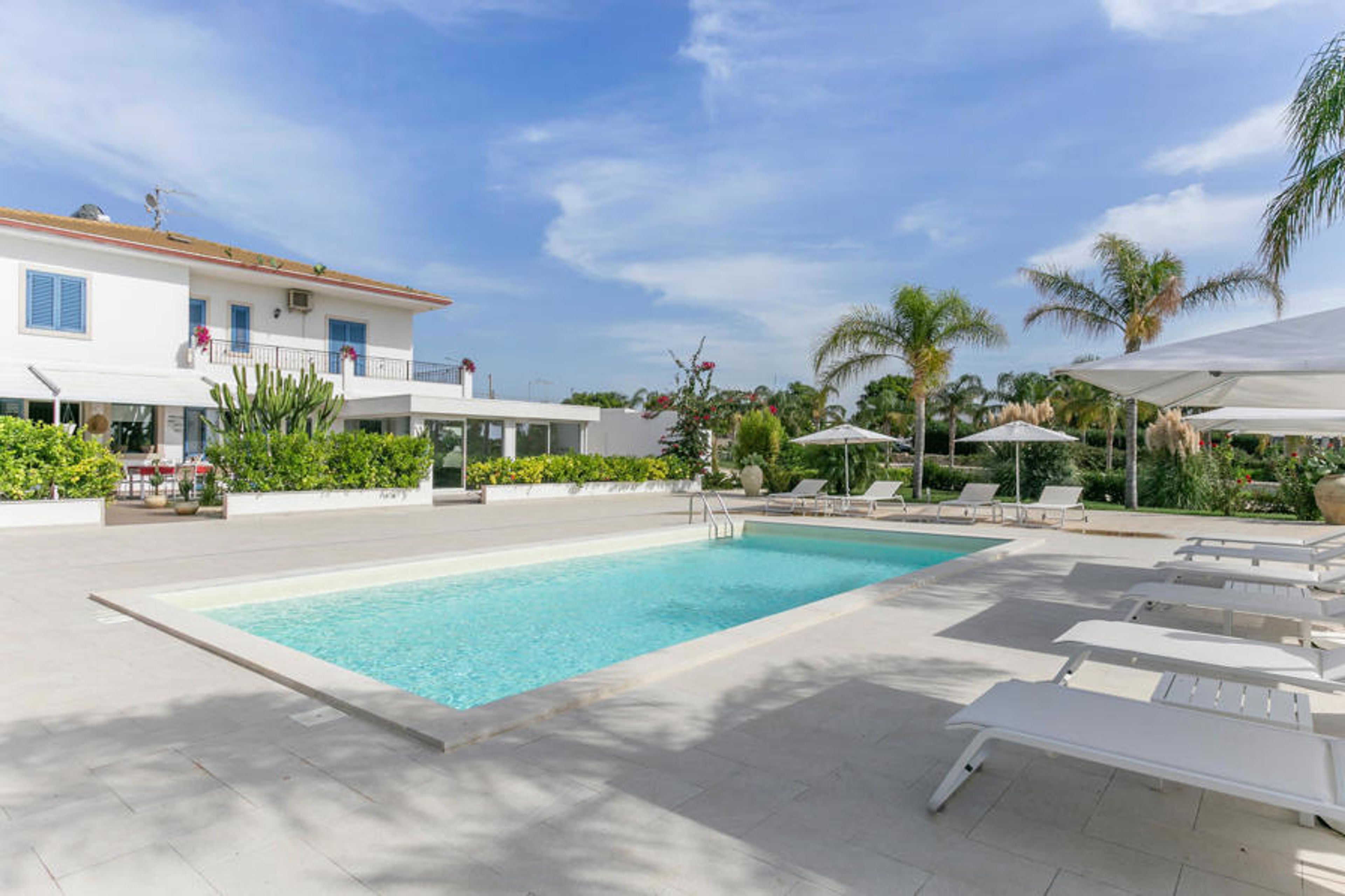 This elegant holiday home is located near Marina di Ragusa, just a few hundred metres from the mouth of the River Irminio and the Irminio nature reserve - known as an observation point for migratory birds from nearby Africa. It is set in a large plot of approx. 5000 m2, which is partly unspoilt - in accordance with the regulations of the nature reserve - and partly planted with lawns, stone walls and palm trees. Guests have access to a pool with sun terrace, sun loungers and parasols. In front of the house there are two other equipped verandas, one with a large parasol and the other with a fixed cover. Both are also equipped with table, chairs and seating for relaxing overlooking the pool.