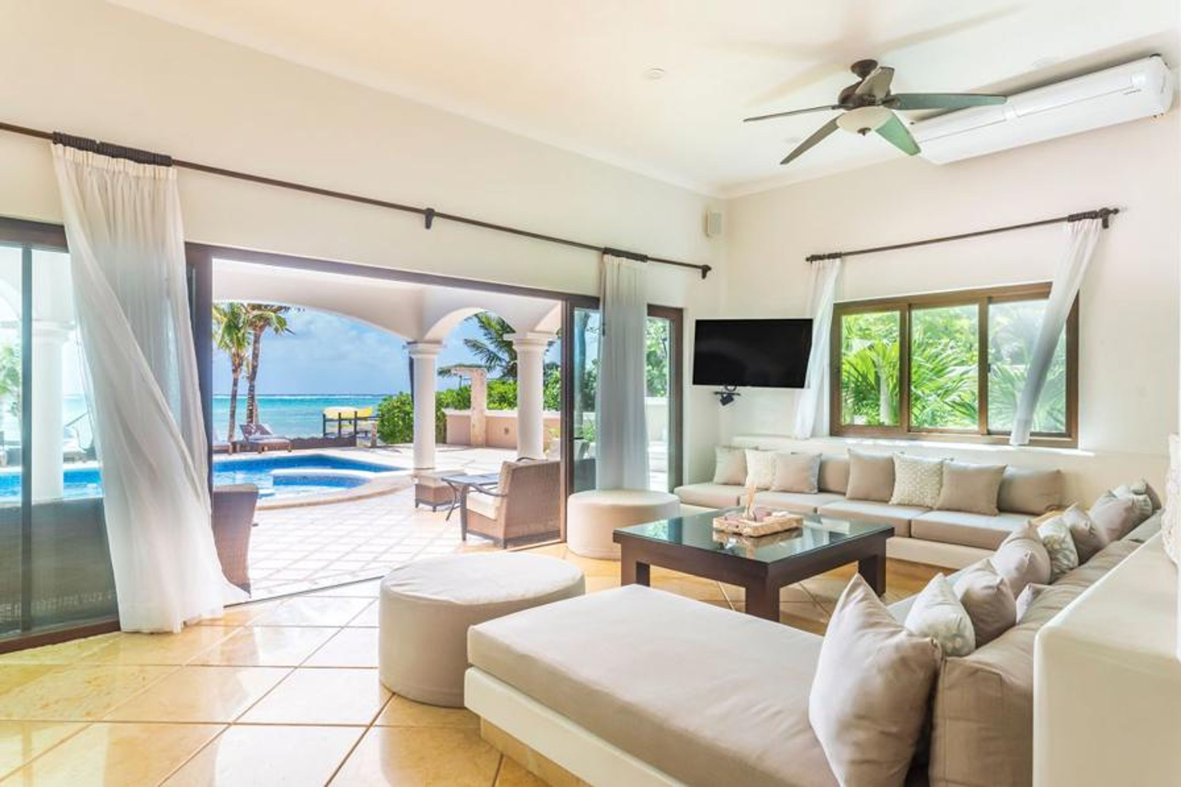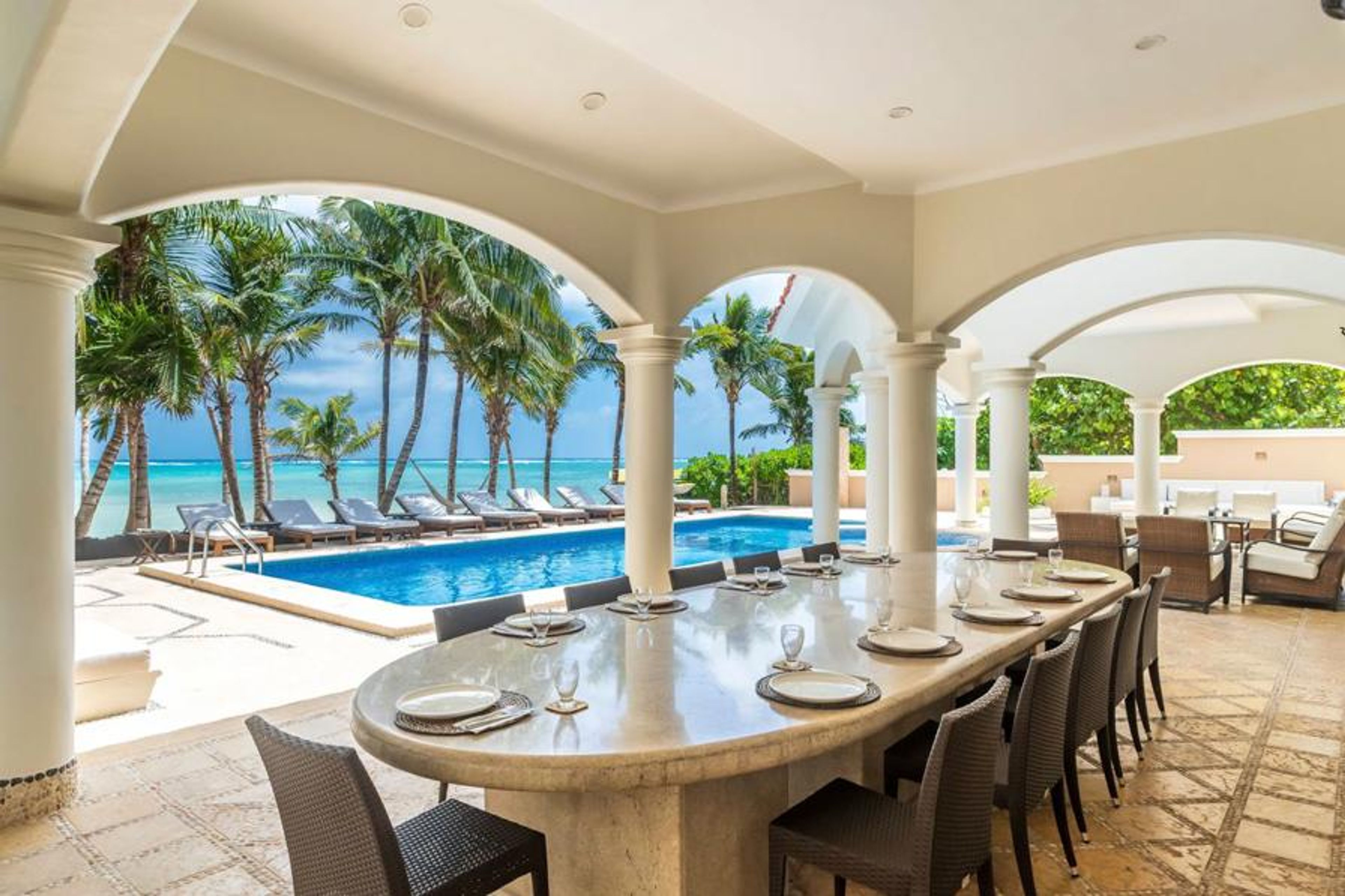 Guests won’t fail to be impressed by the beautiful terracotta exterior of this incredible beachfront property. The pool takes pride of place, and is surrounded by sun loungers shaded by exotic palms. There is a shaded outdoor dining area that features a marble table set under a beautiful pillared archway, as well as a luxurious outdoor lounge area; the perfect space for alfresco drinks and meals, all to be enjoyed whilst taking in the breathtaking ocean views, and there are outdoor showers so that when you’ve had a quick dip in the pool you can head back to the outdoor grill area, margarita in hand, to grab another quick bite.