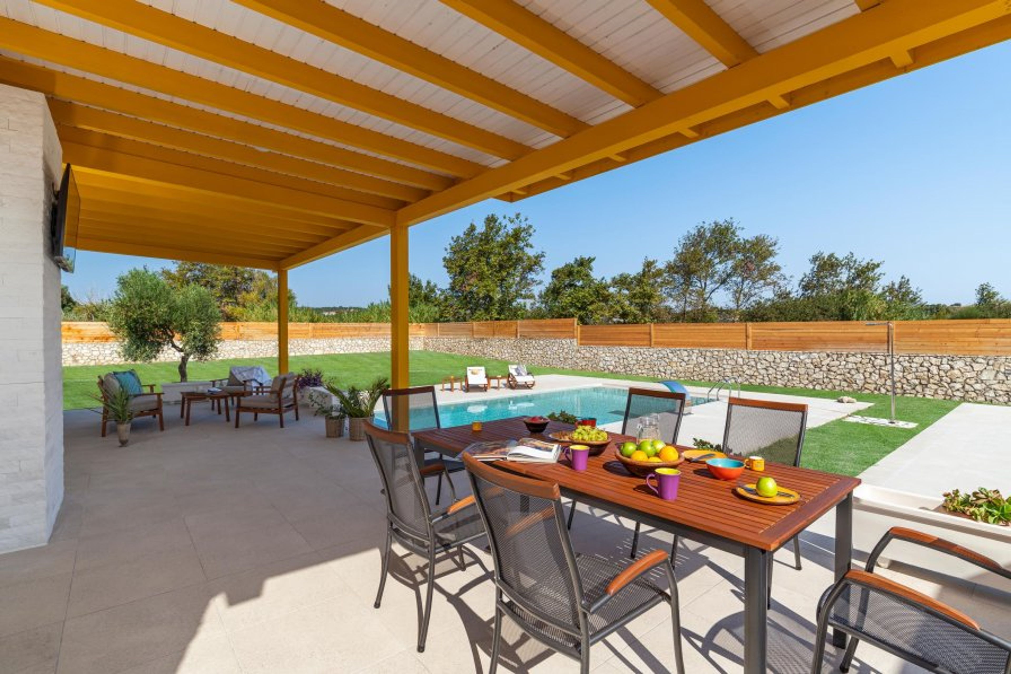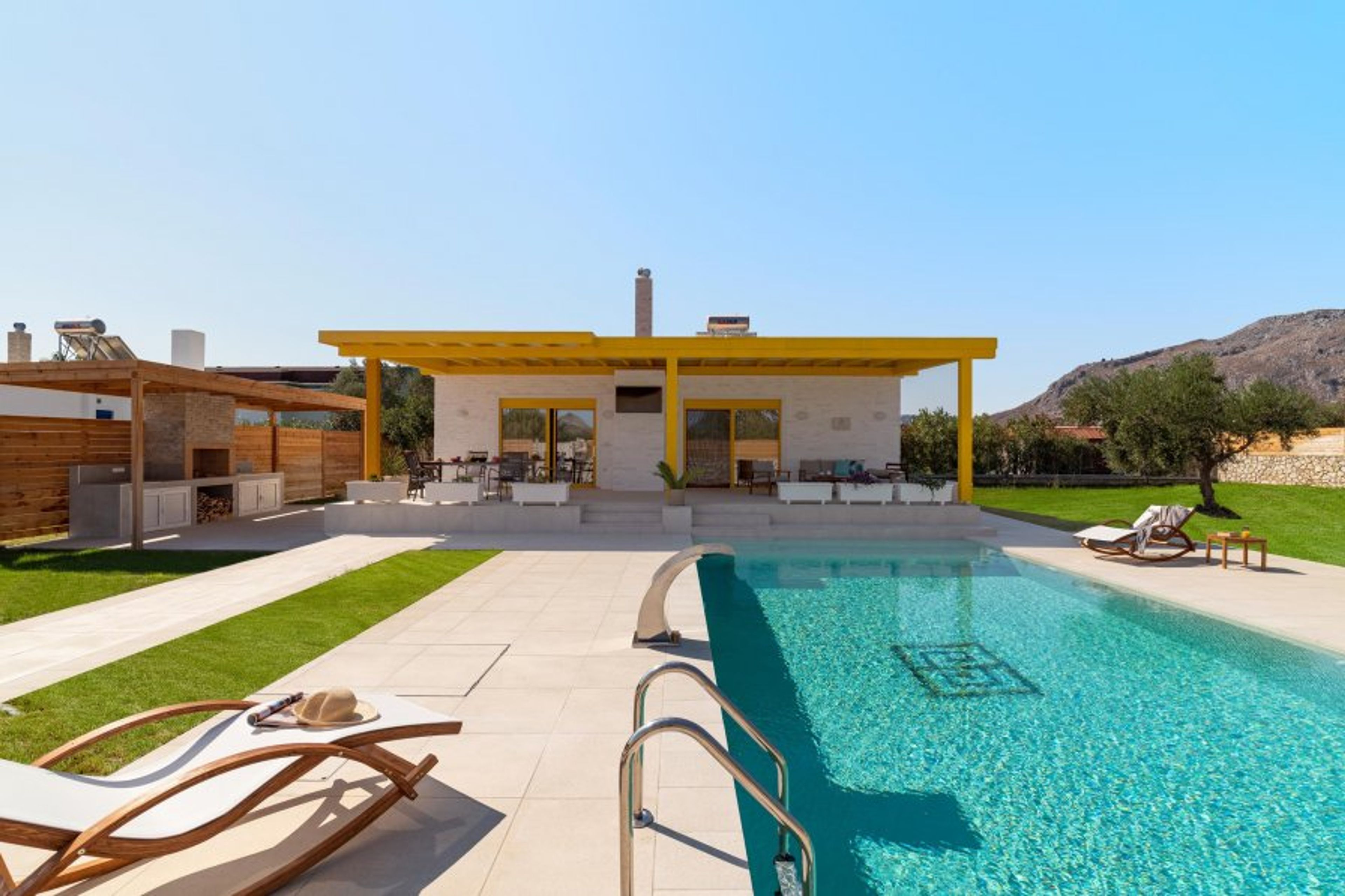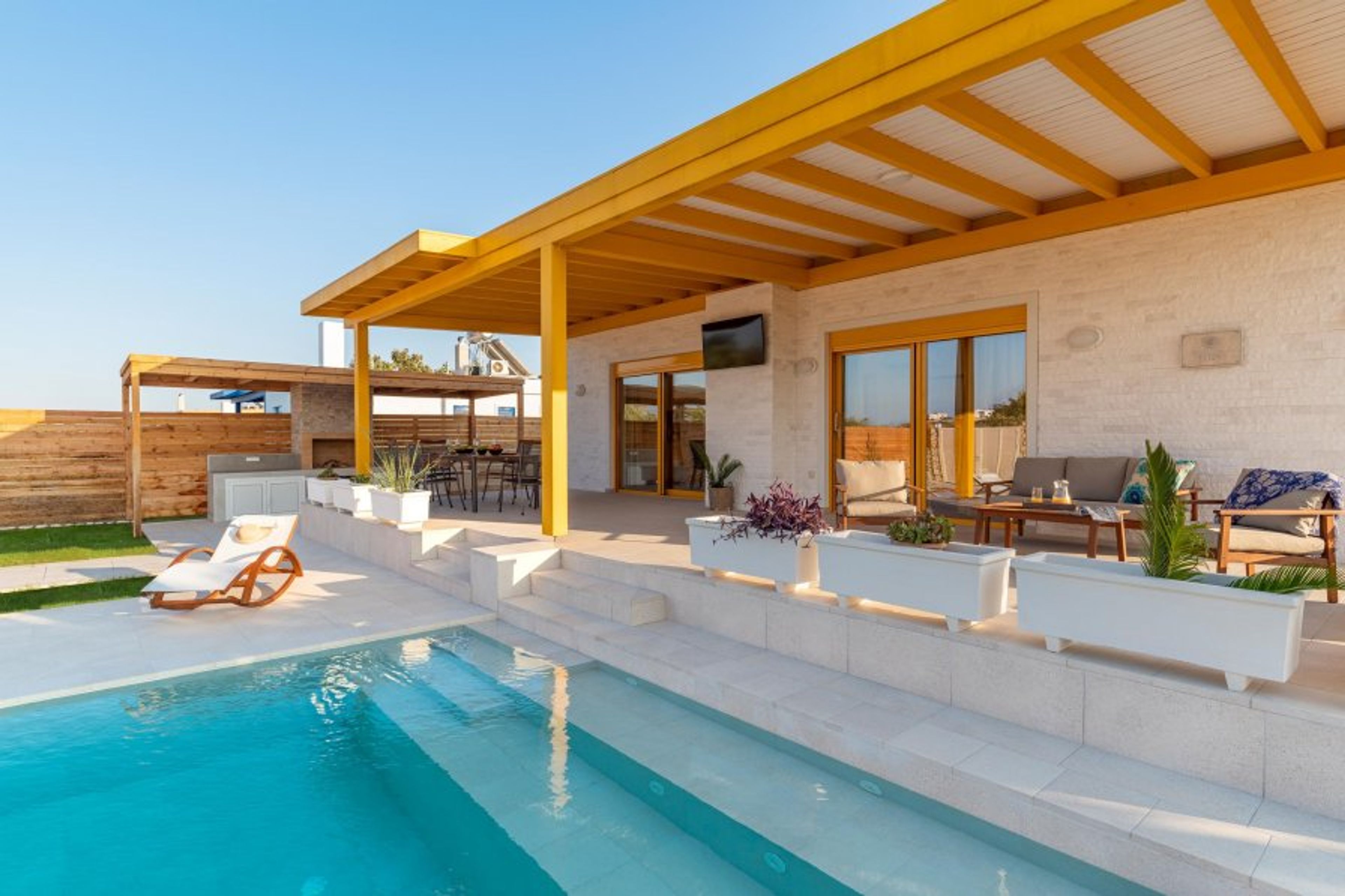Villa Ilios has two fully air-conditioned bedrooms with ensuite bathrooms with showers and a comfy double sofa-bed in the living room. There is also one bathroom with a shower next to the living room. The kitchen is fully equipped, suitable for any meal preparation accompanied by the sitting area. The interior design is absolutely incredible with a tasteful decoration. Guests will find flat screen TVs and free Wi-Fi access throughout the property. Outdoors, there’s a magnificent private swimming pool and sitting areas to relax under the Aegean sun. The BBQ facility and utensils offer you the opportunity to enjoy outdoor al fresco dinners by the pool.