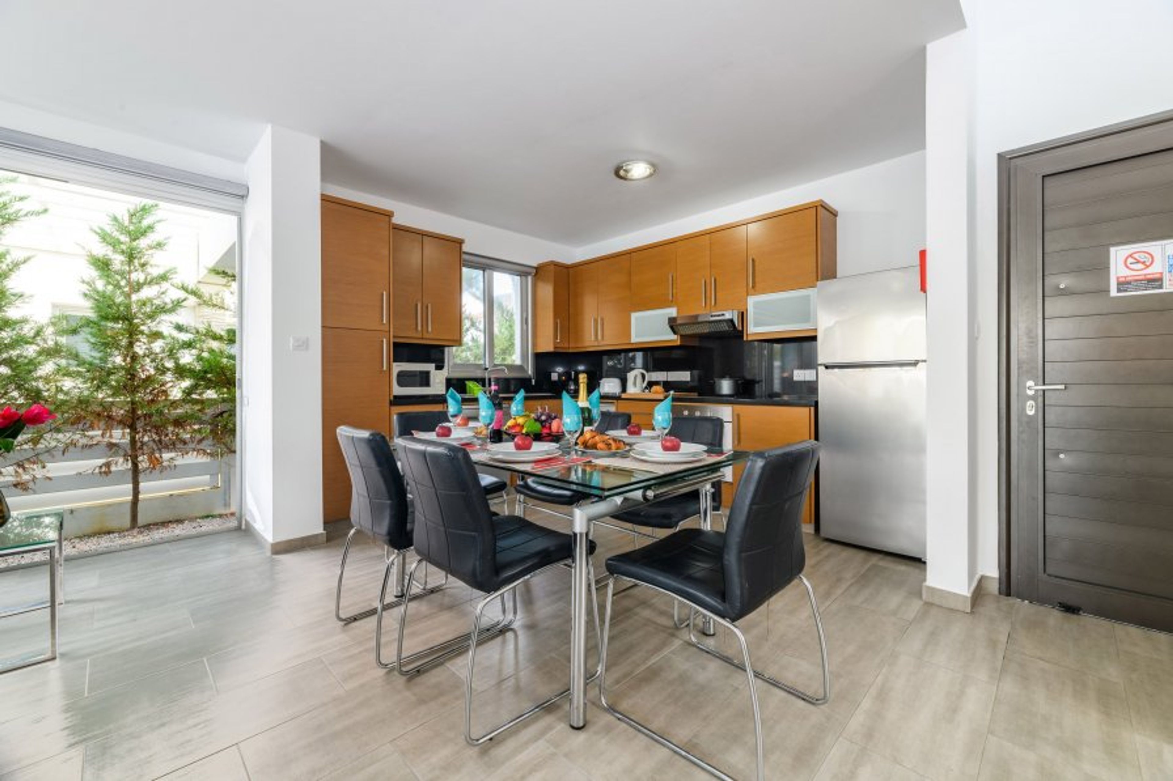 The ground floor offers an open plan living room area with a fully equipped kitchen, a dinning table for 6, a comfortable sofa set, a large flat screen TV and Satellite TV Box with access to 1000+ international channels. The living room opens up to a patio. The outside offers a private swimming pool, garden, a dining area and a BBQ.