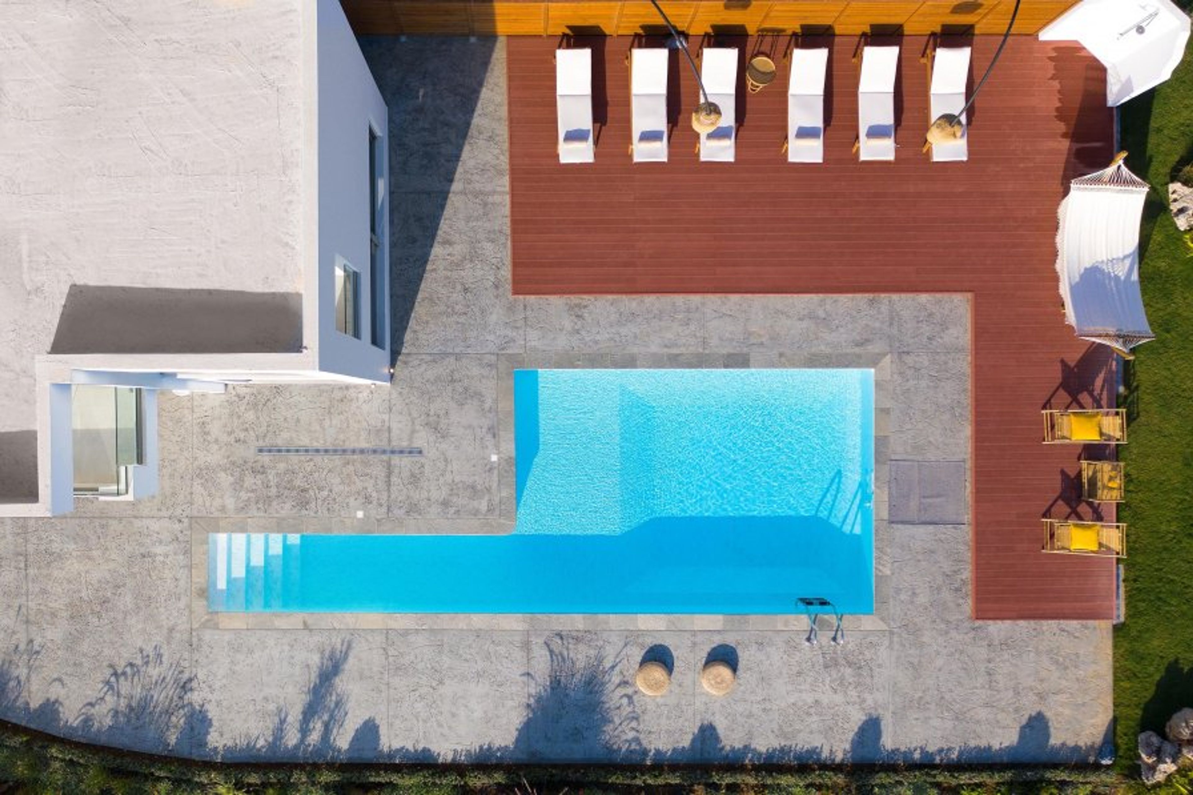 On the upper level, Pounentis villa, offers 2 spacious double bedded rooms. Two bedrooms owns an en-suite bathroom with a stylish shower and a chic furnished balcony with a remarkable view to the sea. On the ground floor there’s a fully equipped kitchen and a spacious open plan dining / living area which has a comfy double sofa- bed one extra bathroom with a shower and one bedroom with double bed as well as a bathroom with a shower. Guests will also find a flat screen with satellite channels. The cozy living room opens to an inspiring furnished veranda with direct access to the architectural statement of the villa, the swimming pool along with the BBQ facilities. The private pool area in warm colors has stylish sunbeds with comfortable cushions and parasols encircled by lush lawns and a well-tended garden. There, you can work on your tan and enjoy the unique Greek summer weather. Pounentis Villa is situated next to Maistros Villa. These two identical villas ensure complete privacy for guests, each featuring its own private pool and amenities.