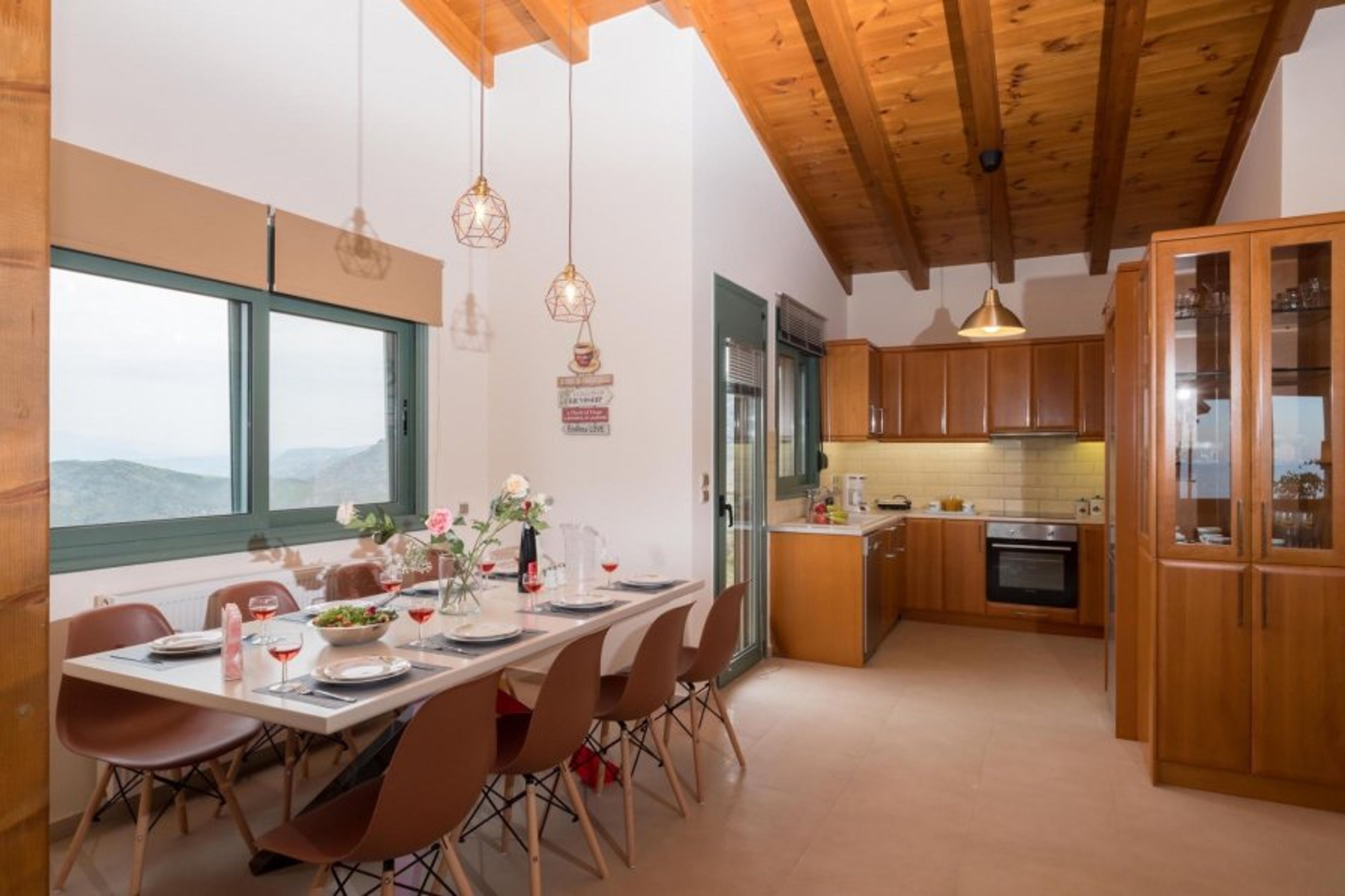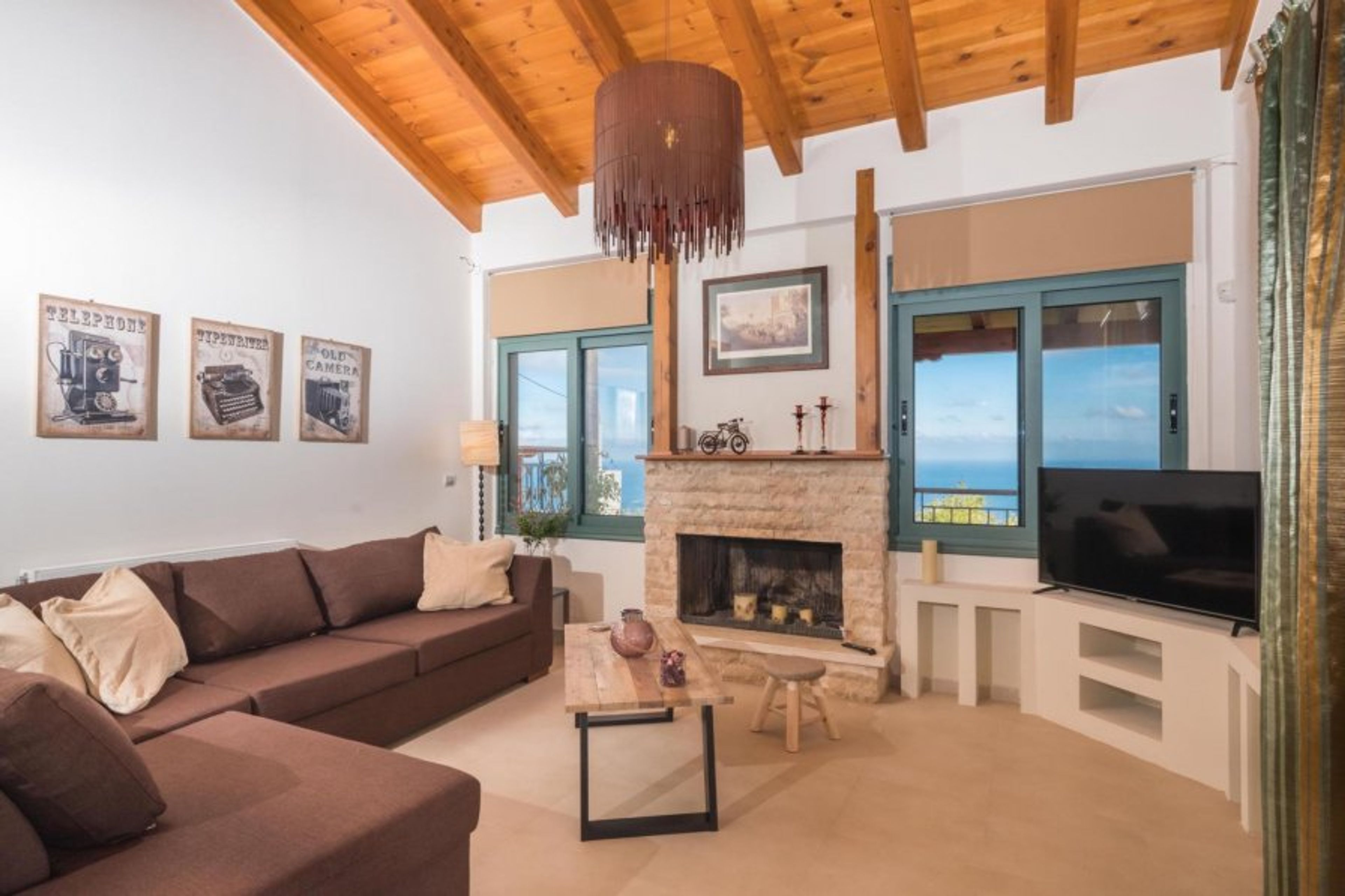 Inside, Villa Eolos is set over 2 floors and measures 200sqm in size. On the main floor, from where the villa is accessed, there are a spacious lounge (satellite TV, wi-fi, air-con) with adjoining fully equipped kitchen (including dishwasher and all the most modern appliances), indoor dining area and WC. On this floor there is also an en-suite double bedroom and a huge bedroom with mezzanine and its own bathroom. The latter bedroom has a double sofa bed on the lower part of the room and a double bed on the attic level.