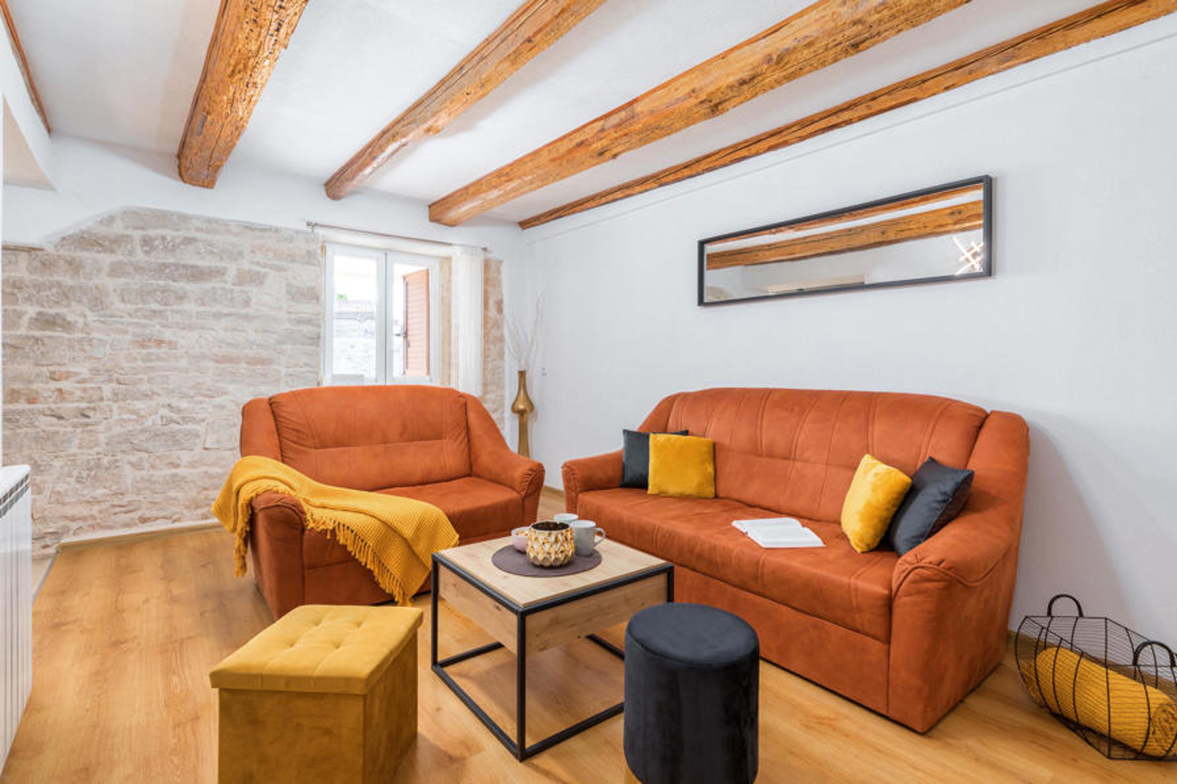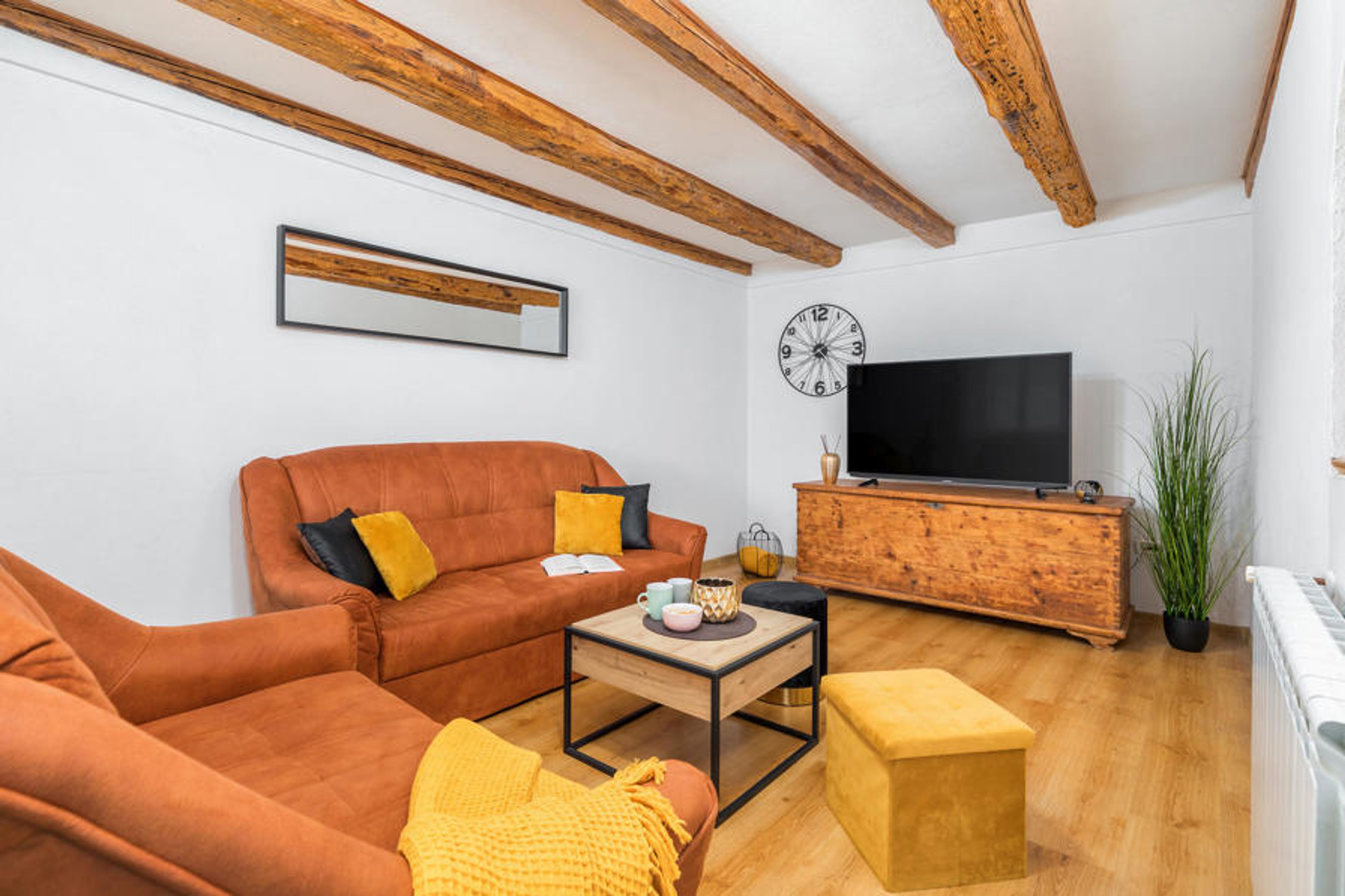 Spend an unforgettable vacation with the whole family in this tastefully furnished vacation home, which also offers plenty of space for a larger family. The exposed ceiling beams give the cozy kitchen-living room a quaint flair, and from the windows of the house you can enjoy an impressive view over the countryside.