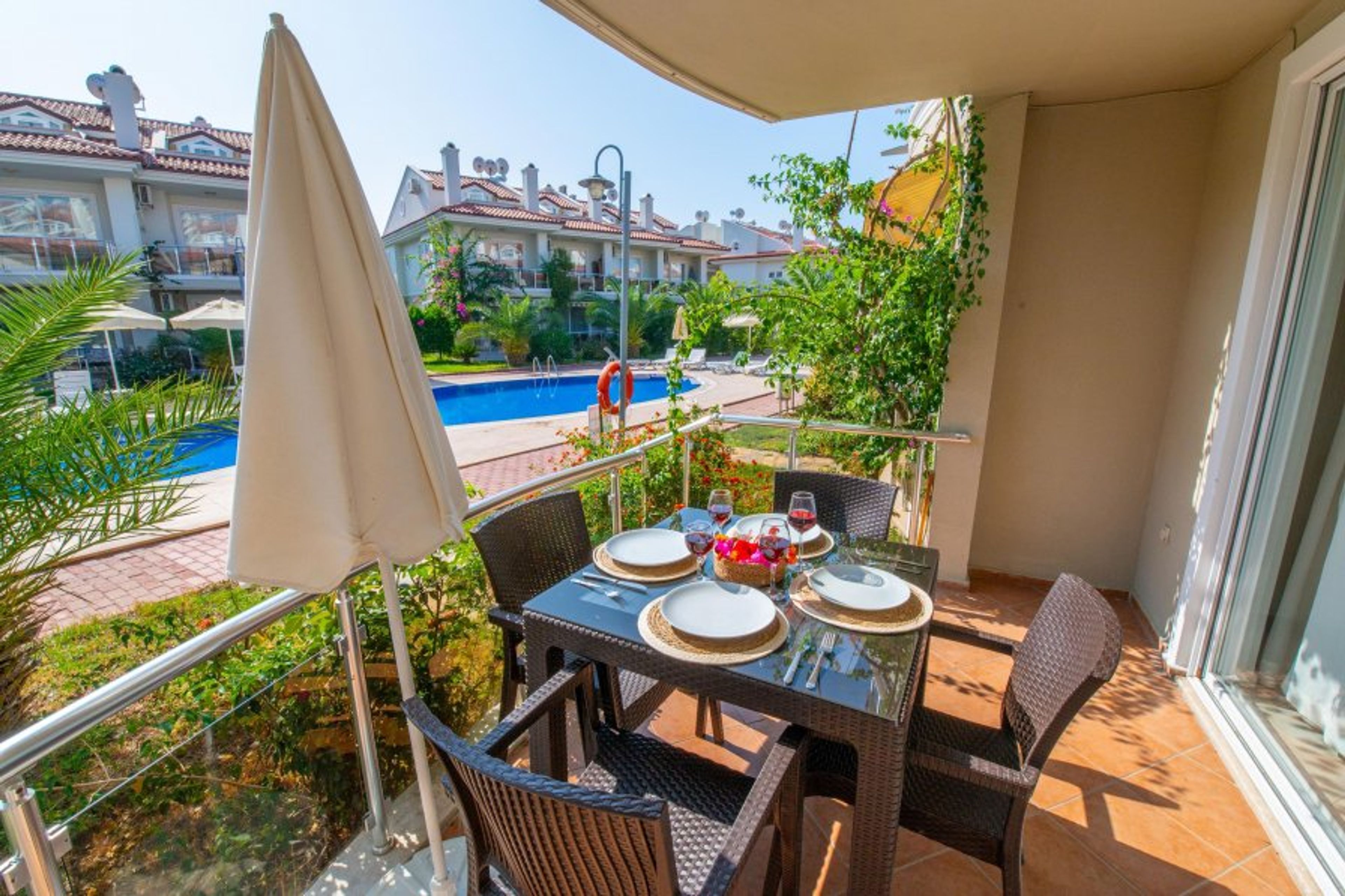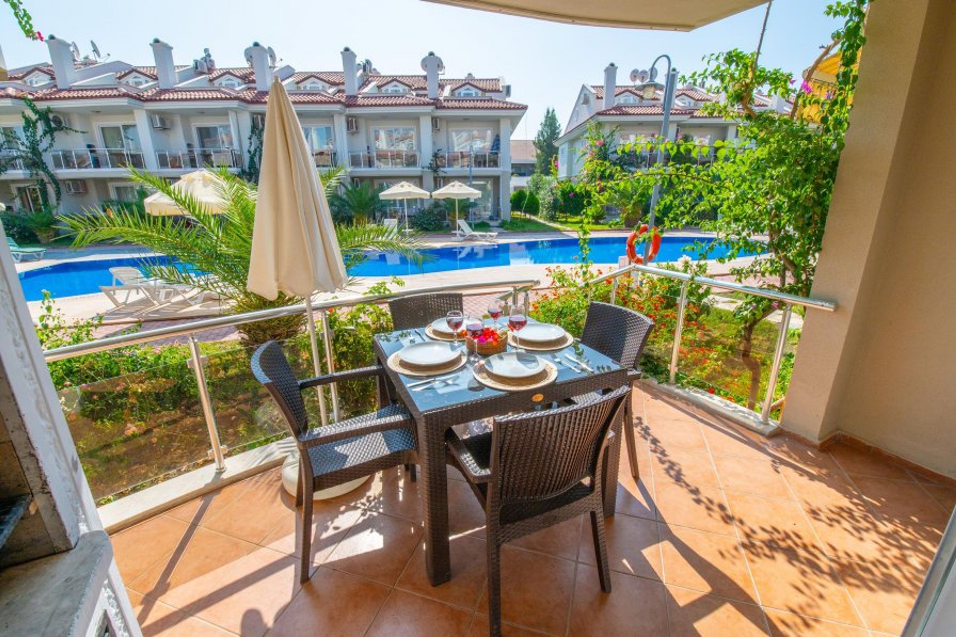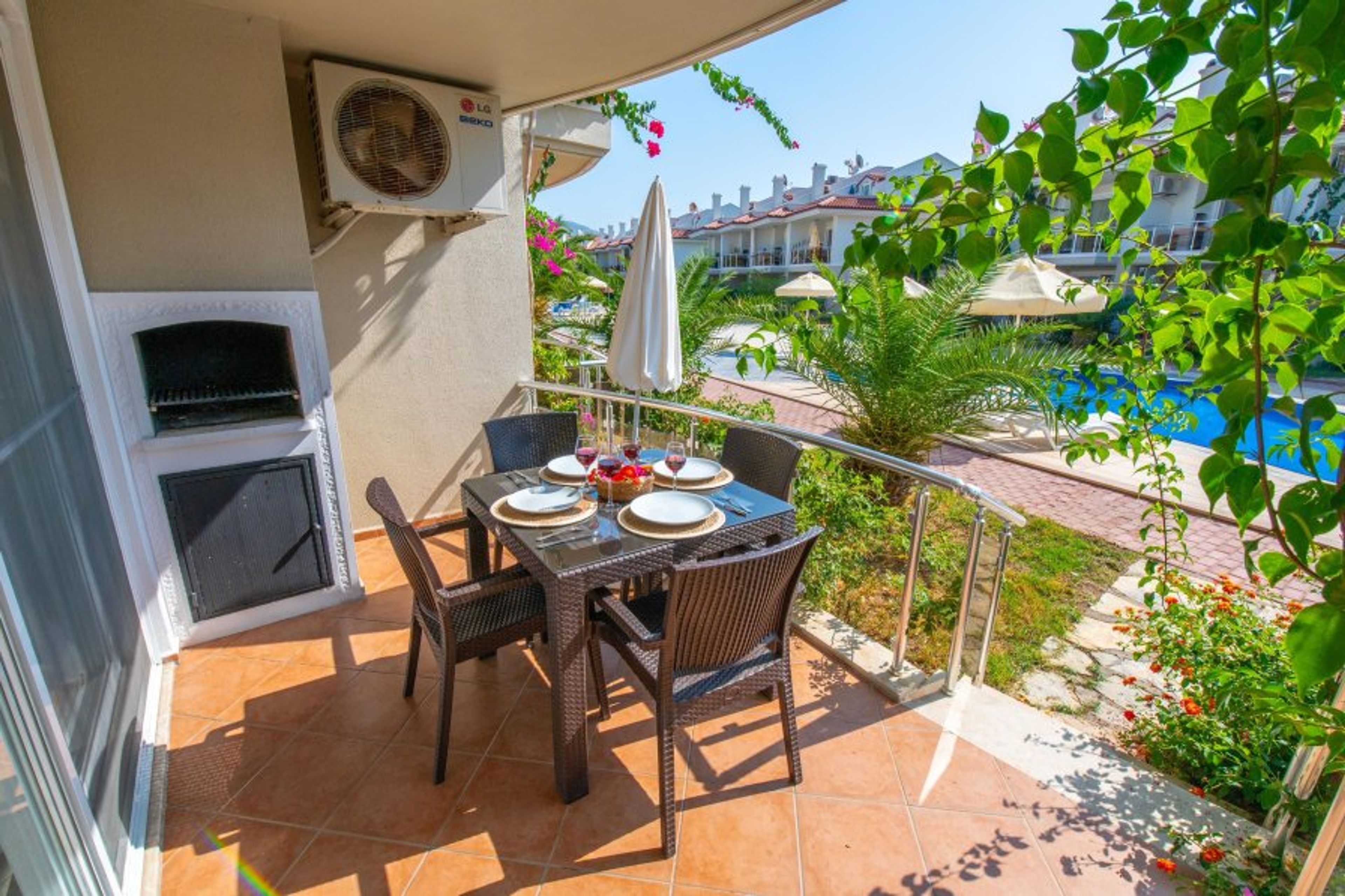 This fully air-conditioned 1 bedroom ground floor apartment has an open-plan kitchen which leads out onto the balcony, 1 bedroom and 1 bathroom (Extra bed/baby cot available). Sunset Beach Club provides you with a fun, family and relaxed atmosphere which will make it a holiday to remember. With a large balcony dining area, you can enjoy your BUİLT-İN BBQ or a cocktail whilst watching the poolside or chill out sunbathing around one of our many pools with beautiful sea views.