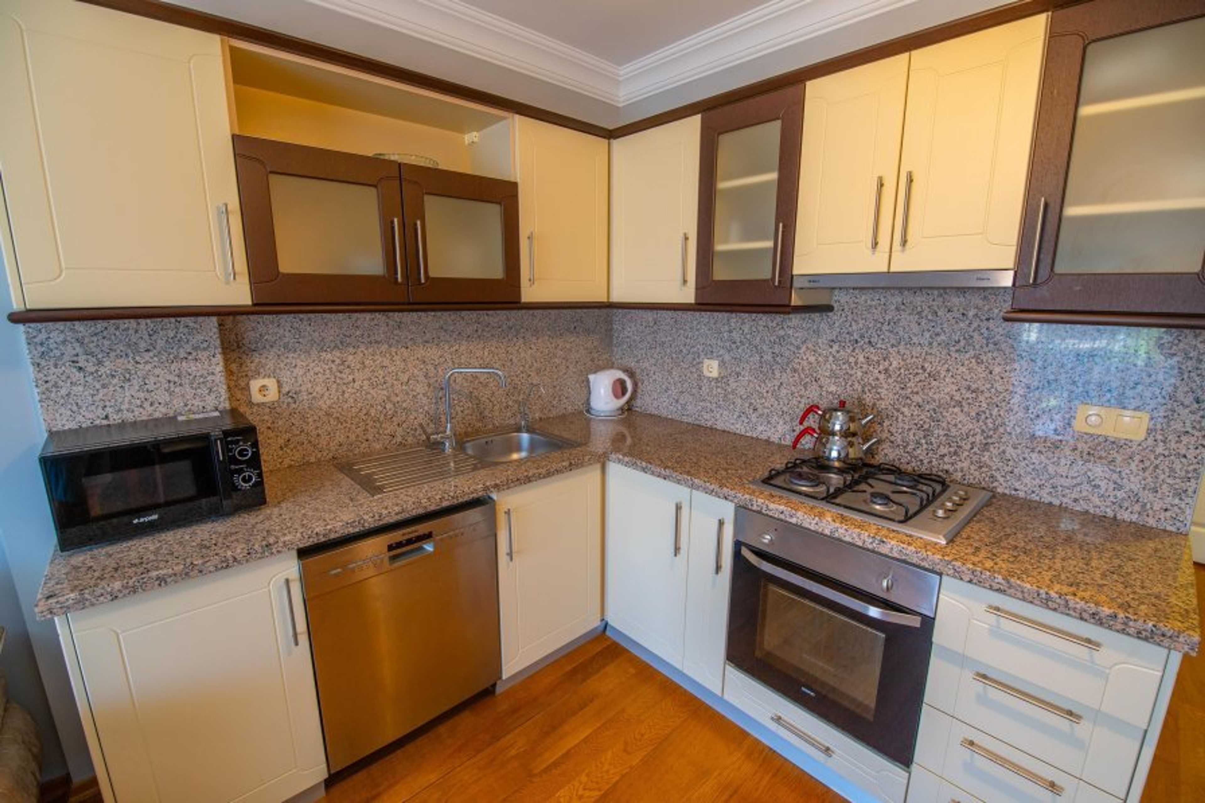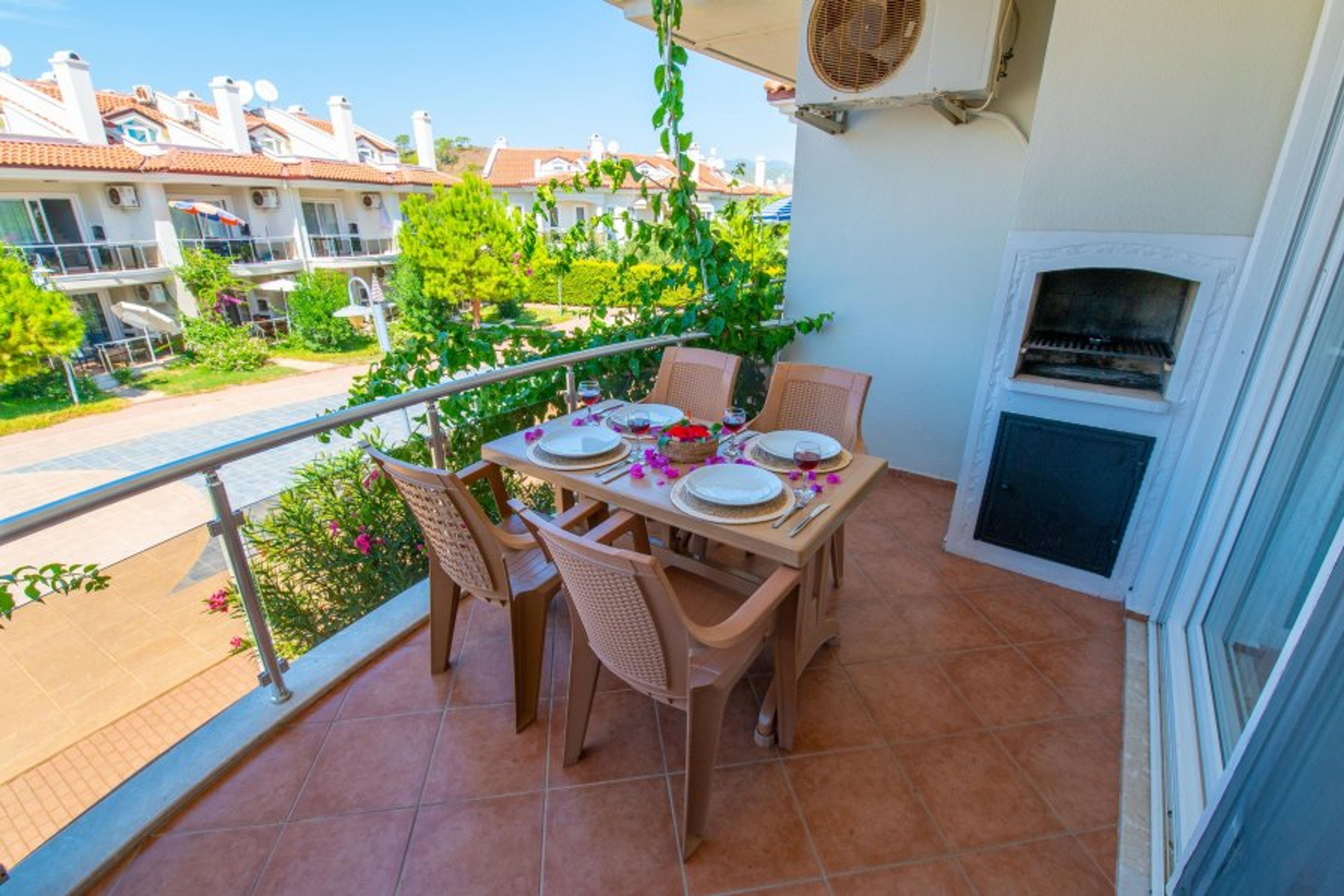 This 2 bedroomed dream apart is located at Sunset Beach Club complex in Fethiye/Calis- Aqua Lettings. This fully air-conditioned 2 bedroom ground floor apartment has an open-plan kitchen which leads out onto the balcony. 2 bathrooms, 1 located on the first floor and 1 on the second with Jacuzzi. (Extra bed/baby cot available). With a large balcony dining area, you can enjoy your BUILT-IN BBQ or a cocktail whilst watching the poolside or chill out sunbathing around one of our many pools.
