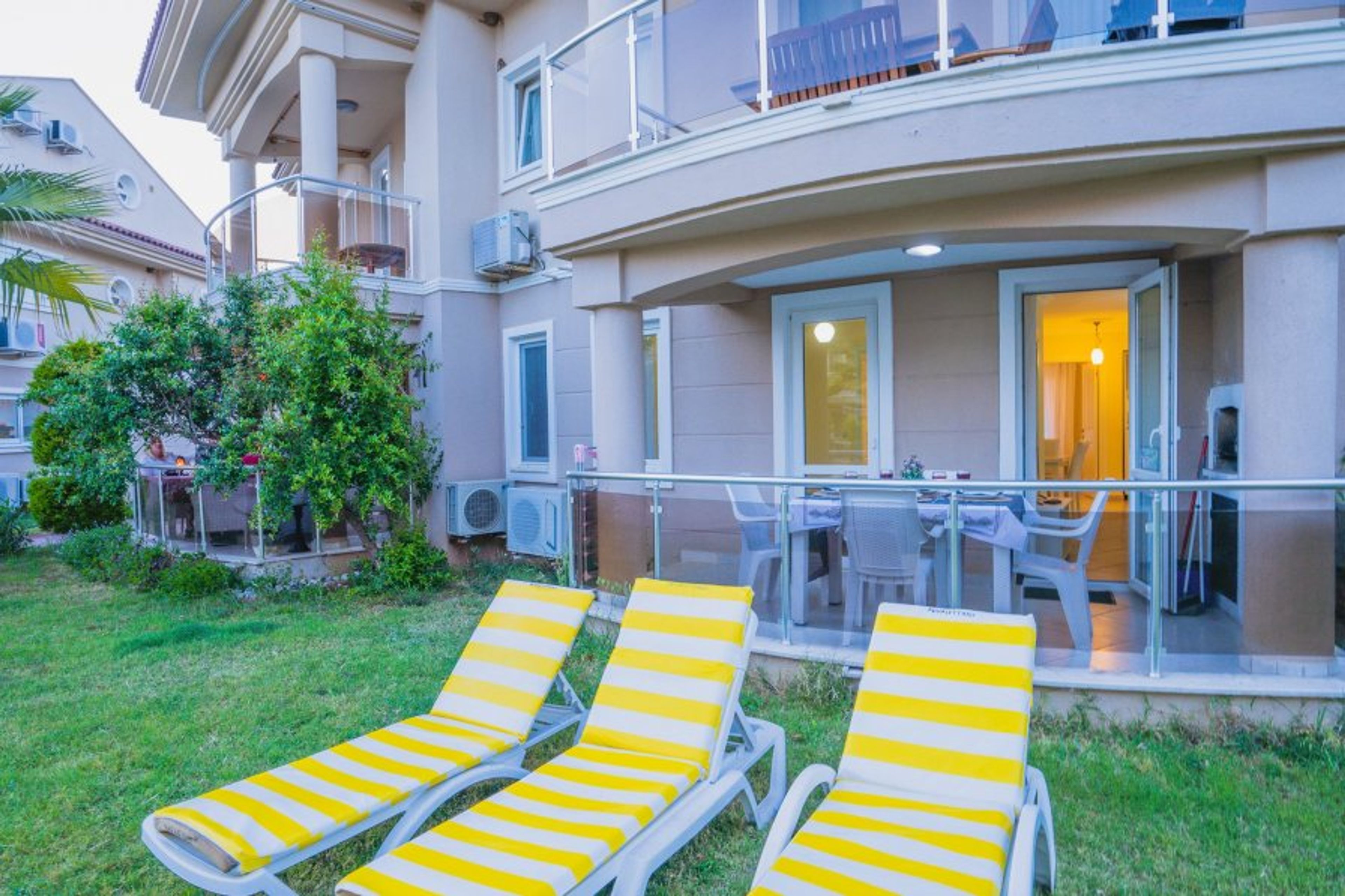 2 bedroom beachfront apartment located at Sunset Beach Club complex in Fethiye/Calis- Aqua Lettings This fully air-conditioned 2 bedroom ground floor apartment has an open-plan kitchen which leads out onto the balcony, 2 bedrooms and 2 bathrooms (Extra bed/baby cot available). With a large balcony dining area, you can enjoy your BUILT-IN BBQ or a cocktail whilst watching the poolside or chill out sunbathing around one of our many pools.