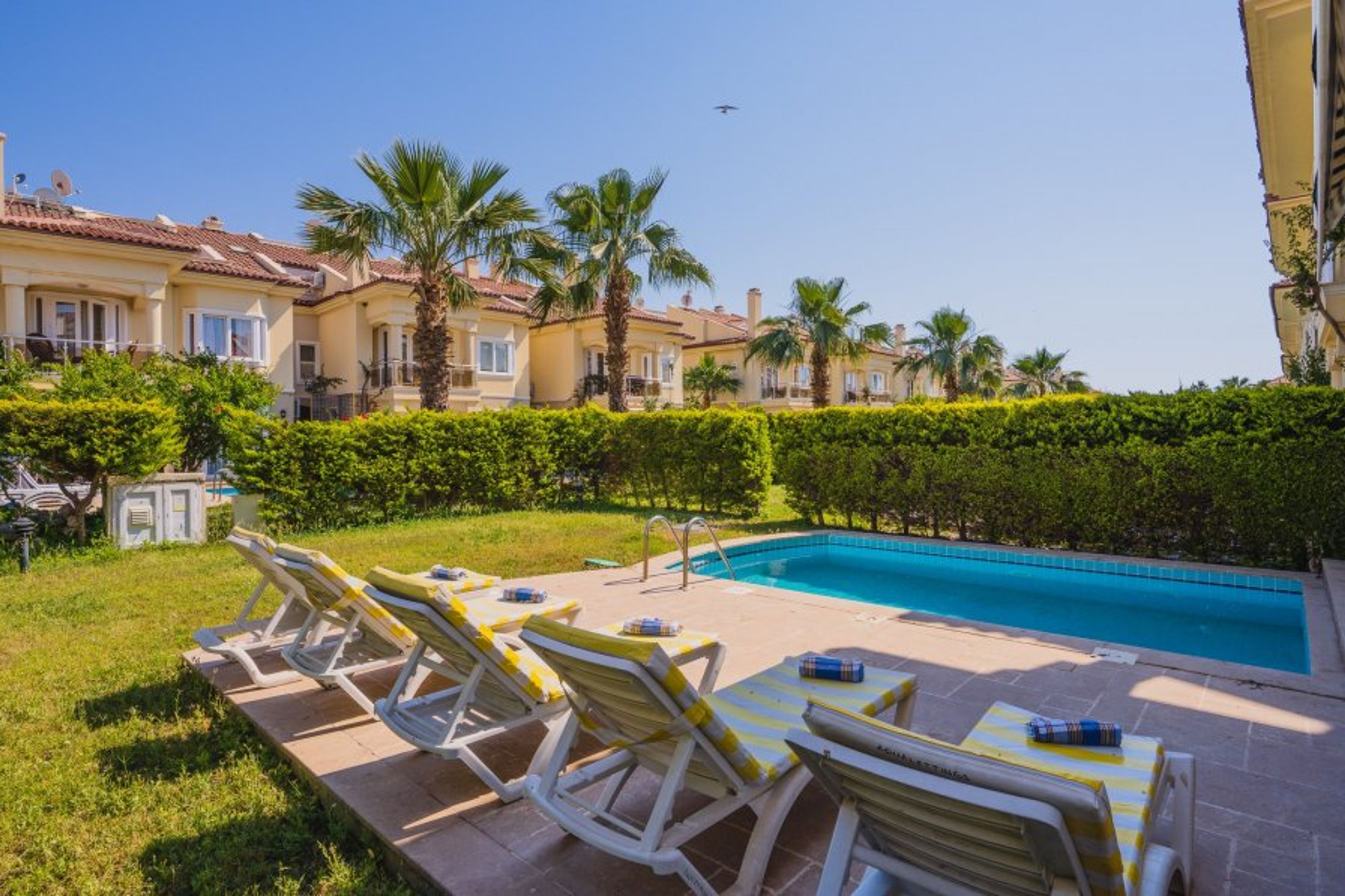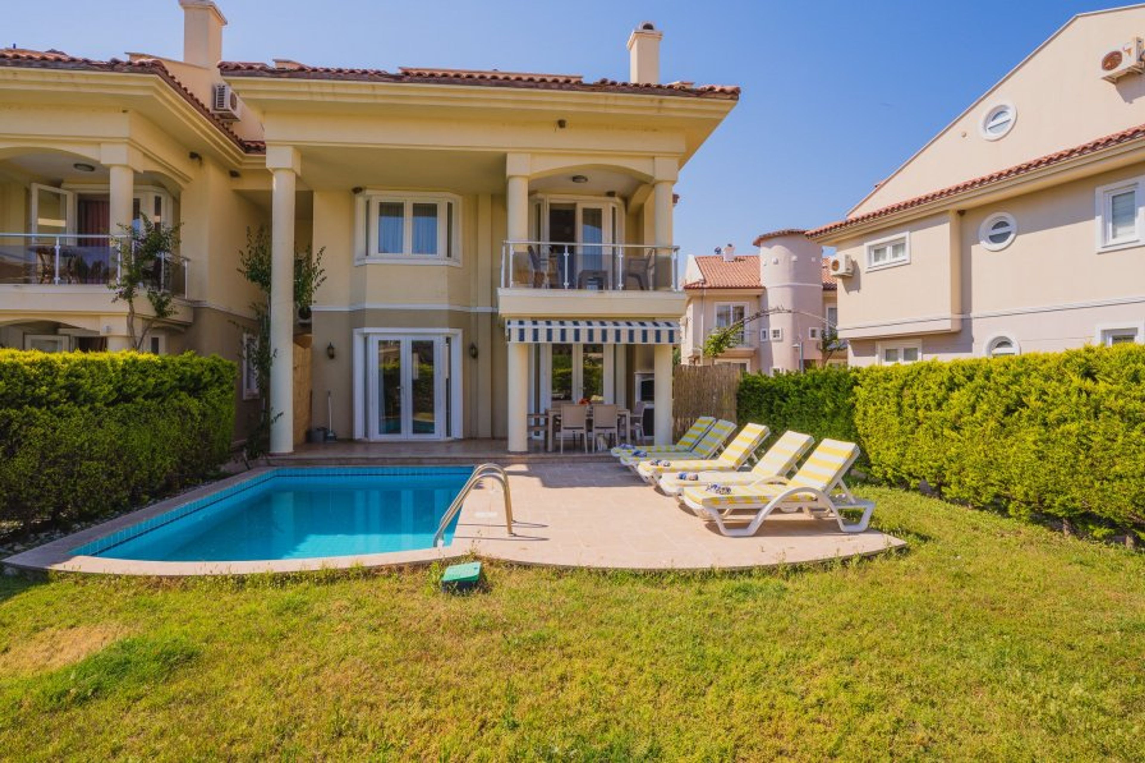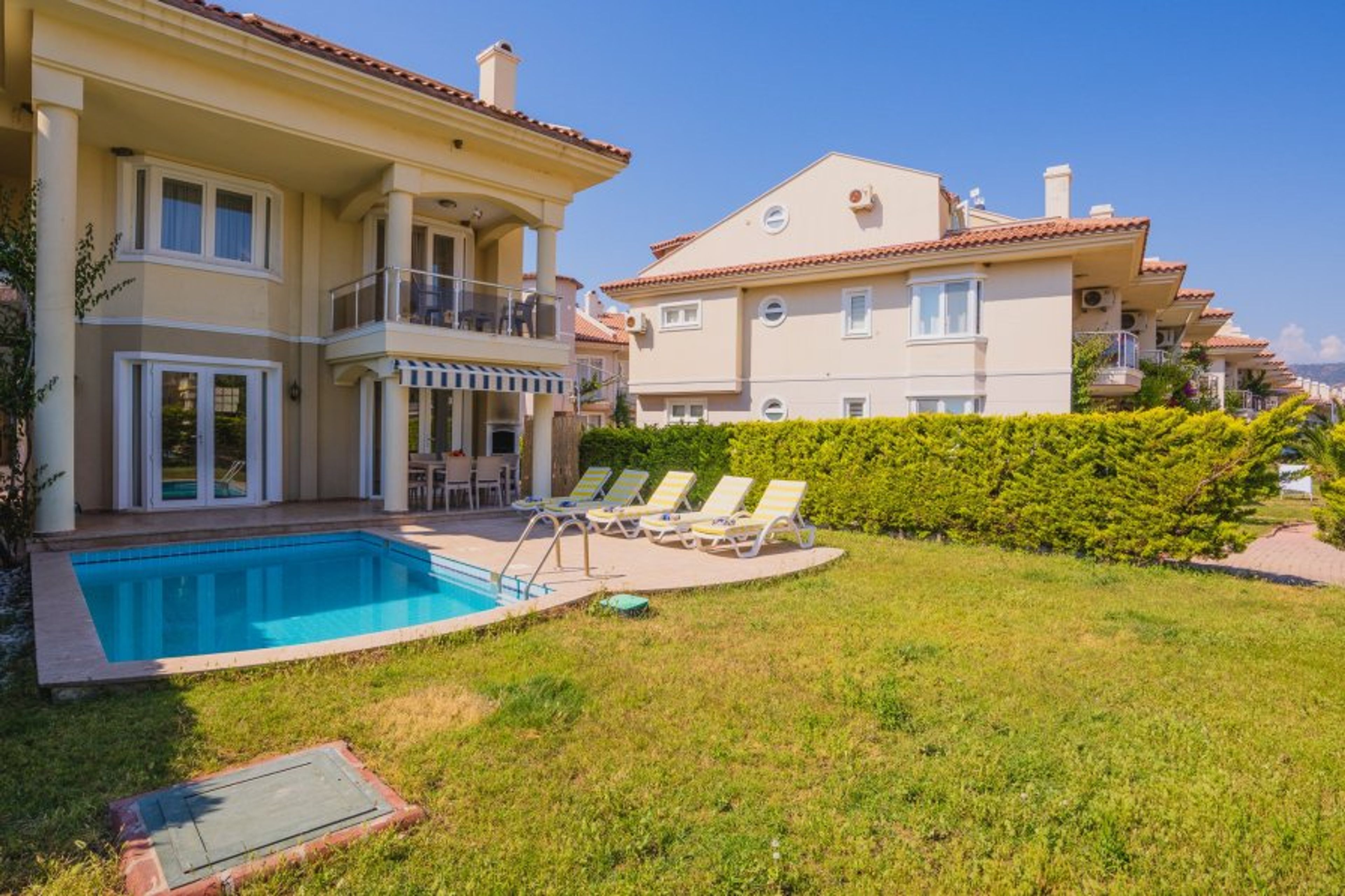 This 4 bedroomed 3 storey villa is located at Sunset Beach Club complex in Fethiye/Calis- Aqua Lettings. This fully air-conditioned villa has beautiful sea views with a private swimming pool. You can enjoy your outside dining area, equipped with a large table/ chairs, sunbeds and a BBQ. The first floor has a large balcony with a seating area perfect for relaxing in the evenings with sea views.