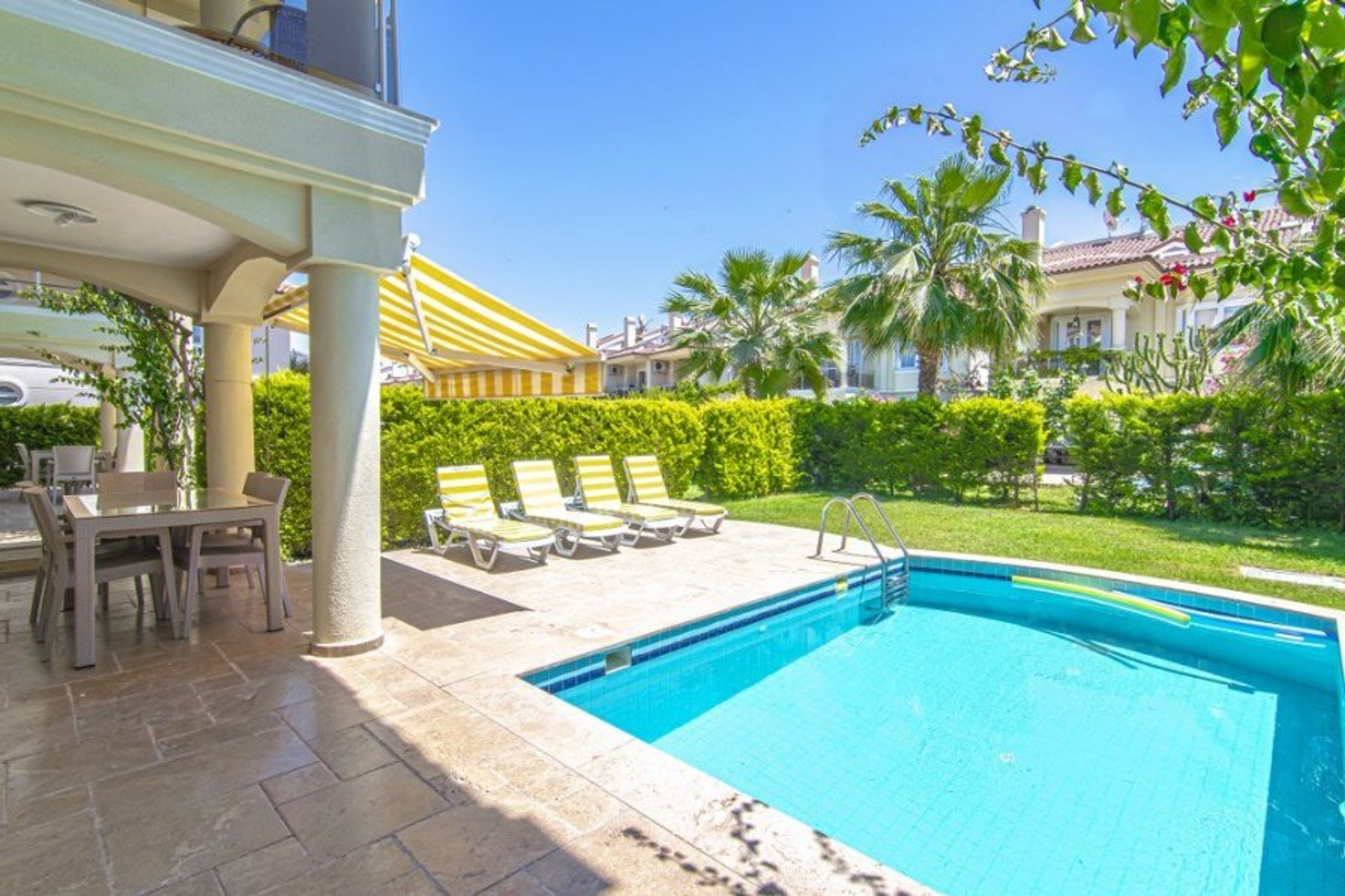 This 4 bedroomed 3 storey villa is located at Sunset Beach Club complex in Fethiye/Calis- Aqua Lettings. This fully air-conditioned villa has beautiful sea views with a private swimming pool. You can enjoy your outside dining area, equipped with a large table/ chairs, sunbeds and a BBQ. The first floor has a large balcony with a seating area perfect for relaxing in the evenings with sea views.