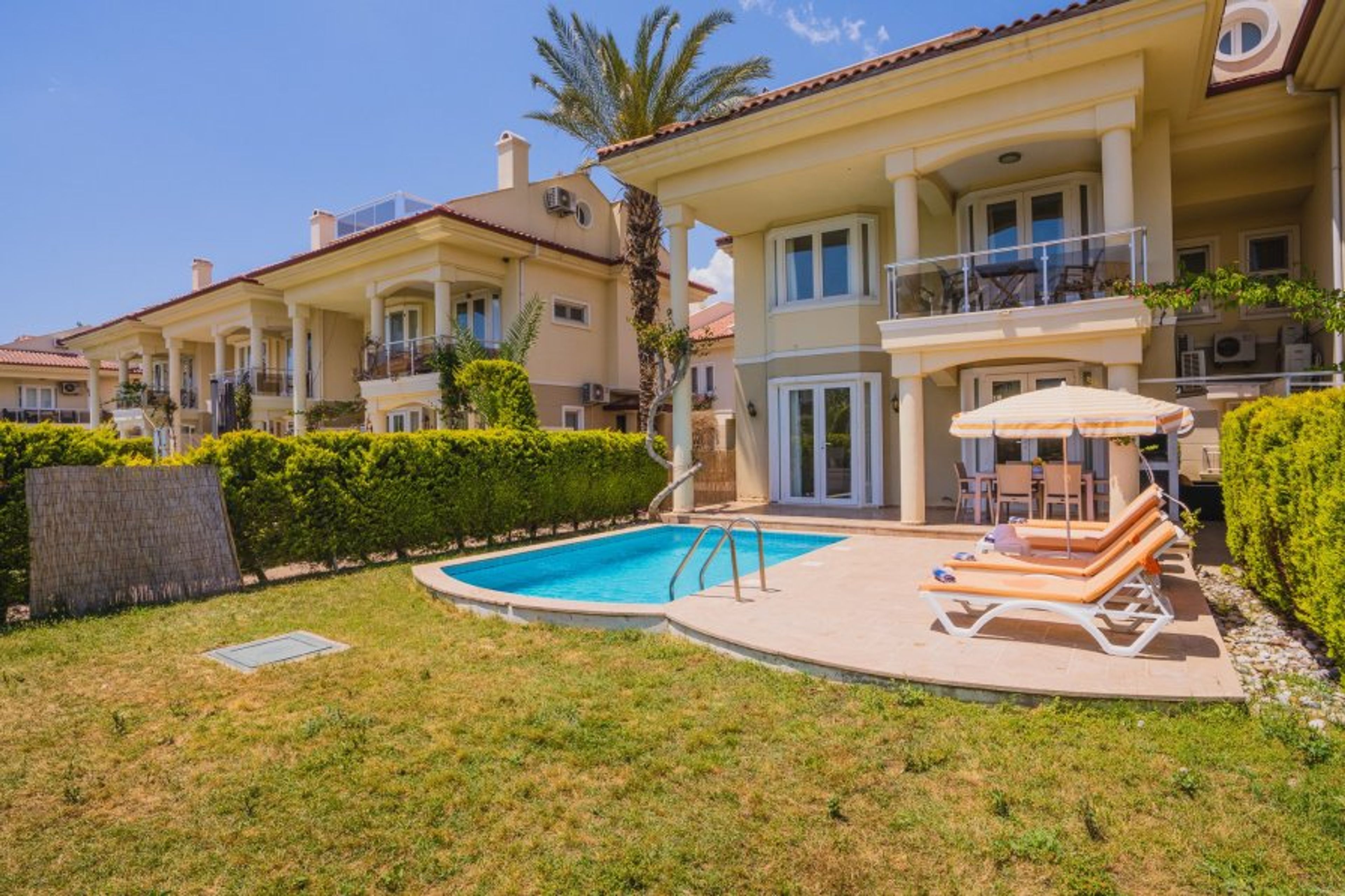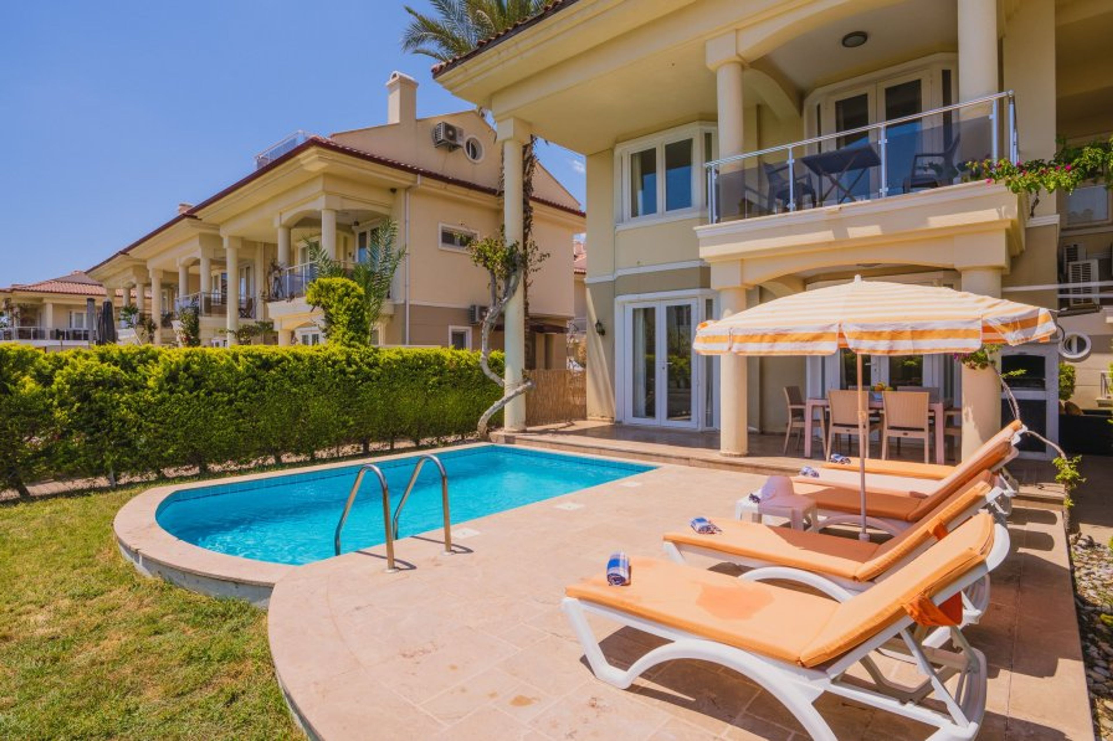 This 4 bedroomed 3 storey villa is located at Sunset Beach Club complex in Fethiye/Calis- Aqua Lettings. This fully air-conditioned villa has beautiful sea views with a private swimming pool. You can enjoy your outside dining area, equipped with a large table/ chairs, sunbeds and a BBQ. The first floor has a large balcony with a seating area perfect for relaxing in the evenings with sea views.
