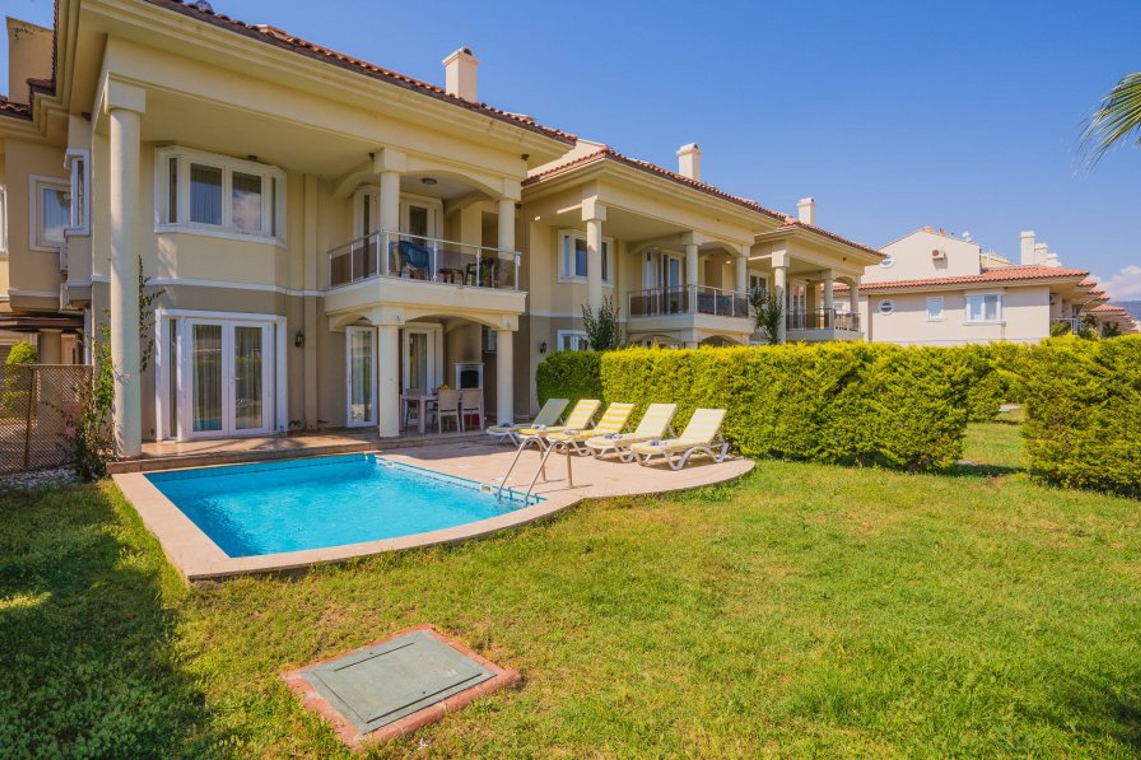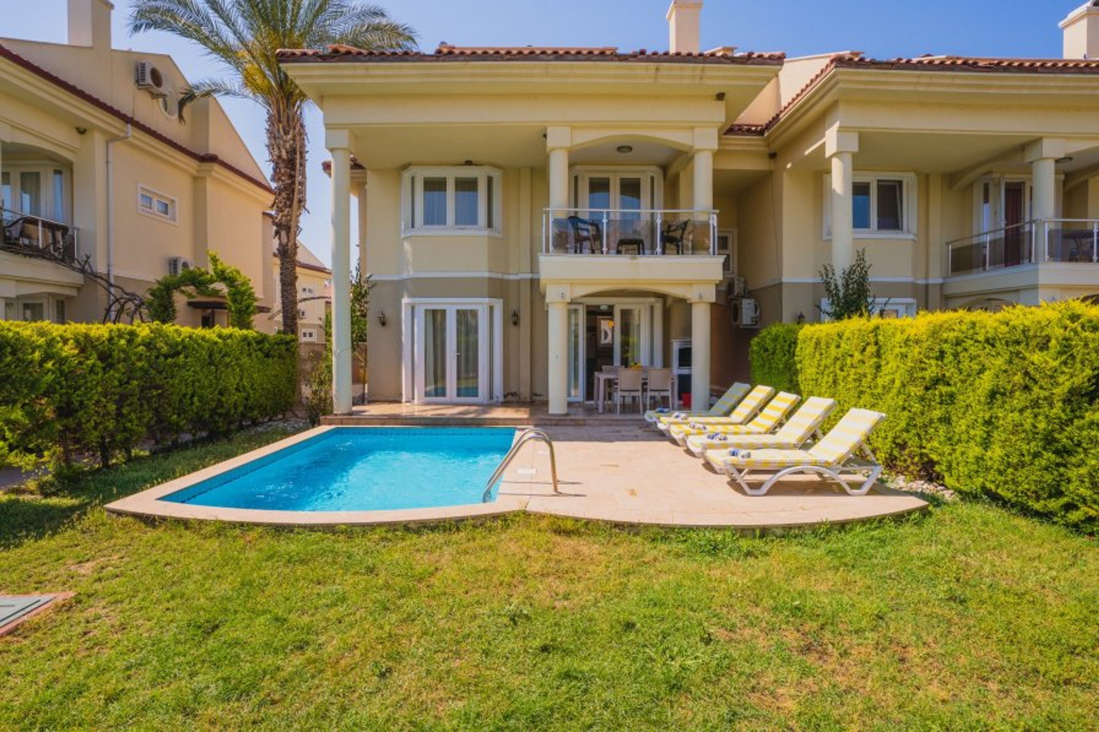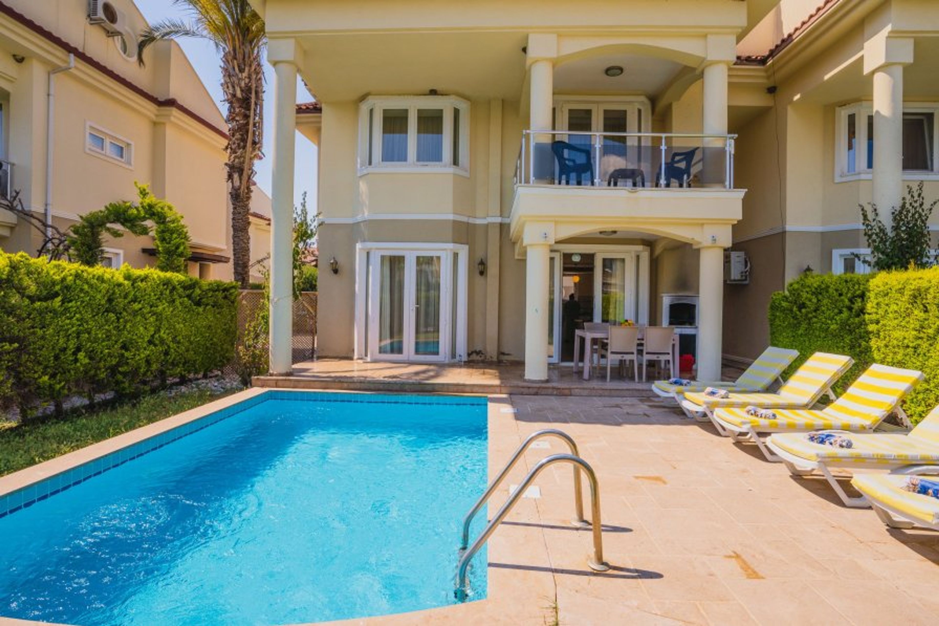 This 4 bedroomed 3 storey villa is located at Sunset Beach Club complex in Fethiye/Calis- Aqua Lettings. This fully air-conditioned villa has beautiful sea views with a private swimming pool. You can enjoy your outside dining area, equipped with a large table/ chairs, sunbeds and a BBQ. The first floor has a large balcony with a seating area perfect for relaxing in the evenings with sea views.