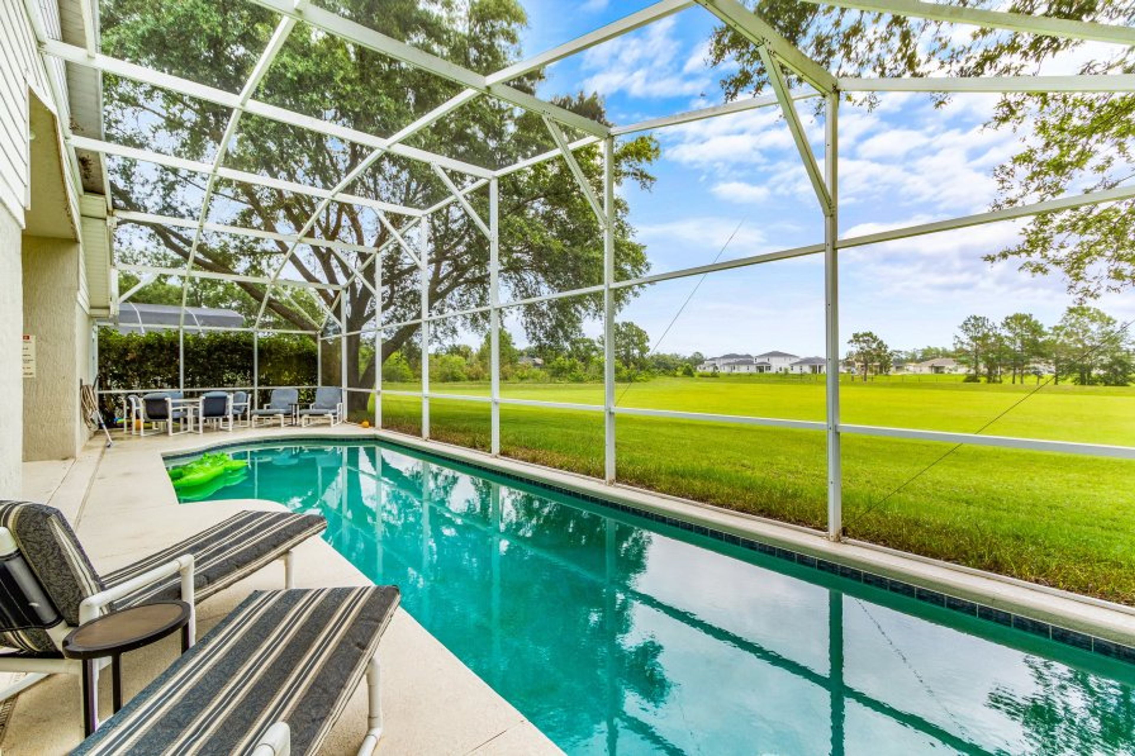 The pool area comprises a lanai, pool and deck. The undercover lanai contains a dining table with seating for 6, overhead lighting and a fan, and is accessible through both master bedrooms and the family room. Adjacent to the lanai is the pool and deck. The pool is an oversized, spacious pool at 40' x 15' (12m x 4.5m); heating for the pool can be arranged for an additional charge. The large deck backs on to a conservation area and provides an ideal place to sunbathe or just relax, and on a clear night you can catch some of the fireworks from the Magic Kingdom Theme Park at Disneyworld. On the deck is a second dining table with seating for 6 and 4 sun loungers. There is also a charcoal barbeque available for use at the side of the house.