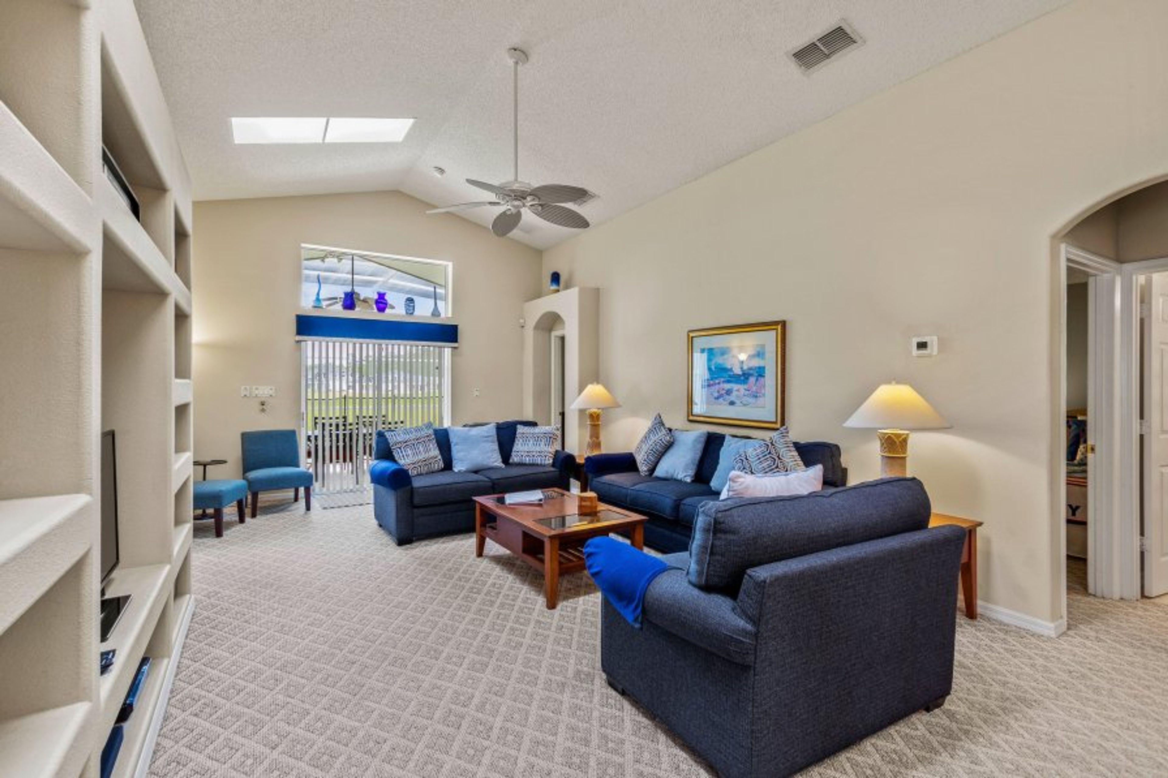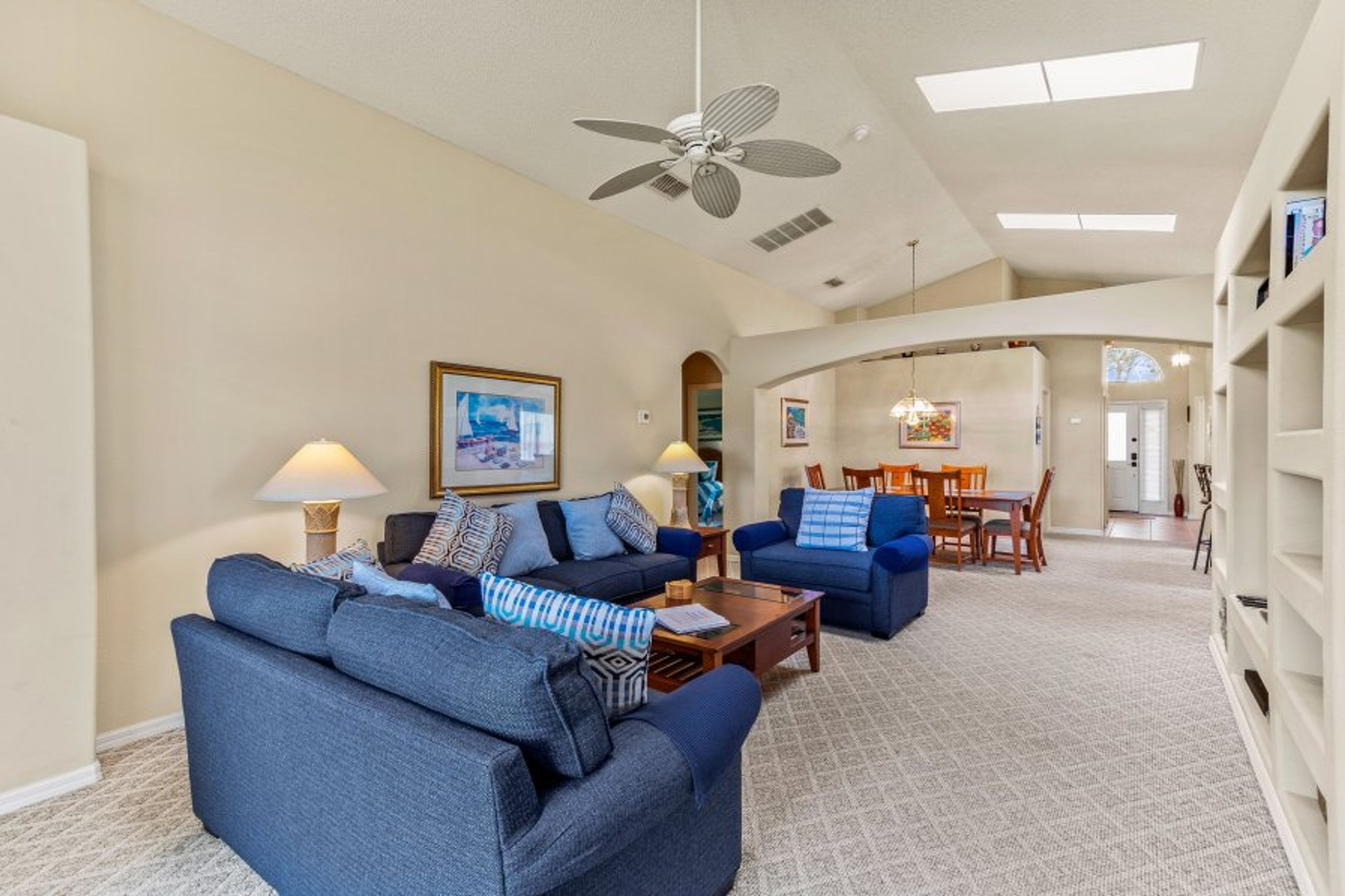 The family room is a spacious room which is equipped with cable TV. The room has access to the Lanai and pool area. Skylights provide a light and airy room in which to relax.