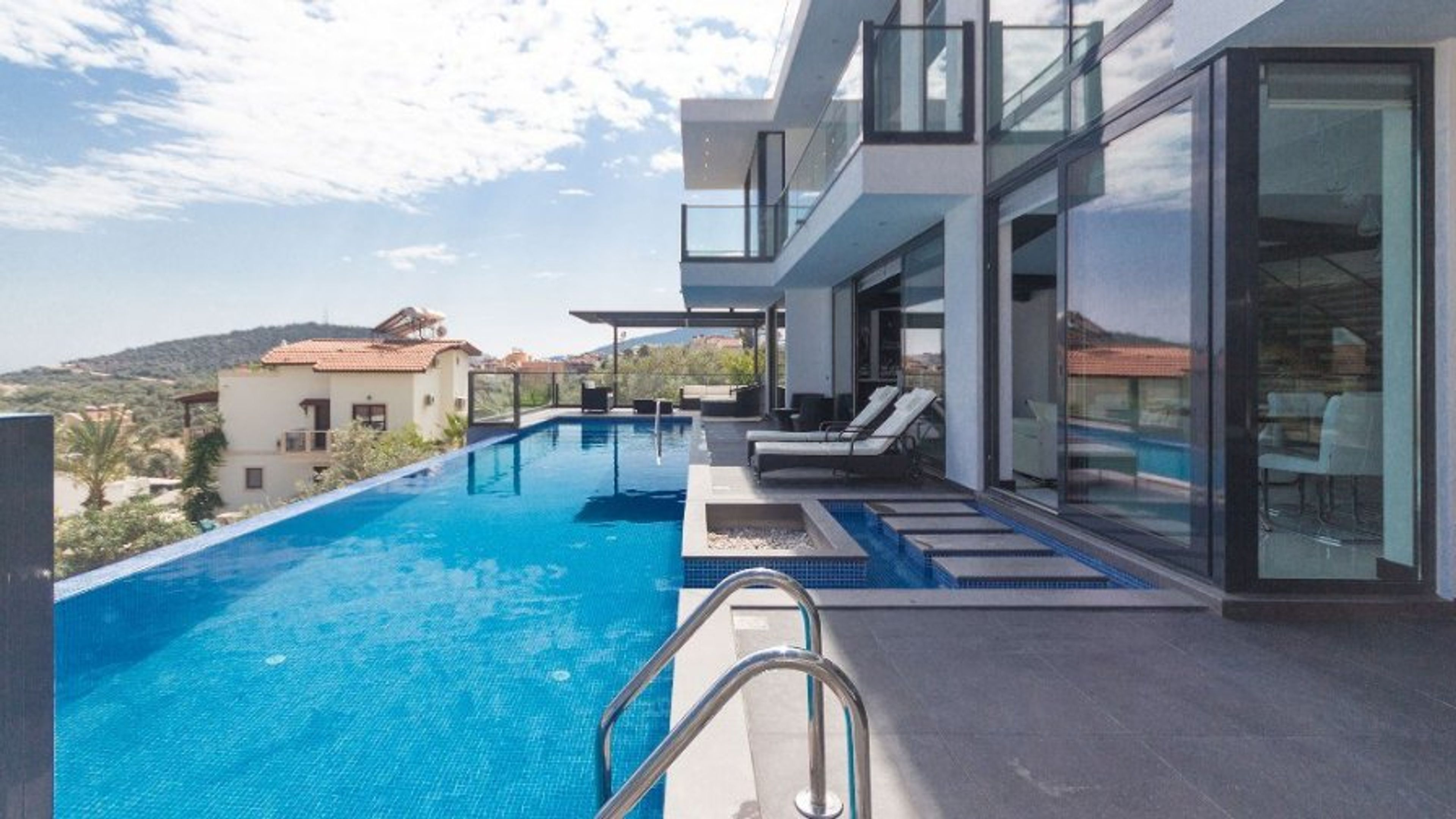 Luxury villa rental in Kalkan has unbelieveable panoramic views and beautiful private infinity luxury swimming pool, however you will want to spend much of your time outside. The pool is surrounded by a spacious patio area, equipped with sun-loungers and sun-shades. The villa is perfect for families and larger groups.