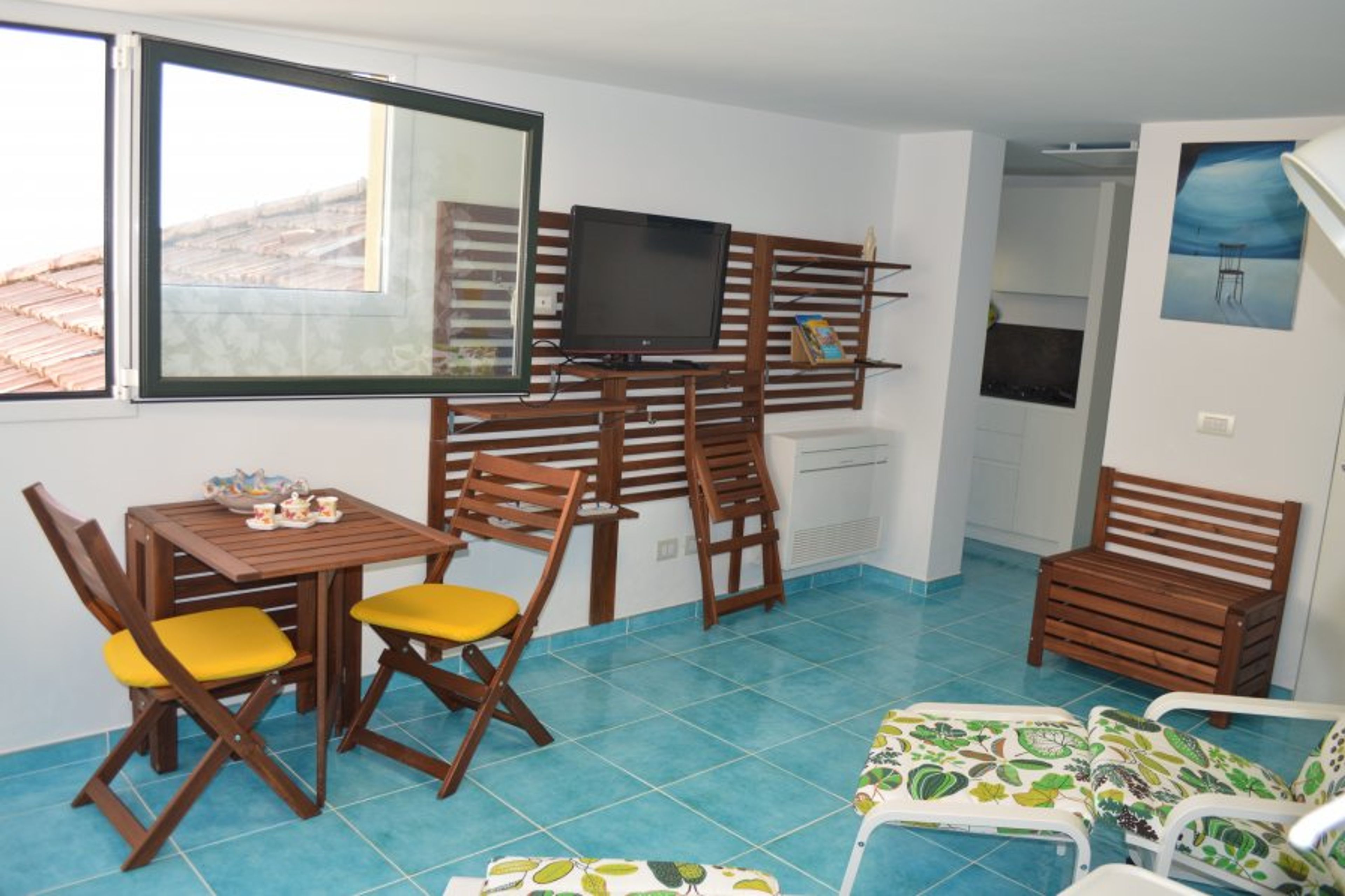The kitchen opens onto a private small terrace ( with no view ) with and external shower in a corner .The kitchen features a small size fridge, 4 burners-cooker, a microwave, an American coffee maker and all the modern appliances