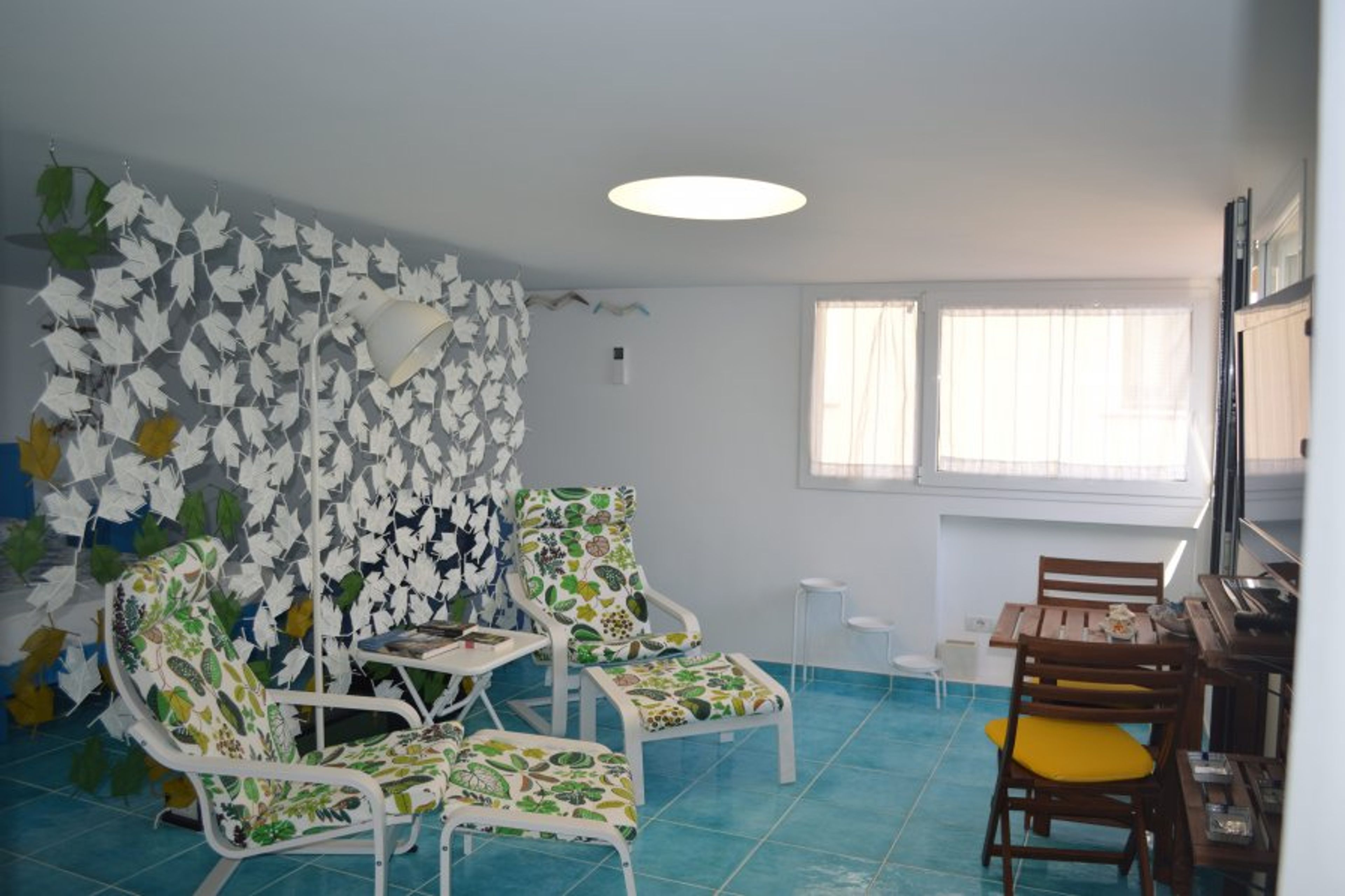 The living/dining room is an open space with a night area separated by a modern room divider made of blue and green ivy. On one side of the room, a matrimonial bed with bedsides and a window facing north; instead, the other side, equipped with a desk seating 2 people, 2 chaises lounges, a walk-in closet, an air conditioning unit, is illuminated by two large windows facing the sea.