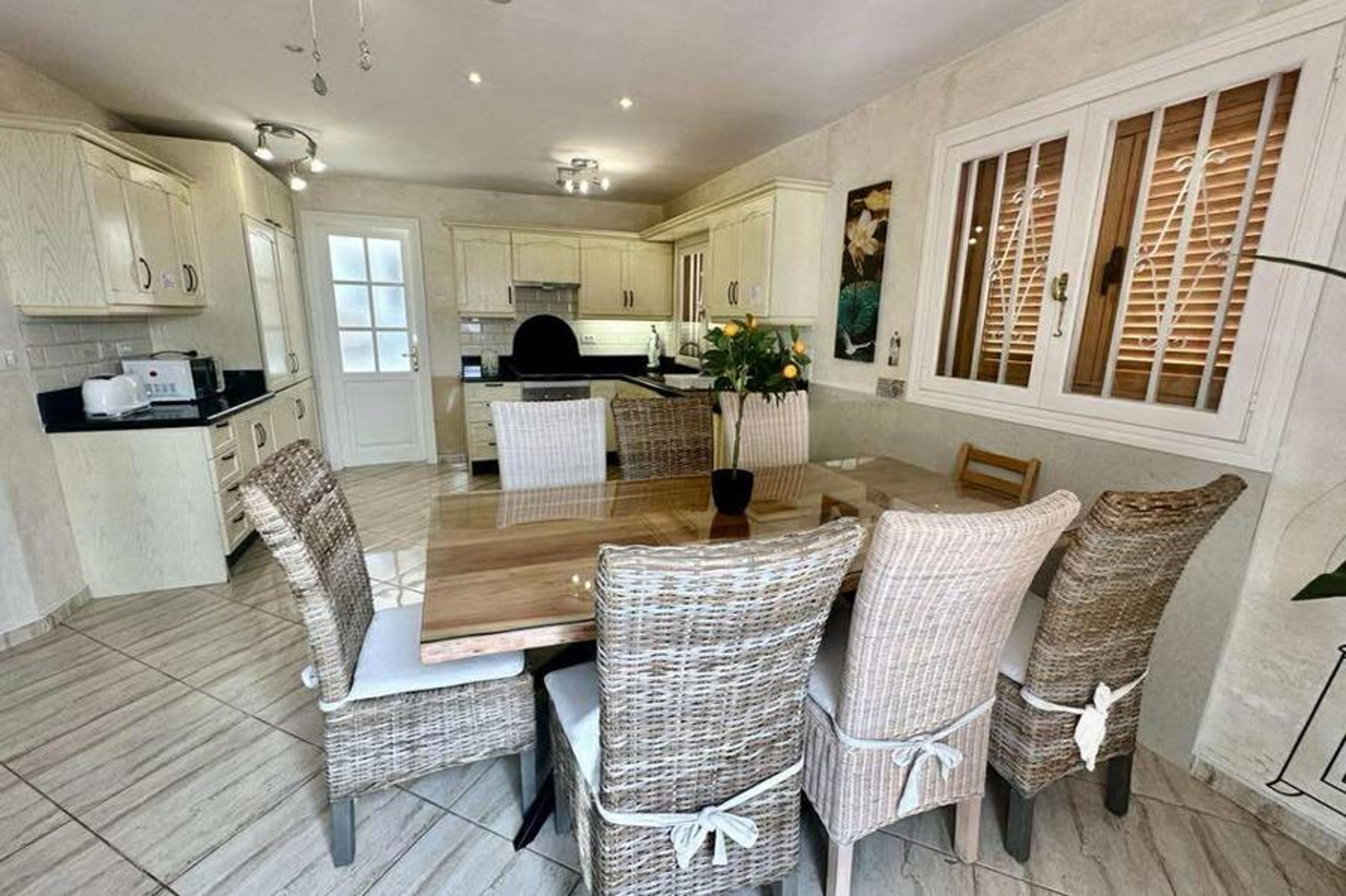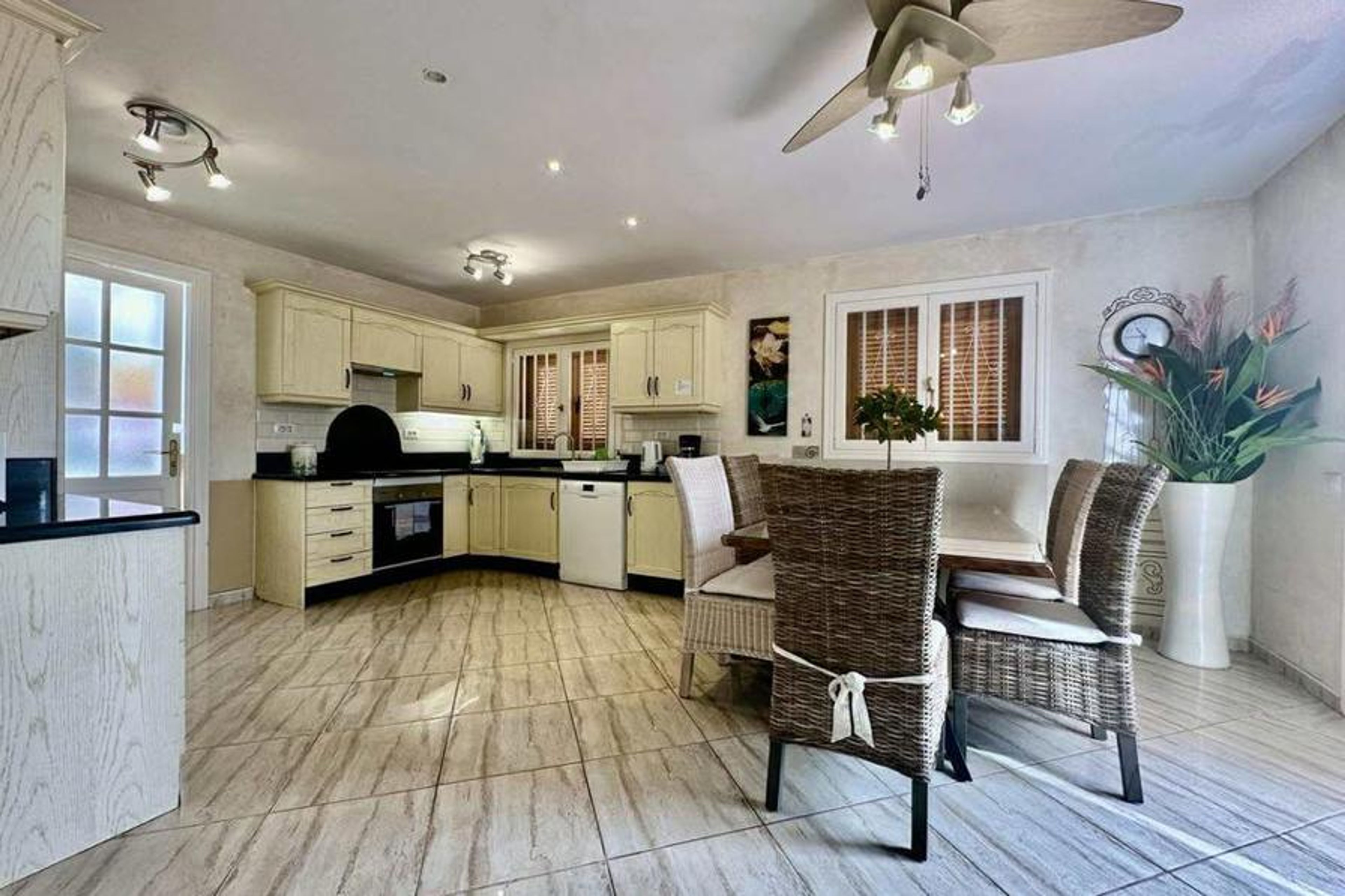 The Kitchen is fully fitted with fridge freezer, kettle, toaster, microwave, electric hob, oven and dishwasher. Open kitchen/dining area also has patio doors that lead out to the terrace. Air conditioning is in the living area and kitchen dining areas. A utility area has a washing machine and door leading to the garden.