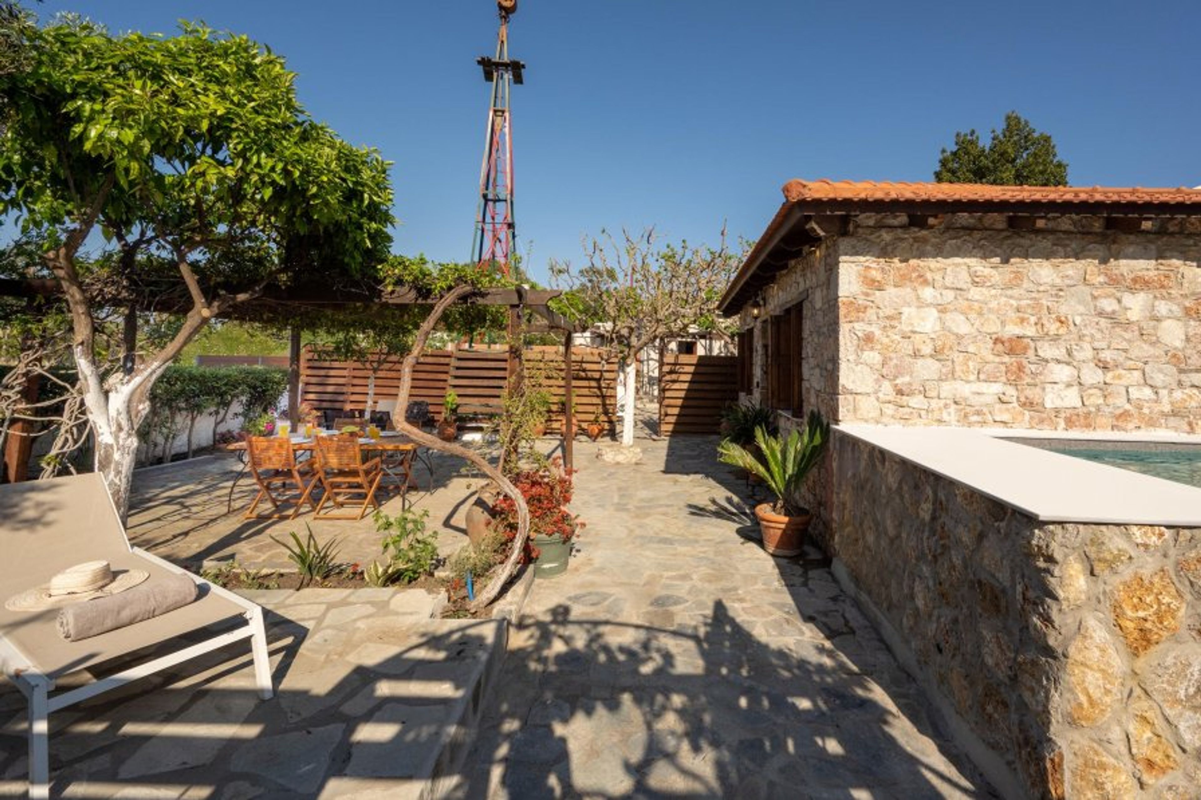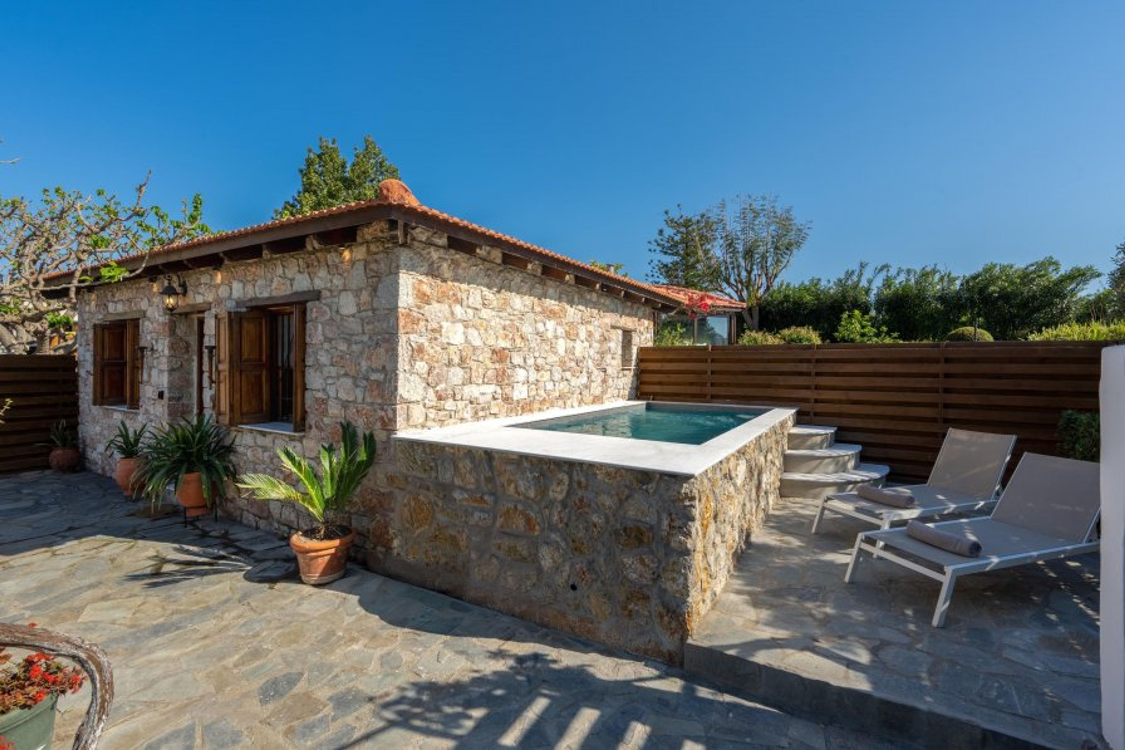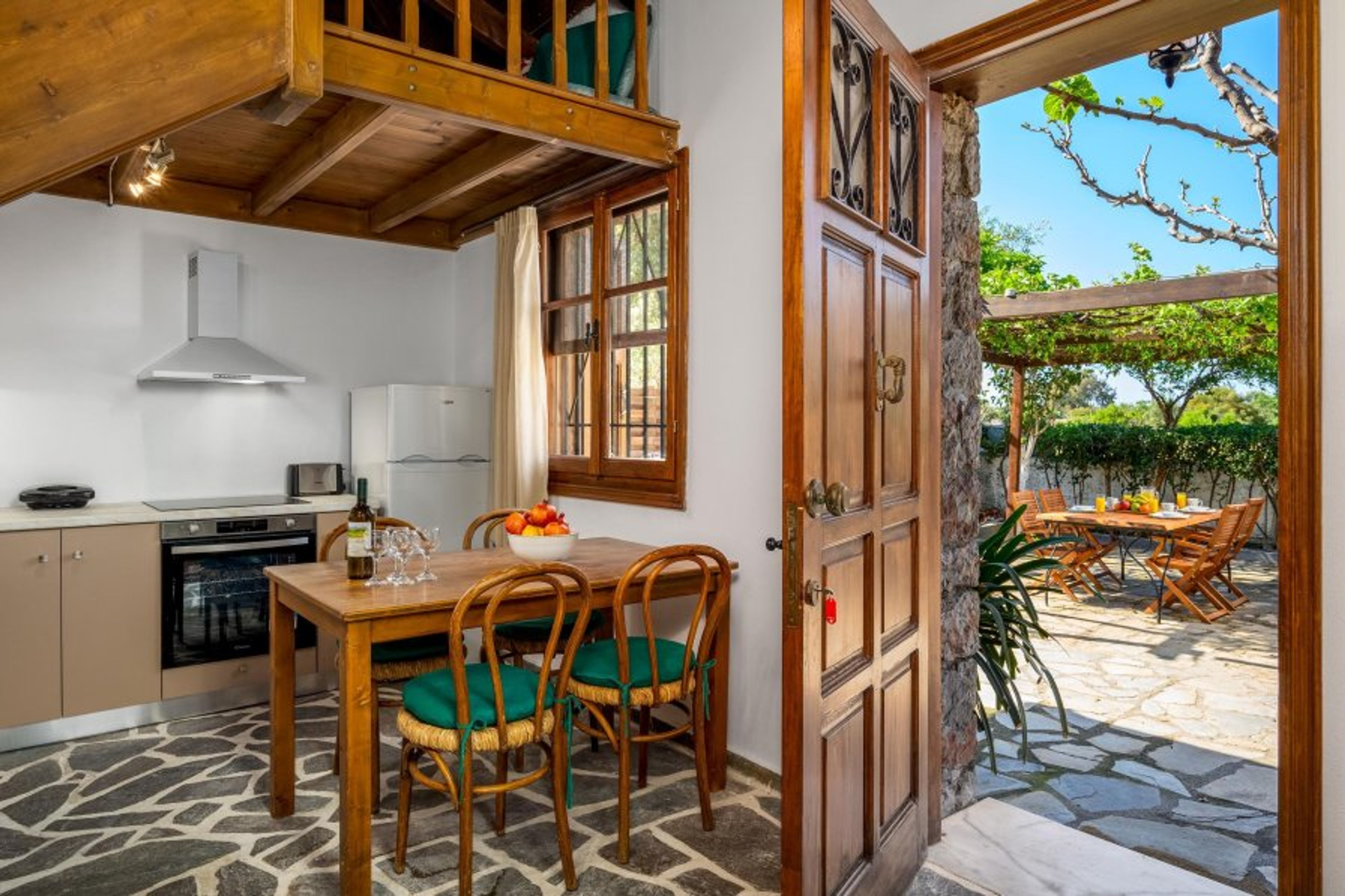 It offers 1 traditional double bed and 1 Greek traditional bed in the living room that reminds a different era and the island’s traditions. It accommodates up to 3 guests. All the areas are fully air-conditioned. Guests will find a fully equipped kitchenette with a mini electric oven and a cozy table. Everything is designed from wood and stone. Also, there’s a traditional living room and a TV with satellite channels. Guests will find a bathroom with a shower. There’s free Wi-Fi access throughout the property. Outdoors, there are BBQ facilities and an incredible dining table where you can enjoy your meal also there’s an incredible Jacuzzi for your ultimate relaxation. Next to the table, there’s a beautiful furniture set and a swing where you can relax, surrounded by beautiful gardening.