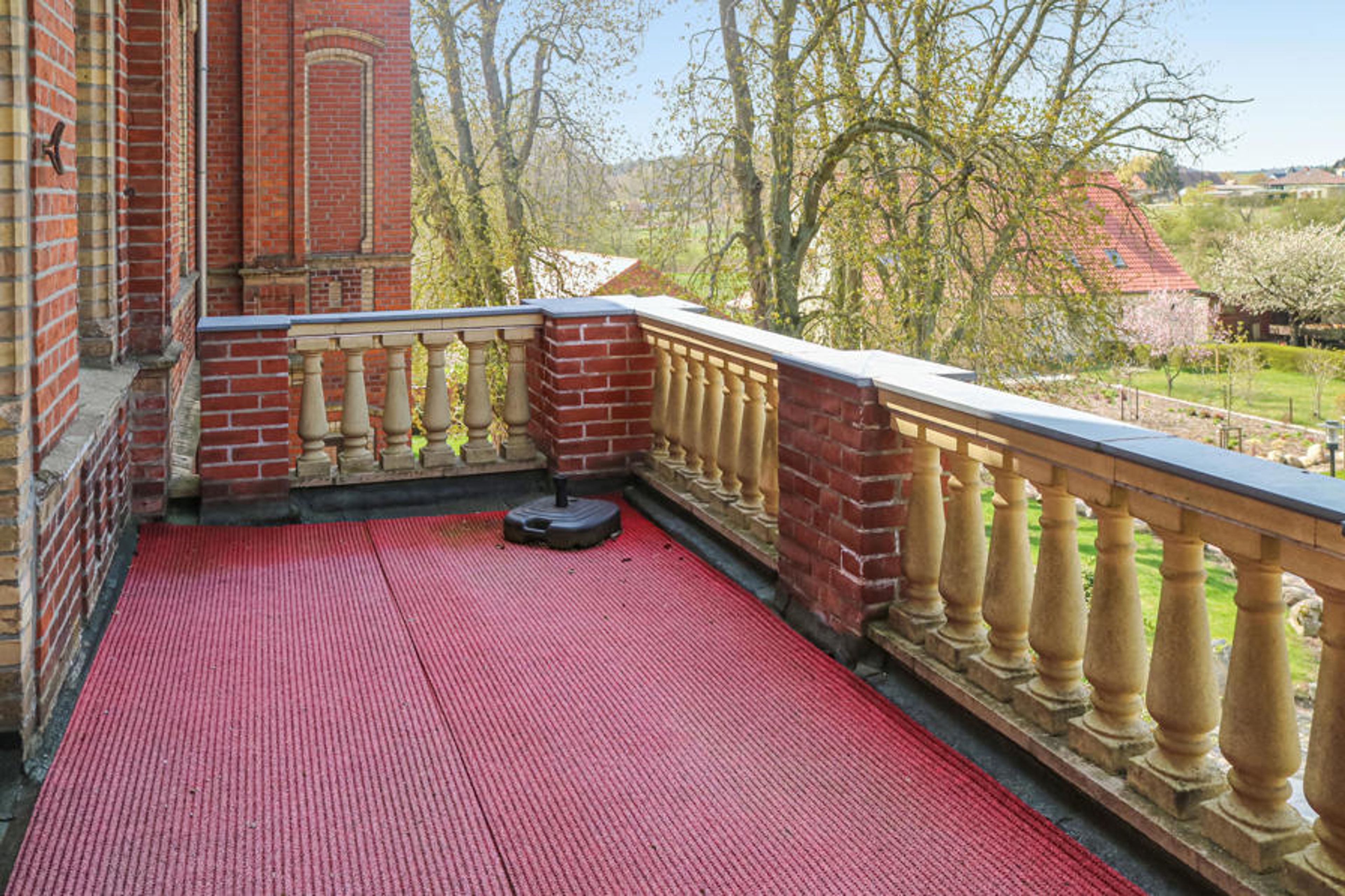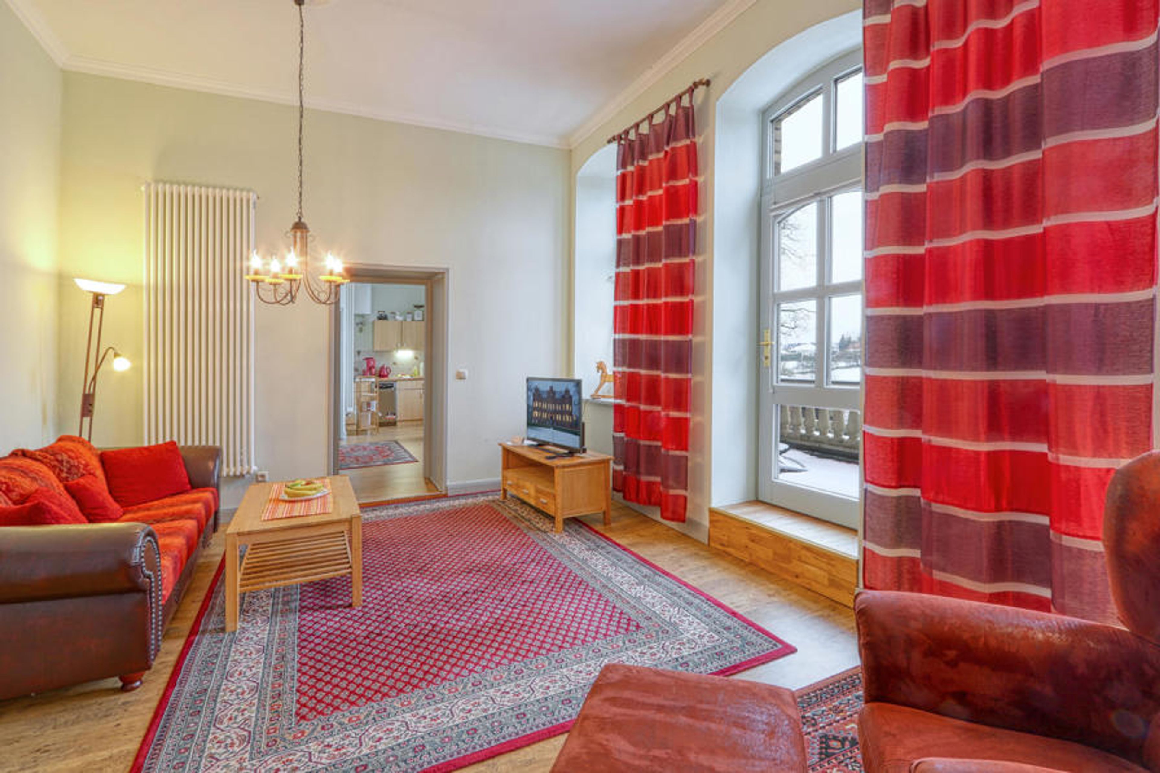 The apartment is located on the 1st floor of the castle and is ideal for a couple who would like to spend some quiet vacation days in beautiful nature. Here you will have a bedroom with a double bed, a bathroom, a living room and a kitchen at your disposal. After a long walk in nature, the cozy living area with fireplace and TV invites you to spend a relaxing evening on the sofa. From the terrace you have a beautiful view of the castle grounds.