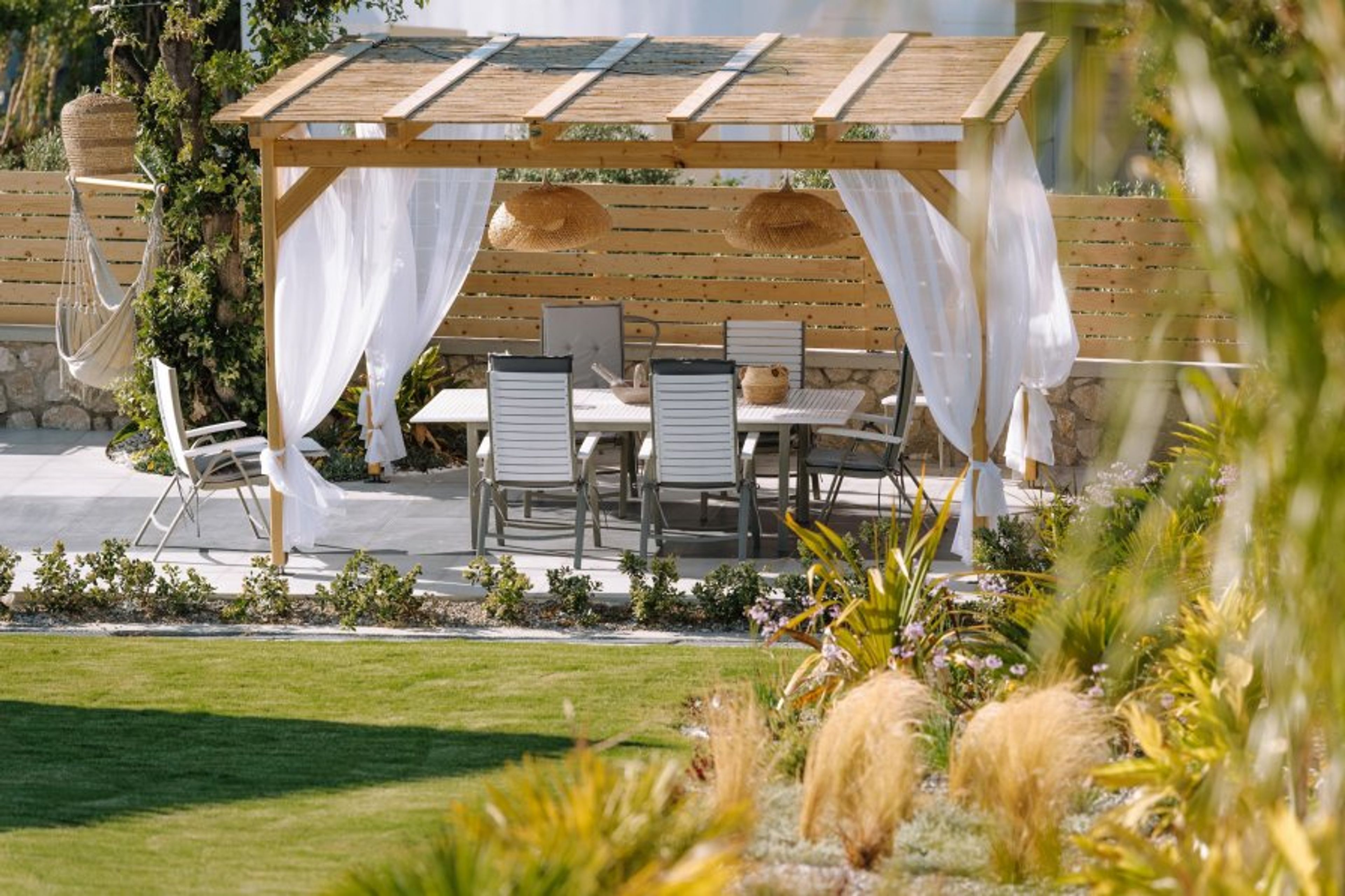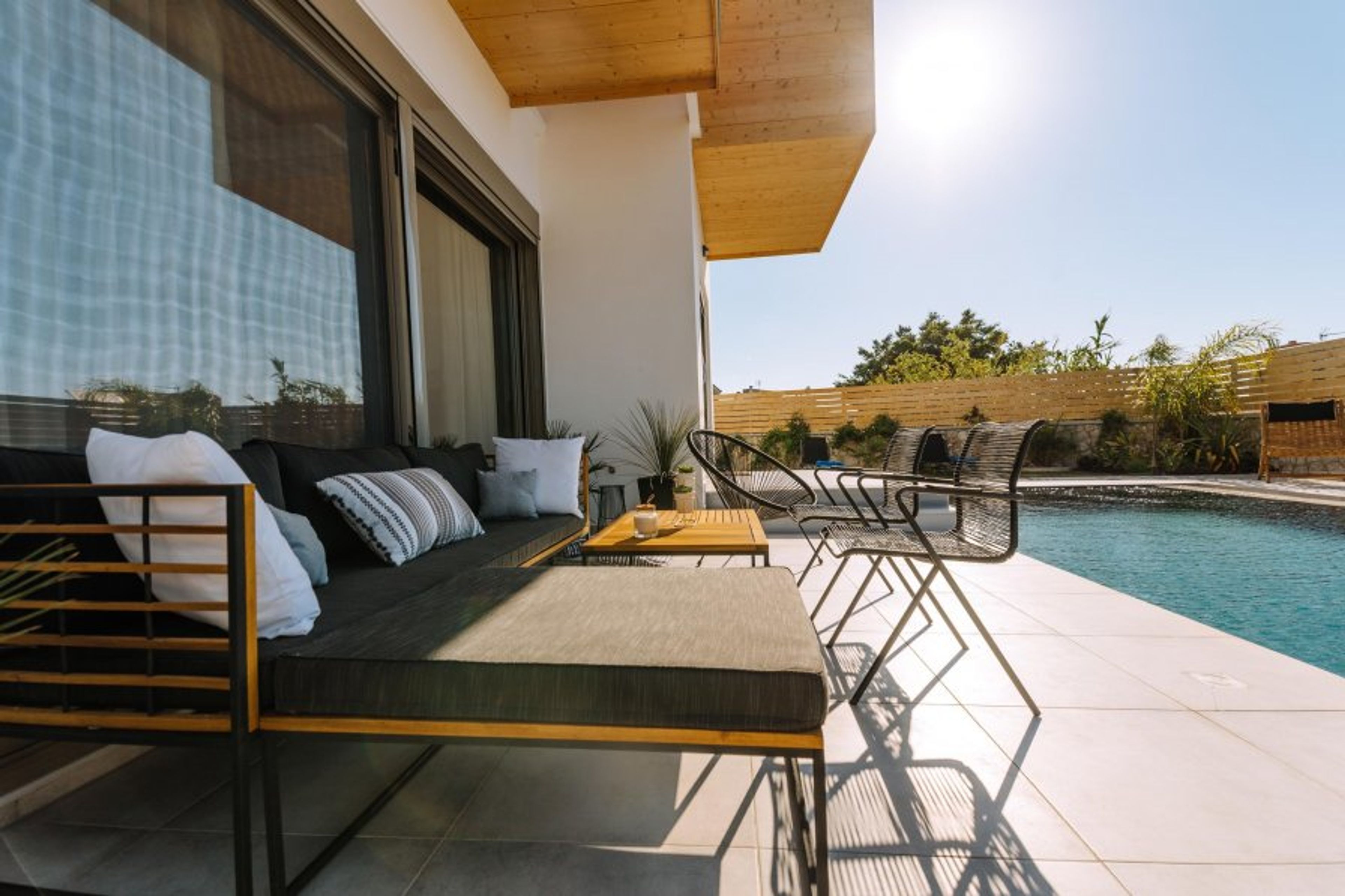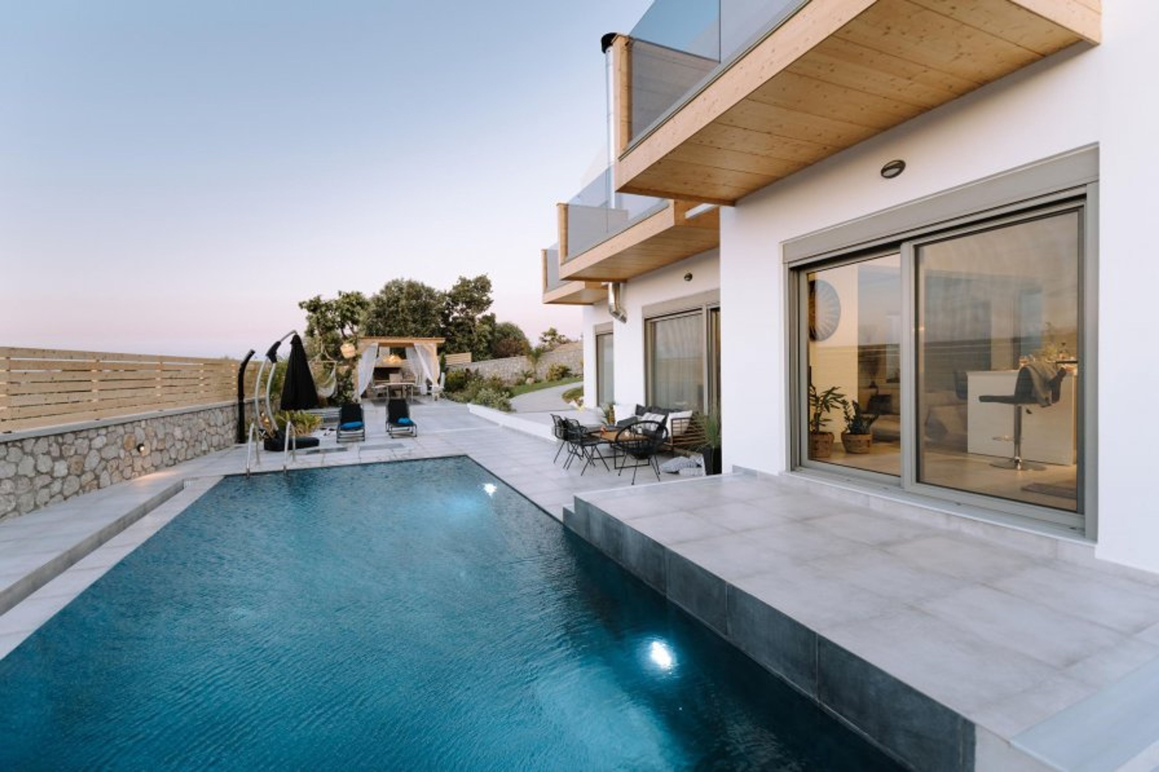 This amazing villa has 3 fully air-conditioned bedrooms, all of them with double beds and smart TVs. Two of the bedrooms have balconies. There’s a single sofa bed in the living room. One of the bedrooms includes an ensuite luxurious bathroom with a shower and a balcony with a view to Ialysos. There are 3 bathrooms in total, with showers. All areas of the villa are fully airconditioned. Also, There’s an open plan huge kitchen which is fully equipped and suitable for any meal preparation. At the same area you will find the sitting areas of the kitchen along with an incredibly cozy living room in soothing tones of grey and exotic colors. There’s a smart TV and free Wi-Fi access throughout the property.Outdoors, there’s the dreamy private swimming pool with its sunbeds as well as a heated private jacuzzi where you can relax and work on your tan under the rays of the Aegean Sun . Of course, the beach is right about a 5-minute drive from the house so you can easily spend your time there. Also, there’s a BBQ installation along with a sitting area to enjoy a gathering with your friends or family under the starry sky!