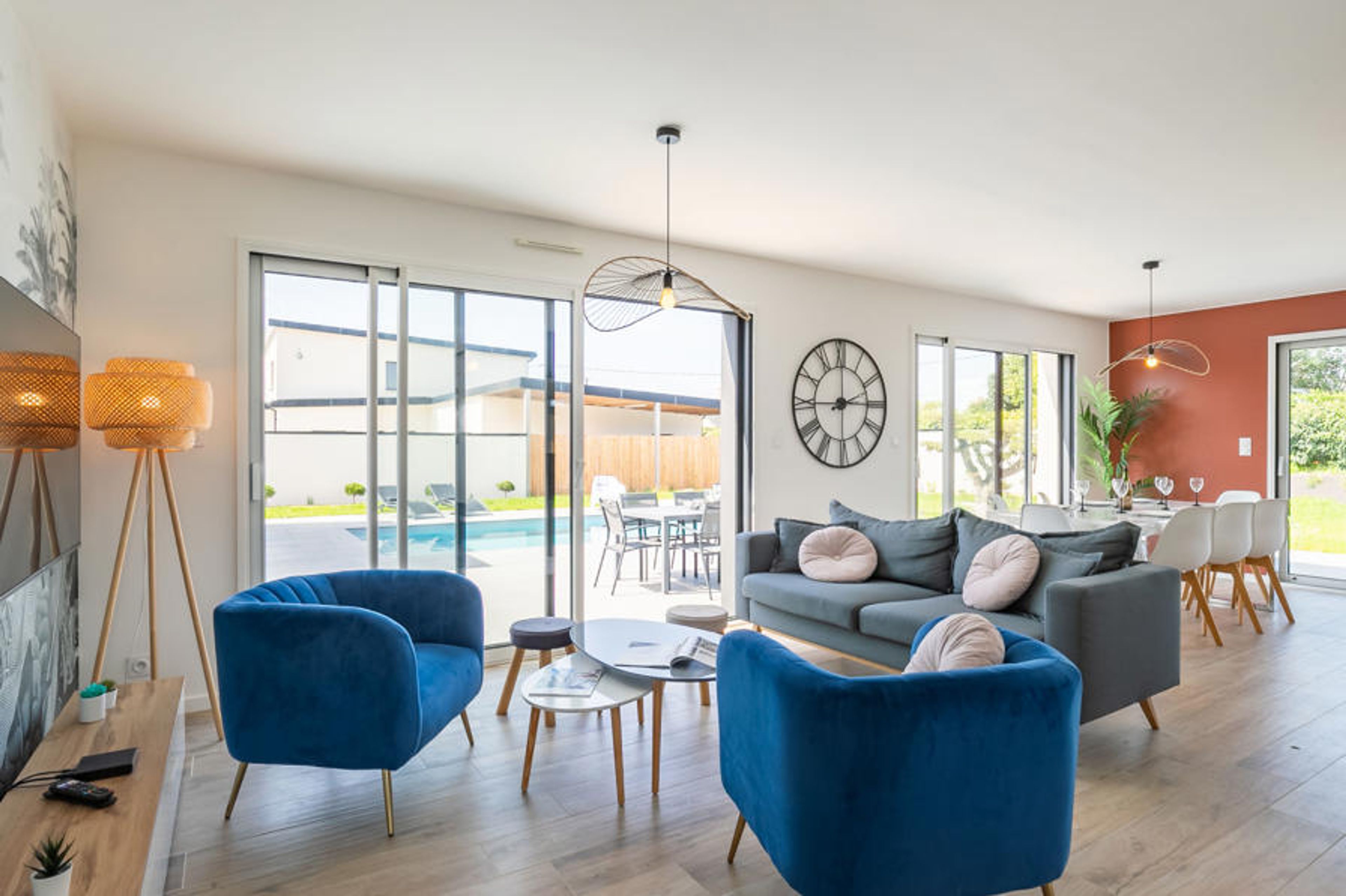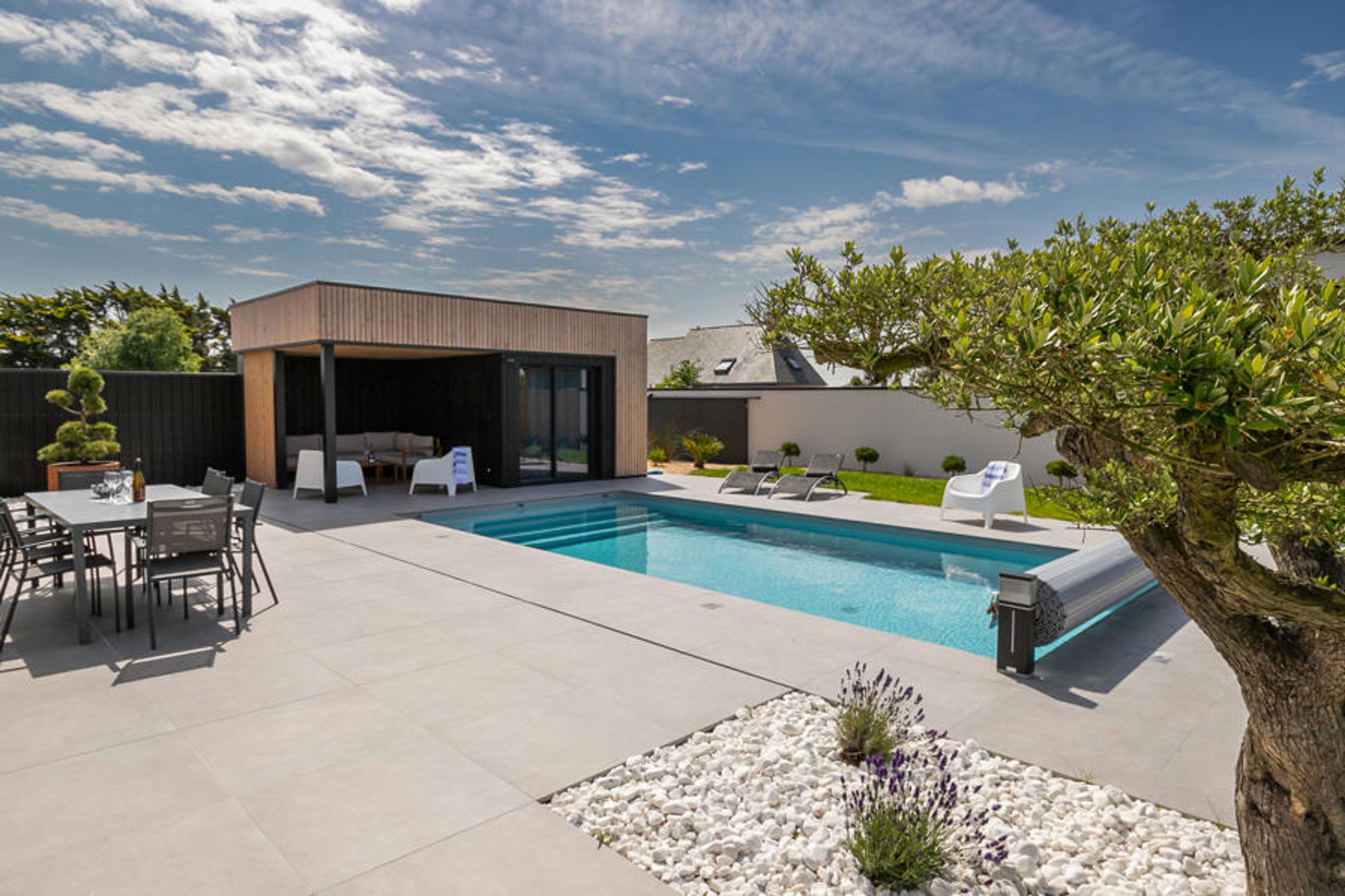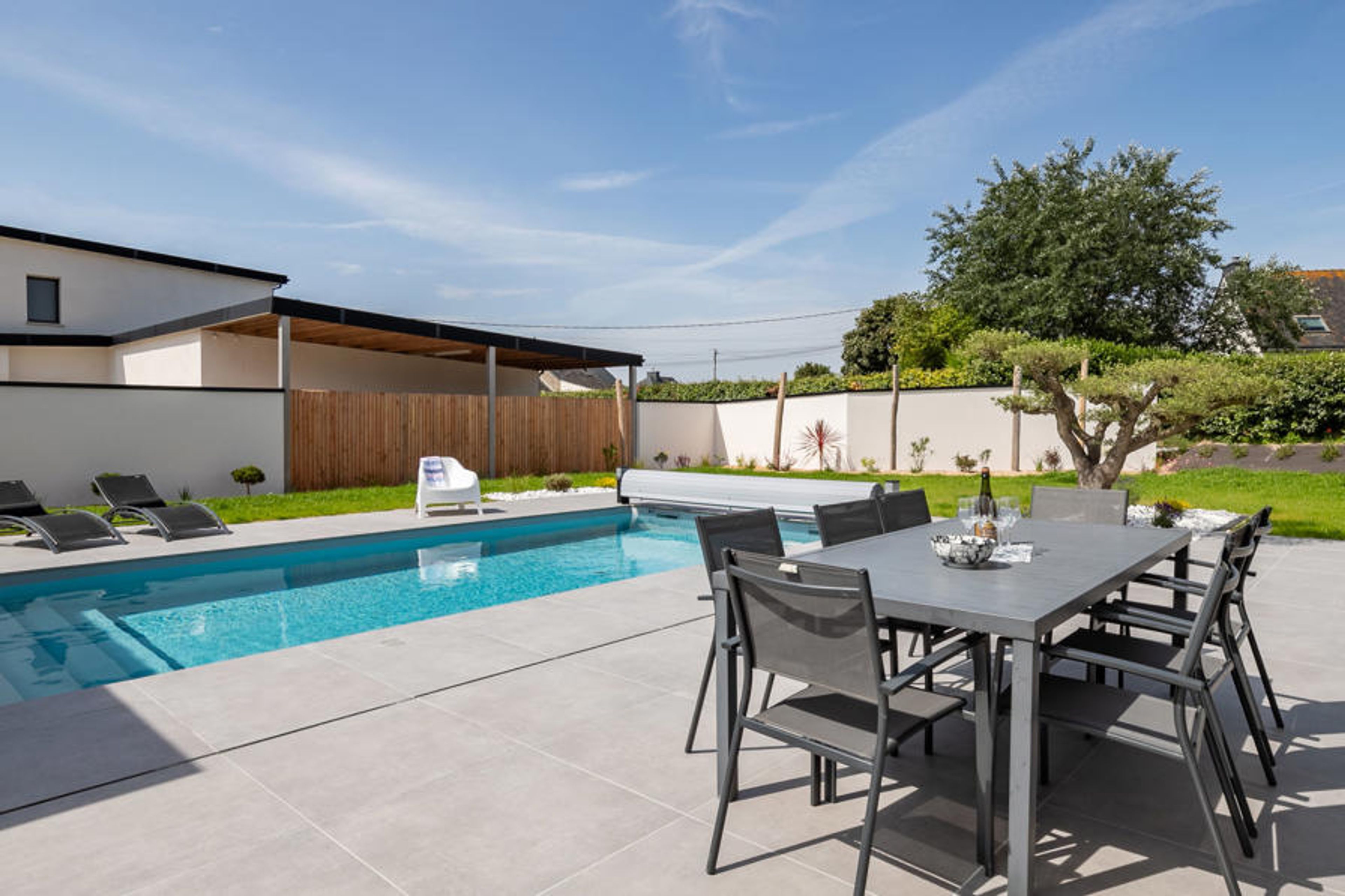 Modern, beautiful single-family house "Villa Ty Coz". In the district of Kerfissien 6 km from the centre of Cléder, in a quiet position in the residential district, 400 m from the sea, 400 m from the beach. Private: property 1'300 m2, garden with lawn and wildlife garden, swimming pool angular, heated (4 x 8 m, 32 m2, depth 150 cm, seasonal availability: 01.May. and 30.Sep.) with shutter cover. Outdoor shower, boules, parking (for 2 cars). Shop 5 km, supermarket 7 km, restaurant 5 km, bakery 5 km, café 300 m, bus stop 3.8 km, sandy beach "Les Amiets" 1 km. Golf course (9 hole) 4.5 km, surf school 7 km, sailing school 2.2 km, walking paths from the house 300 m. Nearby attractions: Roscoff et le jardin exotique 20 km, Morlaix 35 km, Château de Kerjean 15 km, Réserve ornithologique 15 km, Oceanopolis Brest 55 km. Hiking paths: GR34, sentier des douaniers 300 m.