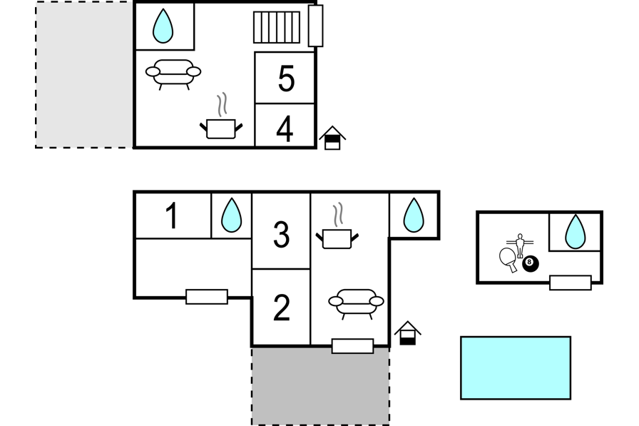 This holiday home consists of 3 connected accommodation units. It is ideal for families or a group of friends who want to spend a holiday together but still have enough privacy. The living space is divided into five bedrooms and four bathrooms as well as several living rooms with kitchens and an activity room in the annex. The house is equipped with all the necessary appliances and is air-conditioned.