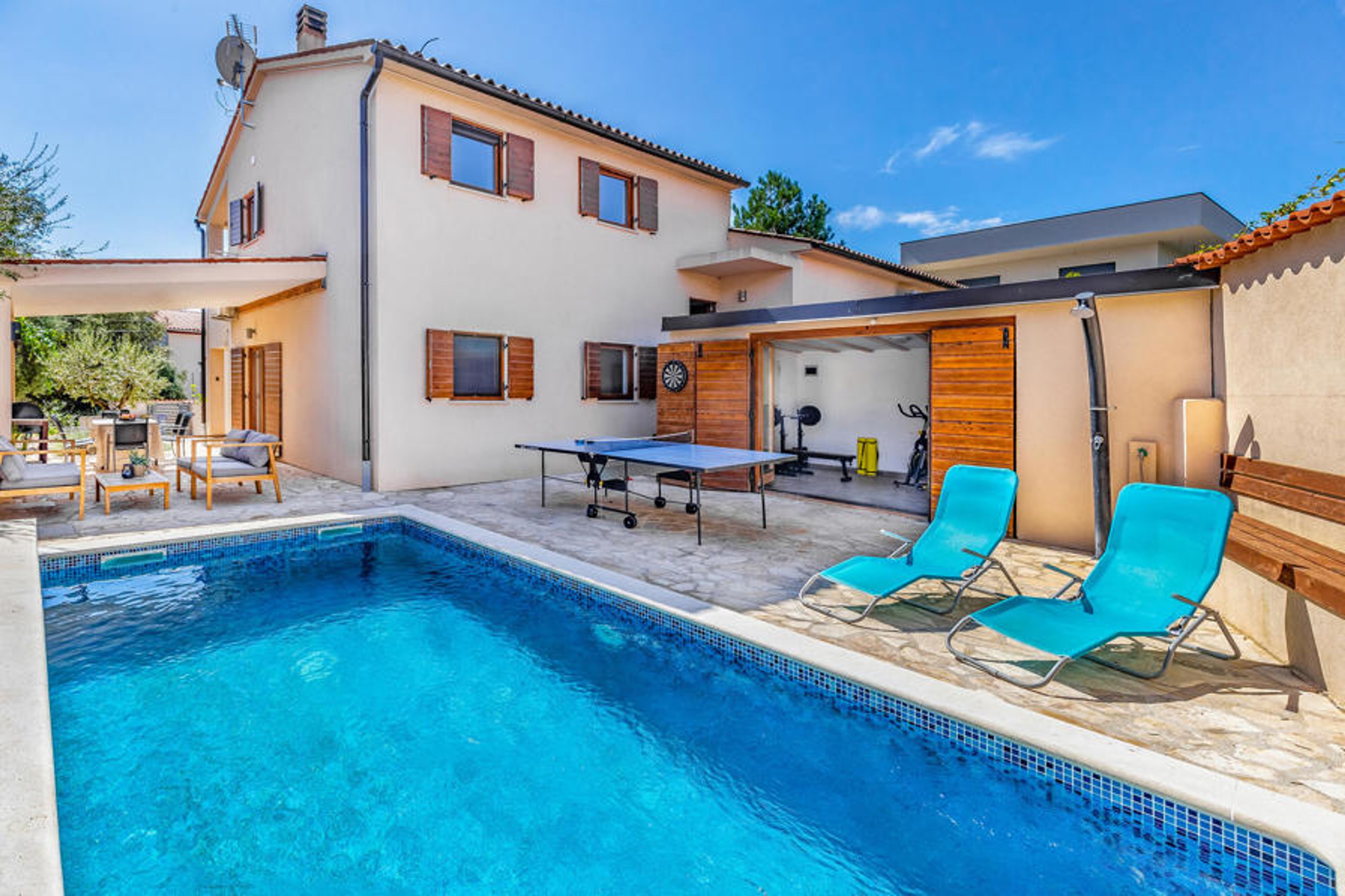 The covered terrace is ideal for socialising by the pool, where you can relax and enjoy the sun. There is also a barbecue on the terrace, so nothing stands in the way of relaxed barbecue evenings. Next to the pool there is a separate facility with a bathroom and washing machine as well as exercise equipment. There is also a table tennis table for active holidaymakers.
